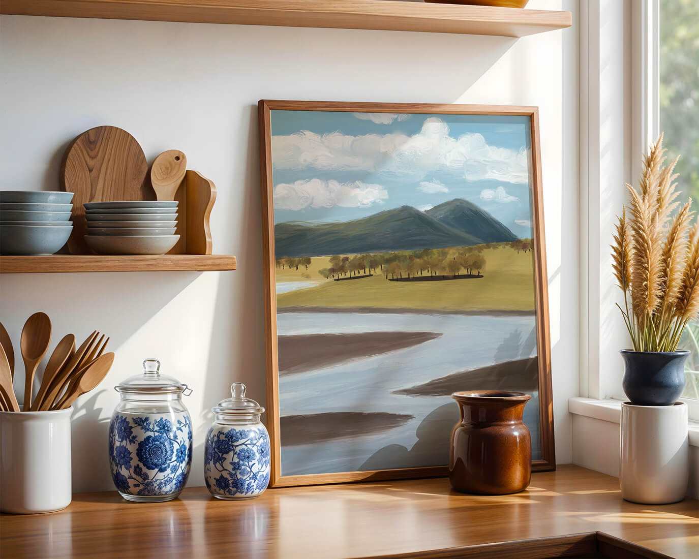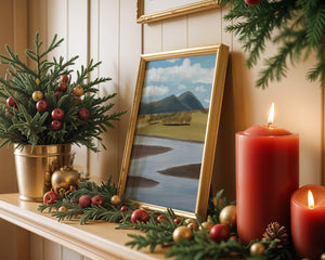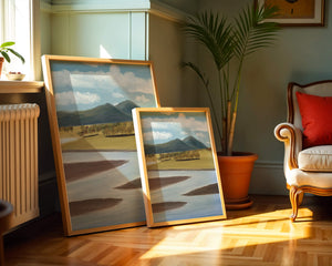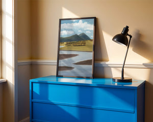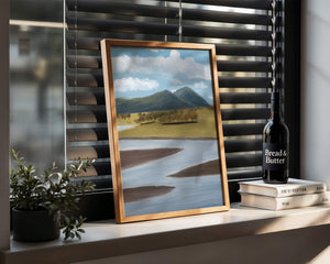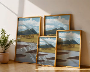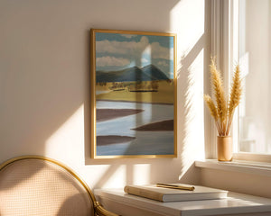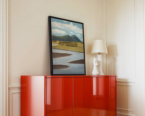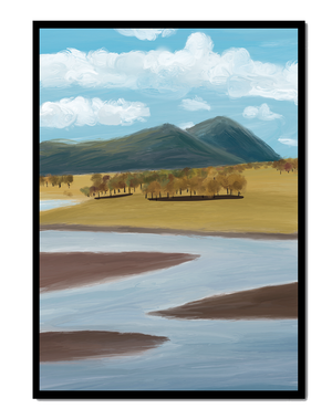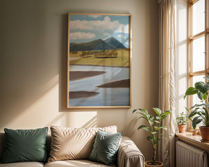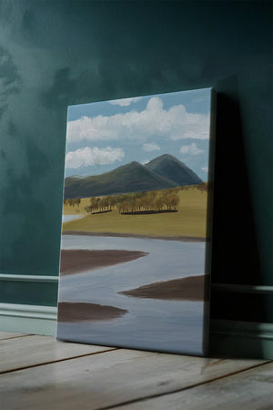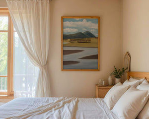 Cette œuvre d'art capture un paysage serein mettant en scène une rivière serpentant à travers des champs vibrants sous de majestueuses montagnes.