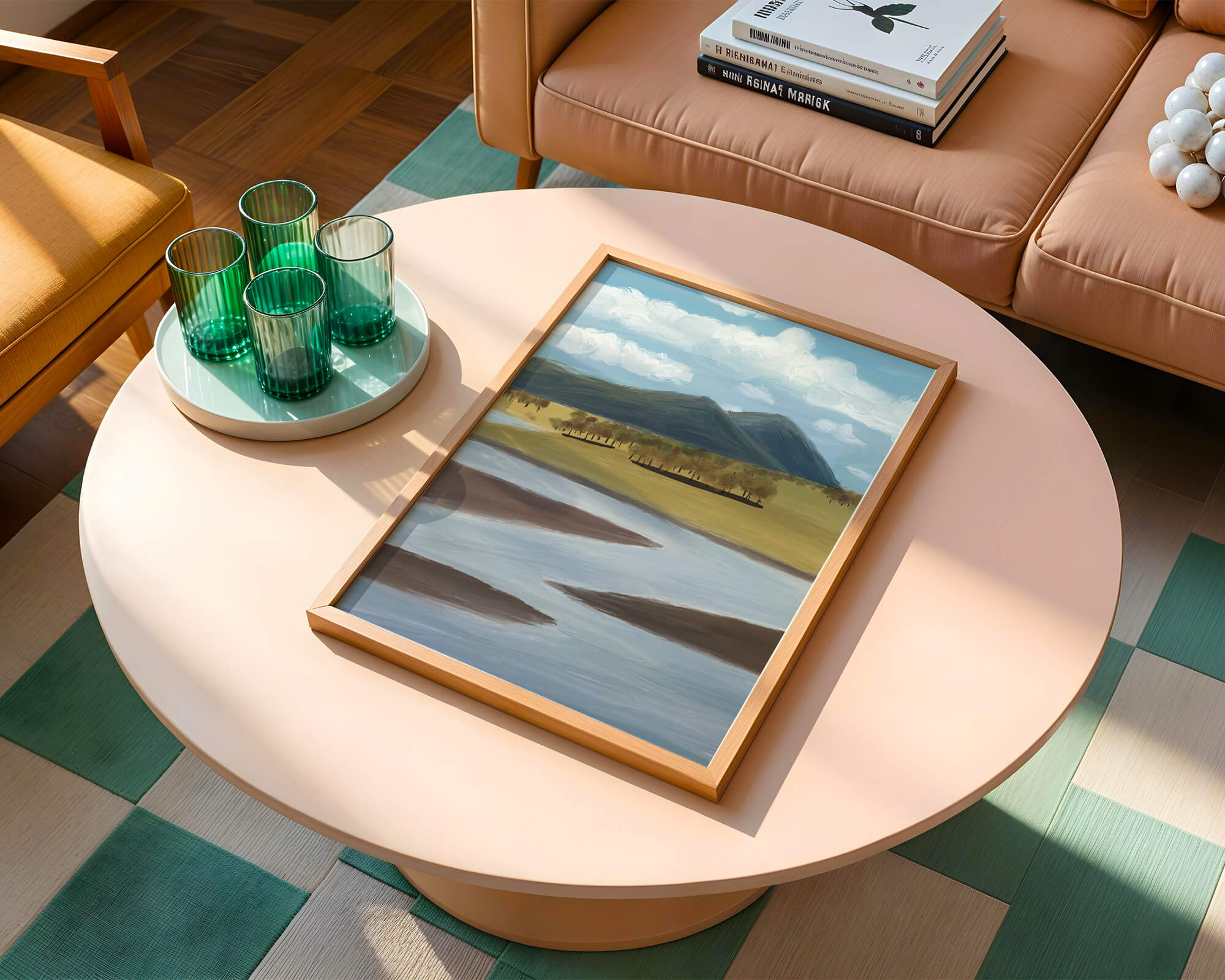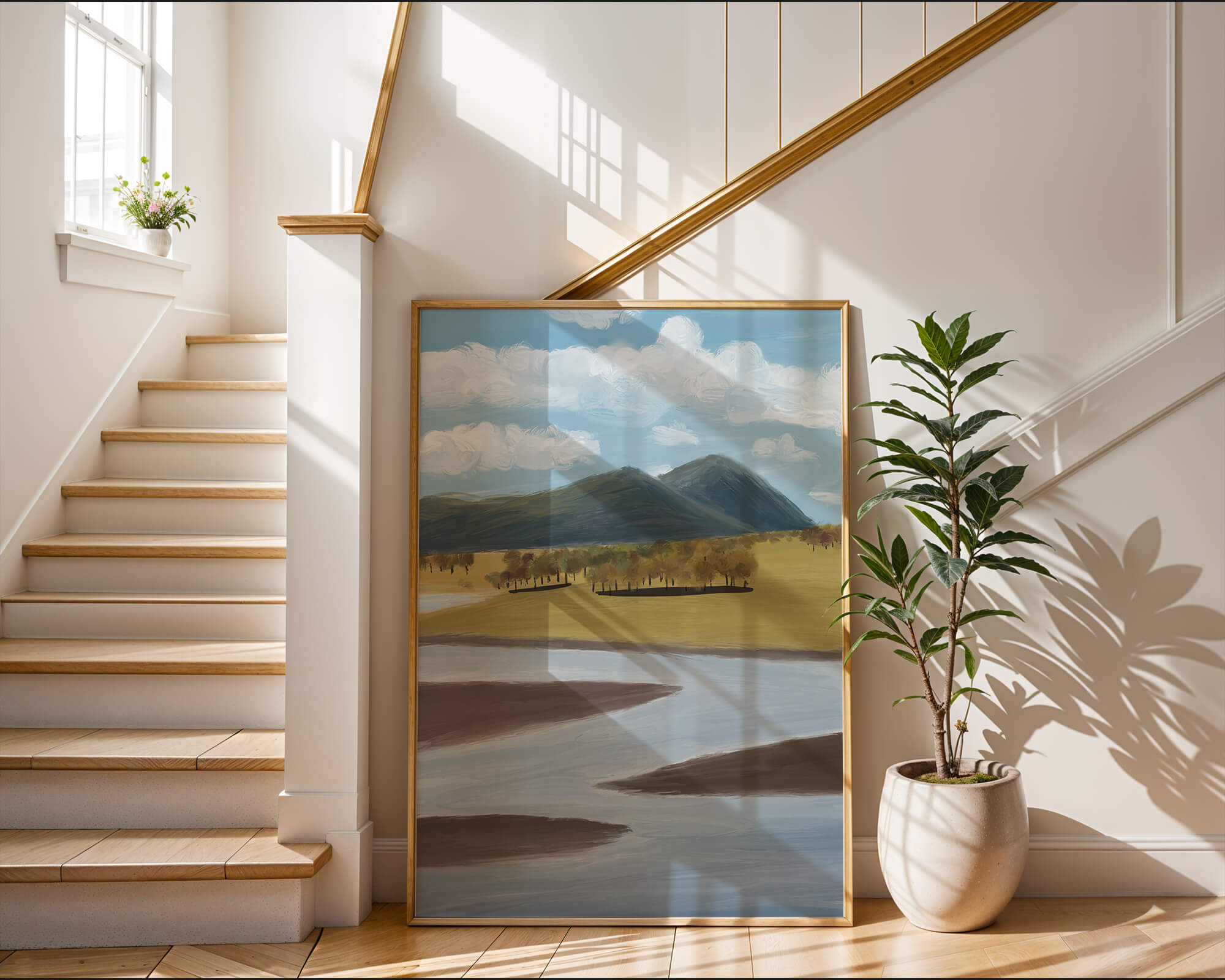 Au centre, une rangée d'arbres se dresse avec résilience, projetant de douces ombres sur l'herbe. L'ensemble de la composition évoque une atmosphère tranquille, invitant les spectateurs à s'immerger dans la beauté du monde naturel, un parfait rappel du calme et de la paix.