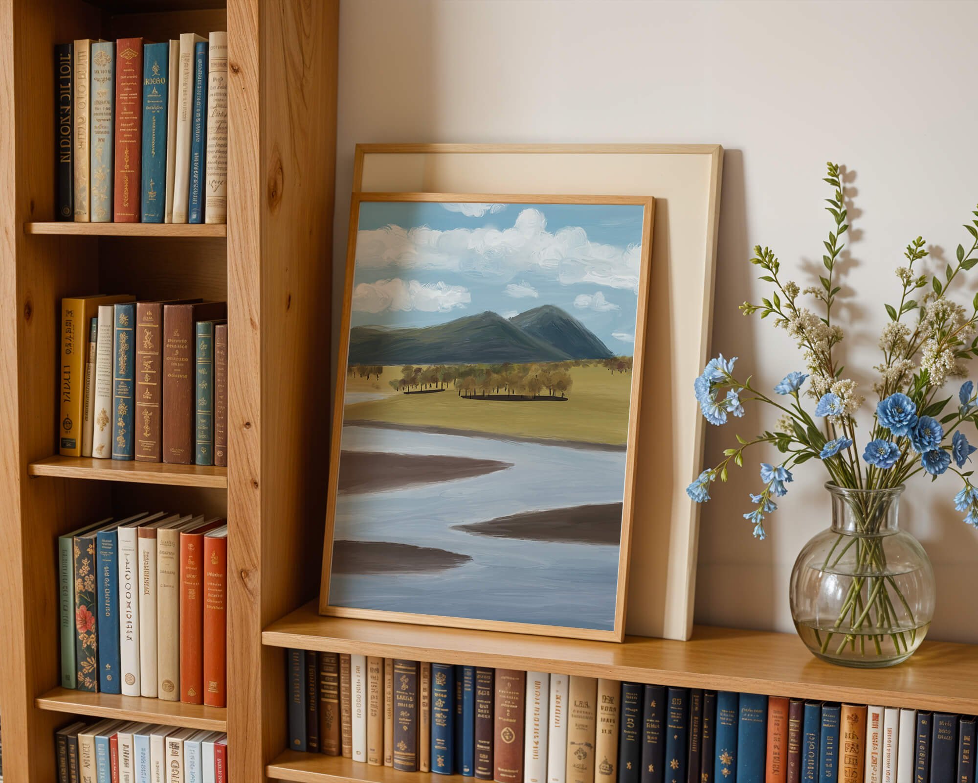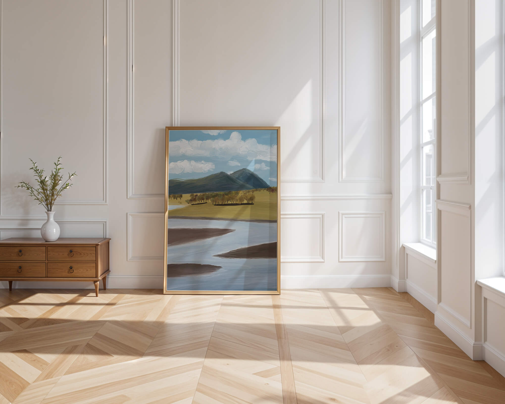 La peinture met en valeur les courbes douces de la rivière qui traverse le premier plan, reflétant le ciel bleu parsemé de nuages duveteux. De hautes montagnes constituent l'arrière-plan, leurs sommets touchant le ciel et ajoutant une touche de grandeur à la scène.