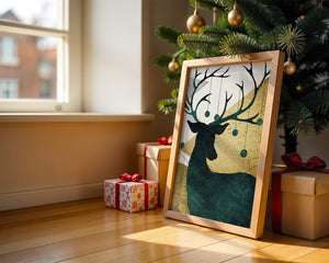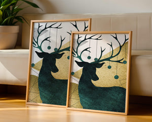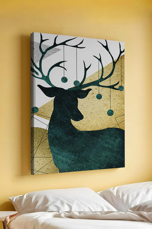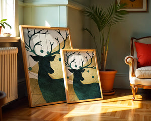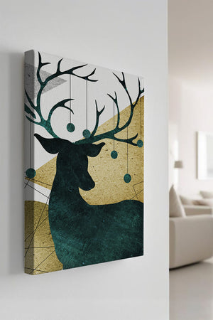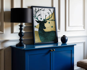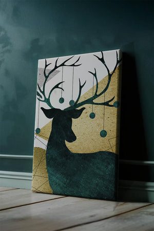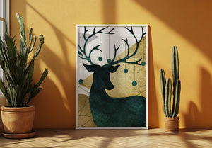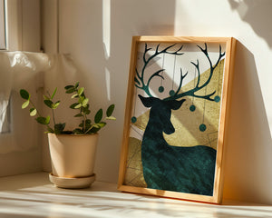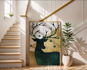Cette image présente un mélange captivant de nature et d'art moderne. La silhouette du cerf, avec ses bois élégamment ramifiés, se détache sur le fond doré texturé. Les boules suspendues aux bois ajoutent une touche ludique et structurée à la composition, renforçant l'impression d'abstraction générale. Des lignes et des formes géométriques se croisent à l'arrière-plan, ajoutant profondeur et intrigue à l'œuvre. L'association du vert et de l'or crée une esthétique luxueuse et raffinée, faisant de cette pièce un élément décoratif idéal pour les intérieurs contemporains.| Taper |