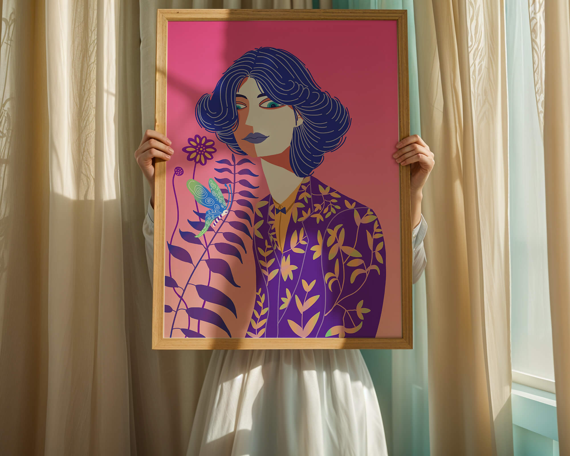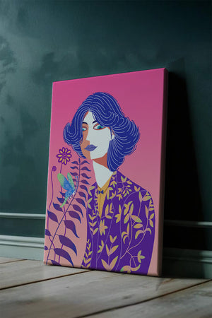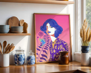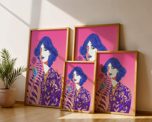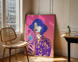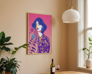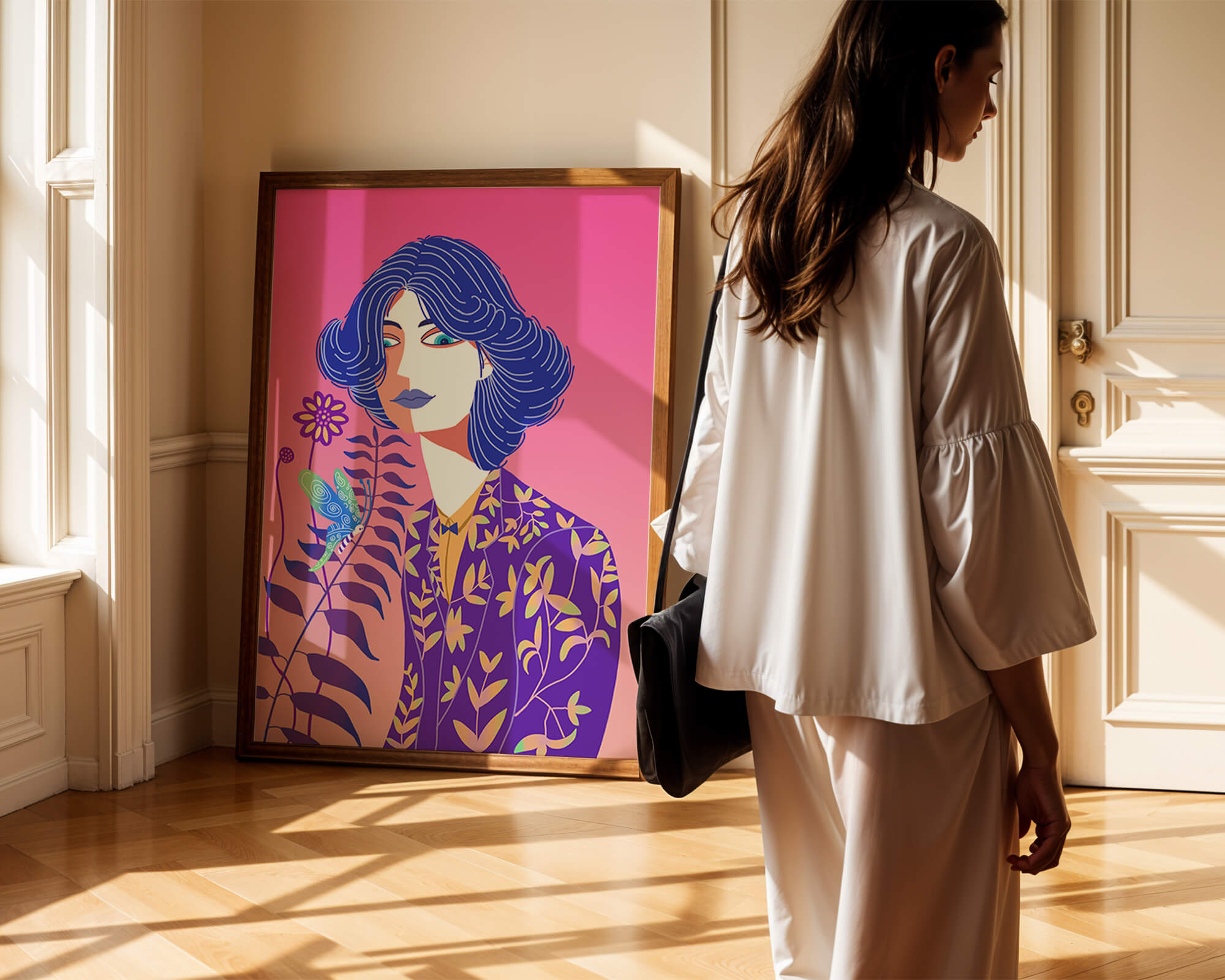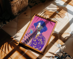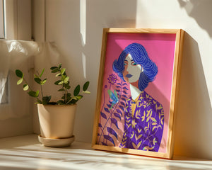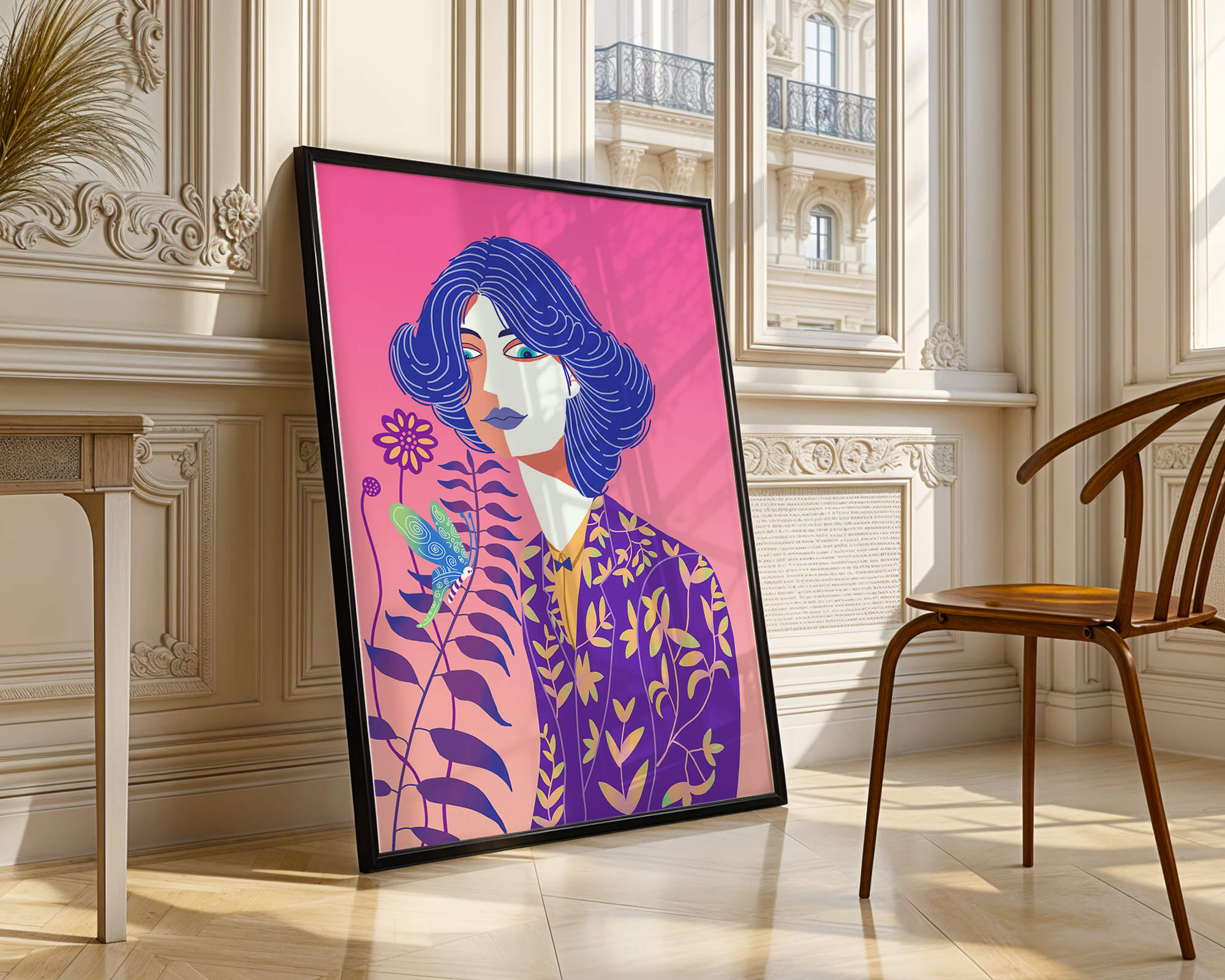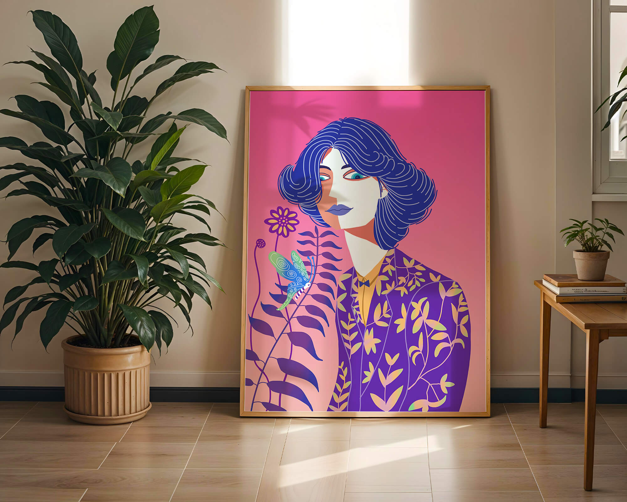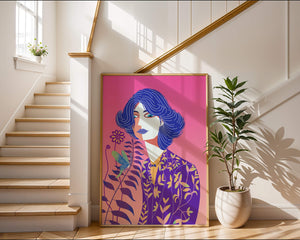Cette œuvre vibrante présente le portrait stylisé d'une femme aux cheveux bleus éclatants sur fond rose vif. Ses cheveux ondulent avec élégance, complétant le motif botanique complexe de sa tenue.