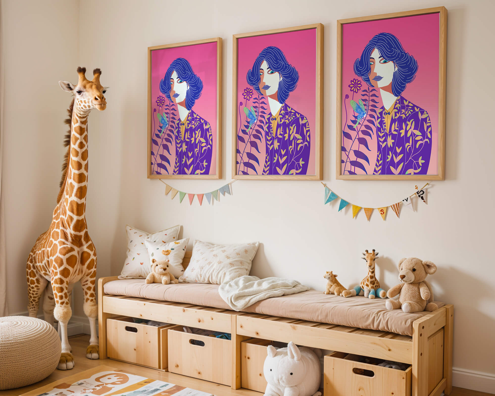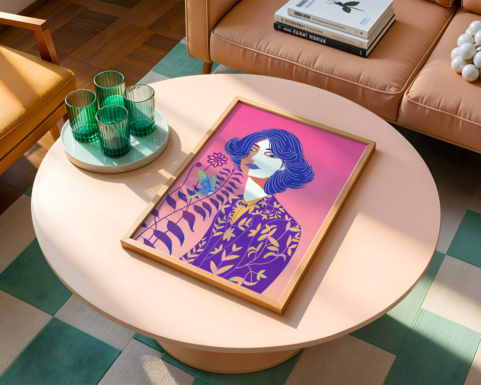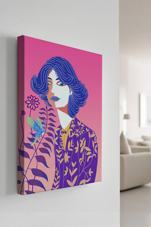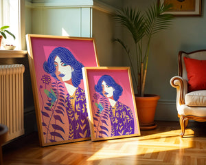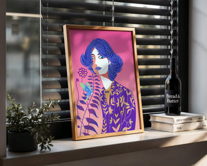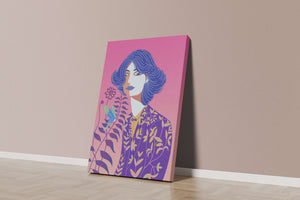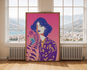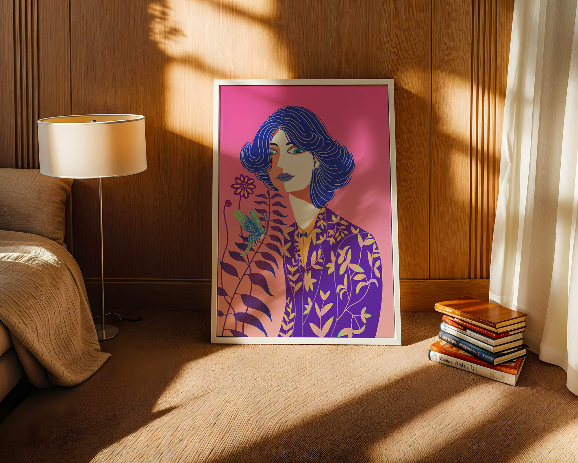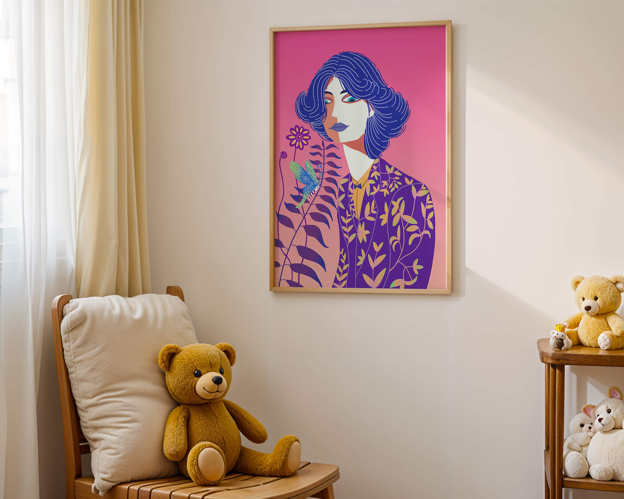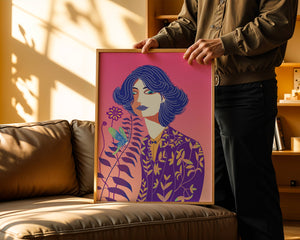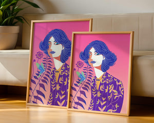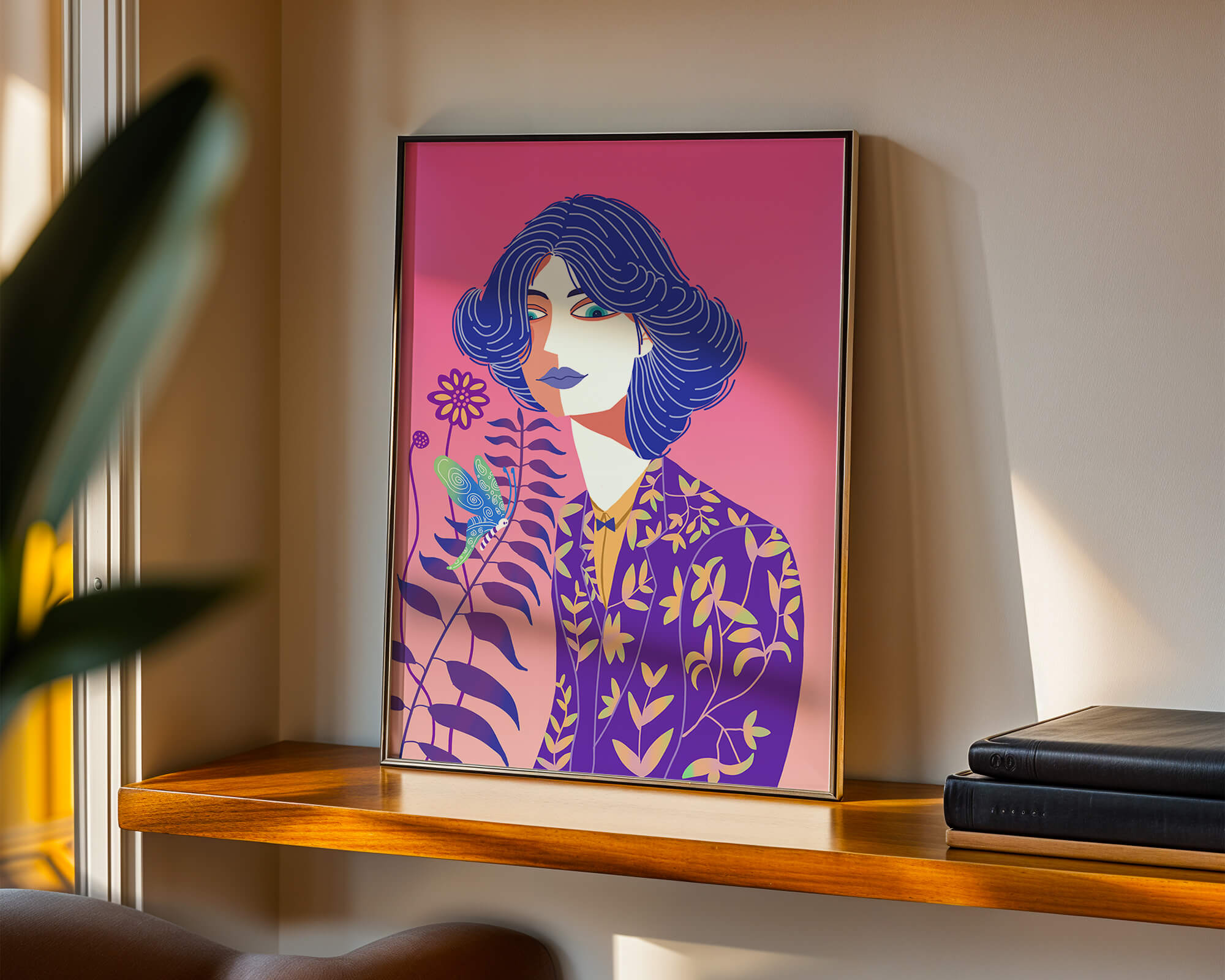 Cette œuvre vibrante présente le portrait stylisé d'une femme aux cheveux bleus éclatants sur fond rose vif. Ses cheveux ondulent avec élégance, complétant le motif botanique complexe de sa tenue.