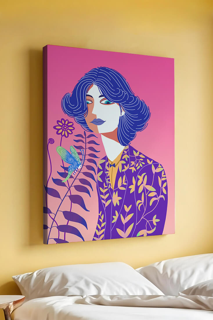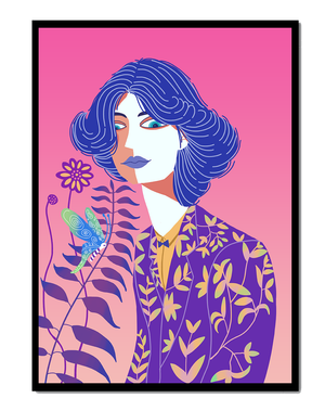 Dans cette œuvre captivante, le portrait de la femme respire à la fois l'élégance et le mystère. Sa chevelure bleue ressort avec force, faisant de sa silhouette le point central de la composition. Les motifs floraux de ses vêtements ajoutent une touche de nature, rehaussant l'esthétique générale de l'œuvre. Le papillon et le feuillage abstrait qui l'entoure créent une interaction harmonieuse entre les éléments naturels et la silhouette humaine. L'utilisation de couleurs vives, notamment le violet et le jaune, souligne le caractère moderne et abstrait de cette œuvre d'art, la transformant en un ajout remarquable à toute collection.| Taper |