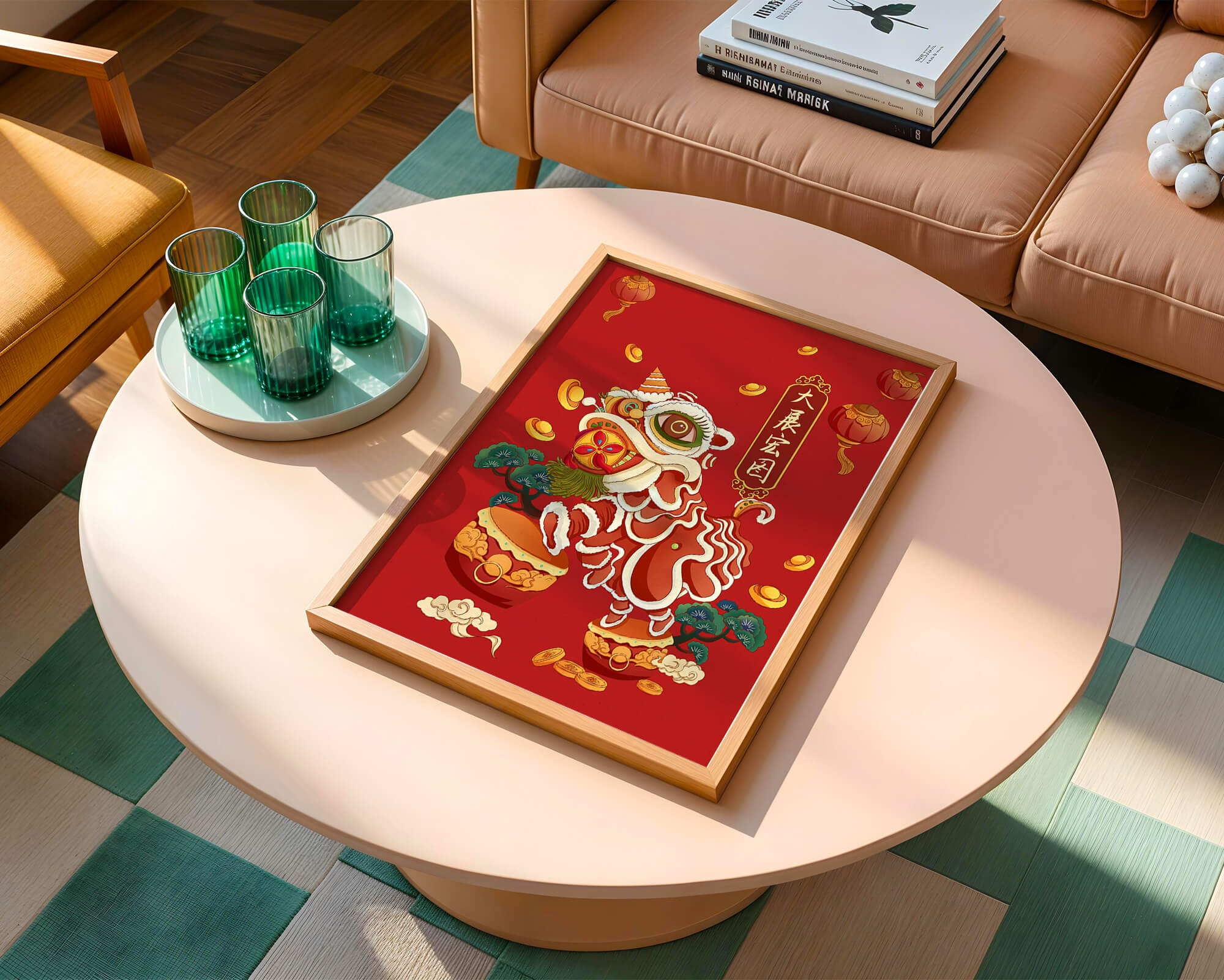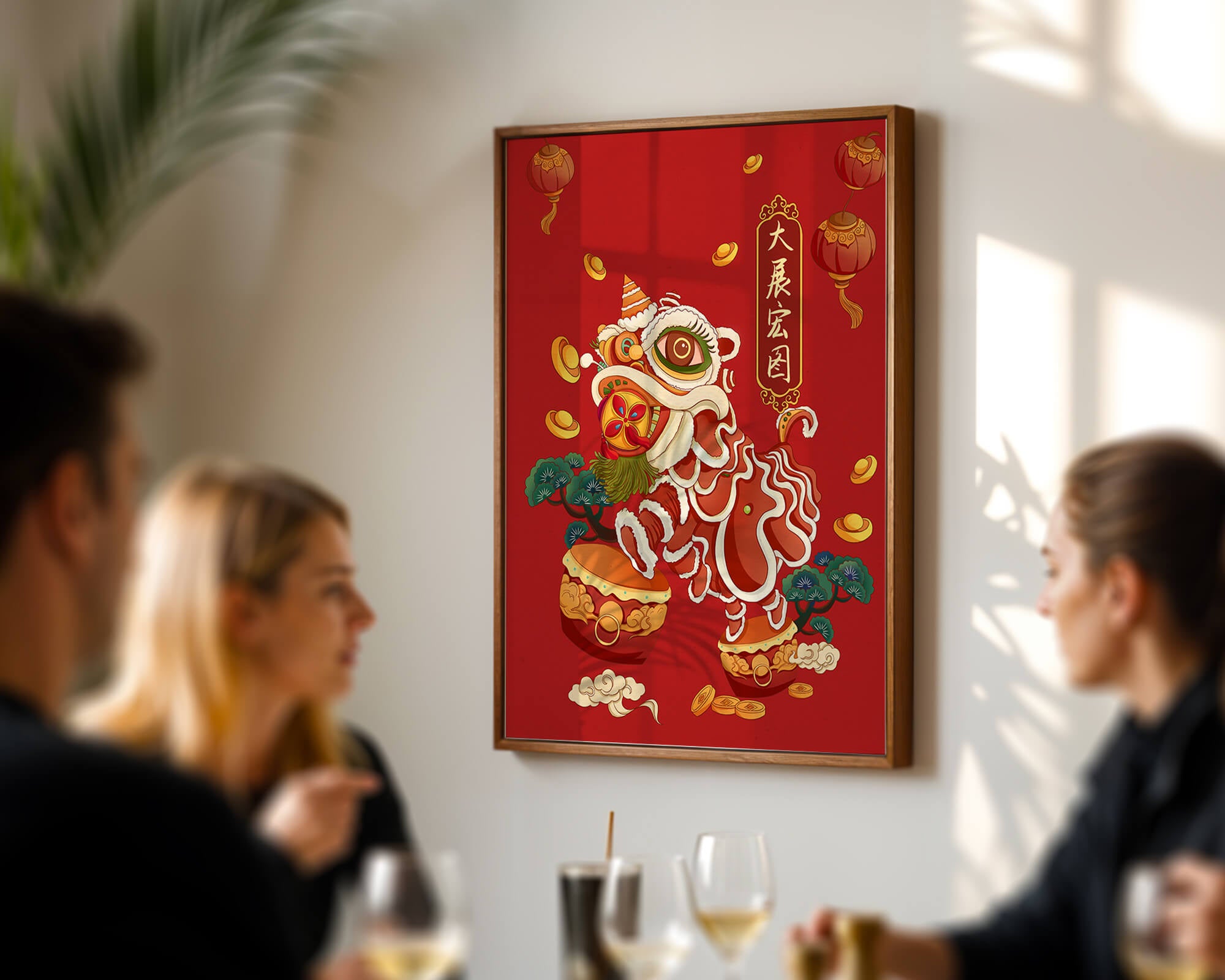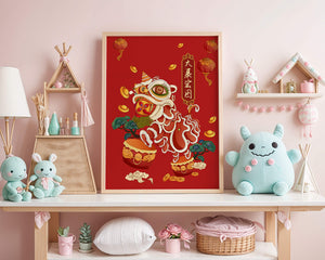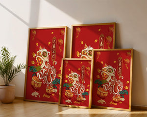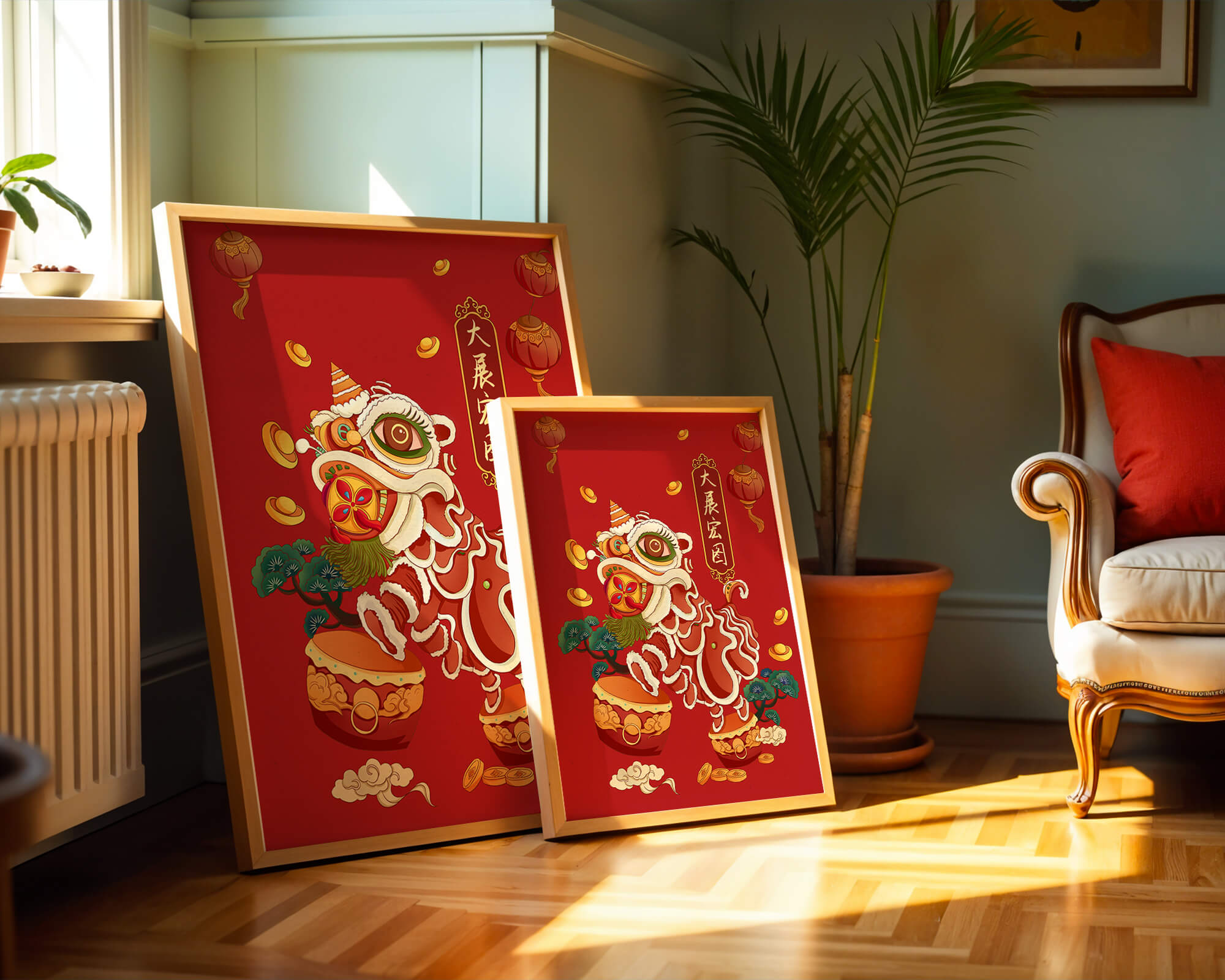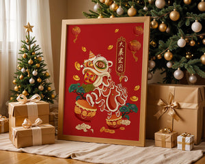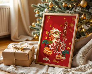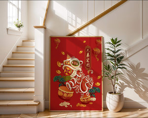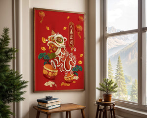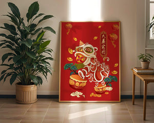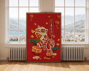 Cette illustration vibrante capture l'essence de la culture chinoise traditionnelle en mettant l'accent sur une danse du lion. Mettant en valeur des rouges et des ors riches, elle met en avant divers éléments festifs qui donnent vie à l'œuvre.