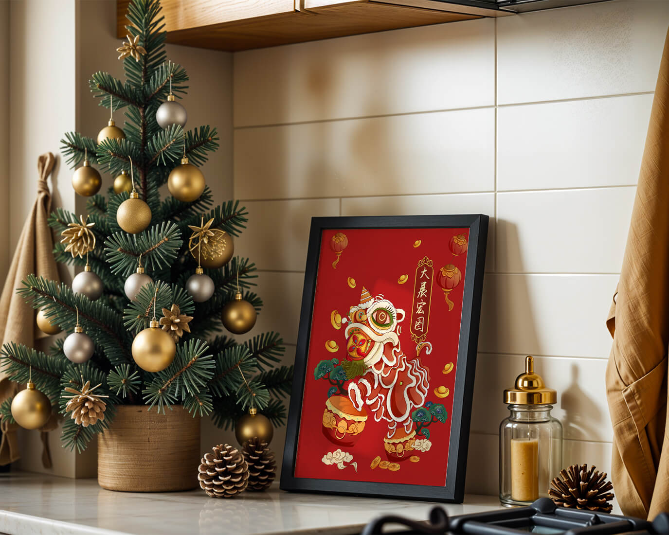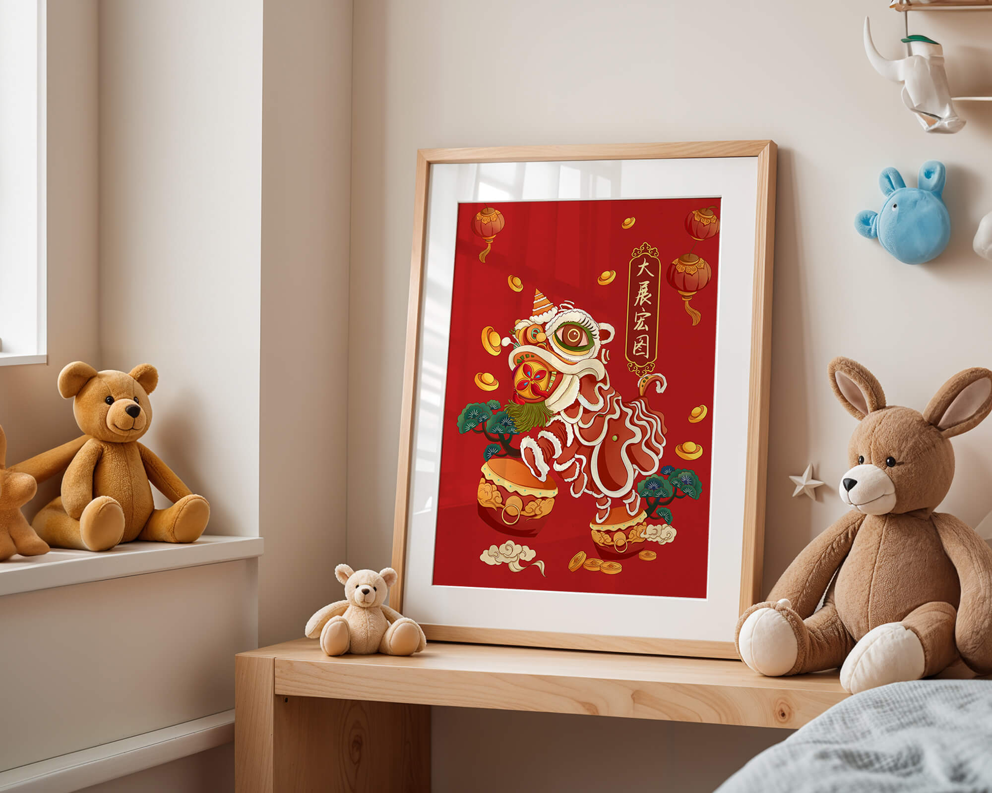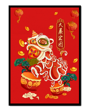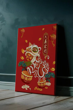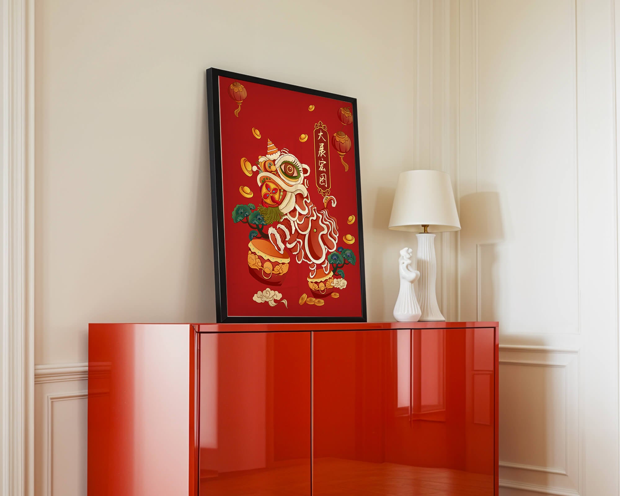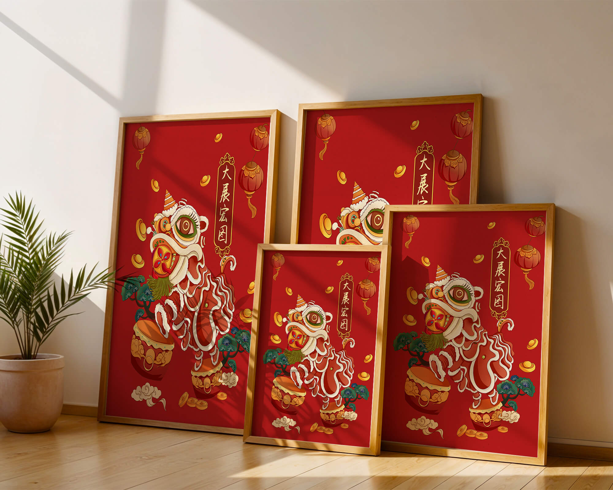 Cette illustration vibrante capture l'essence de la culture chinoise traditionnelle en mettant l'accent sur une danse du lion. Mettant en valeur des rouges et des ors riches, elle met en avant divers éléments festifs qui donnent vie à l'œuvre.