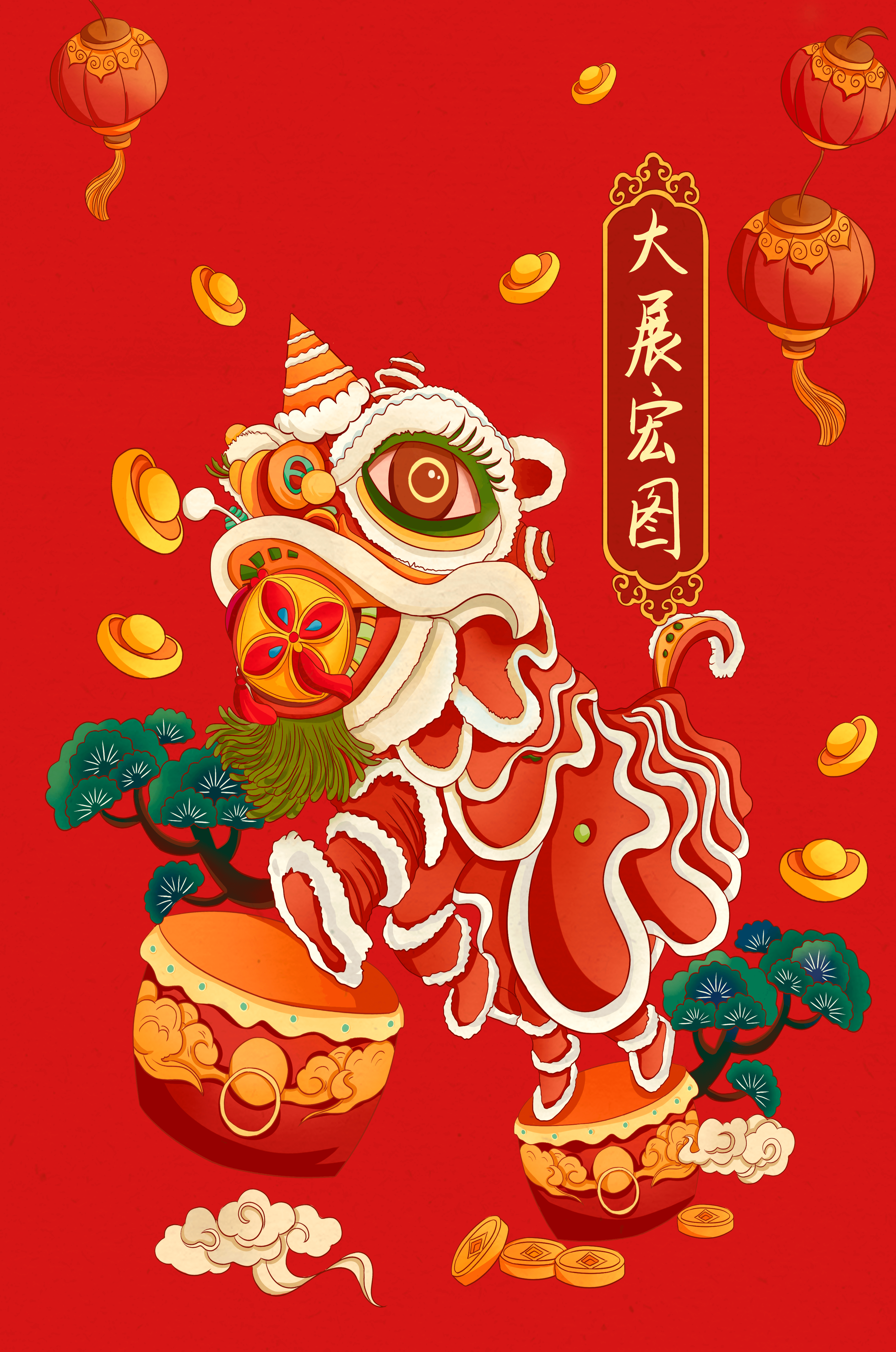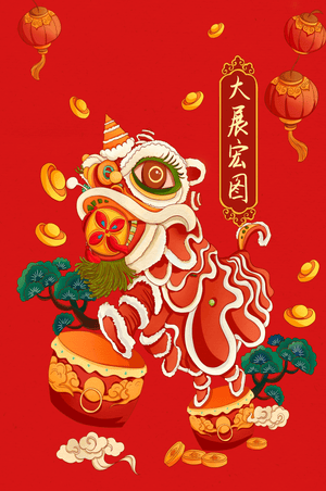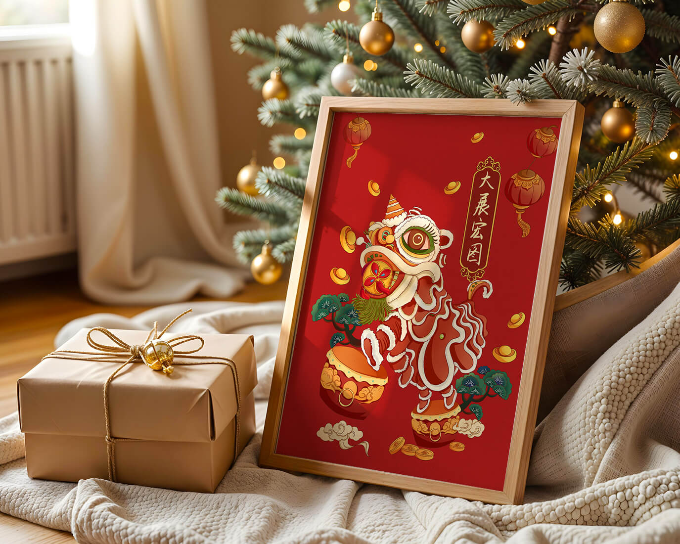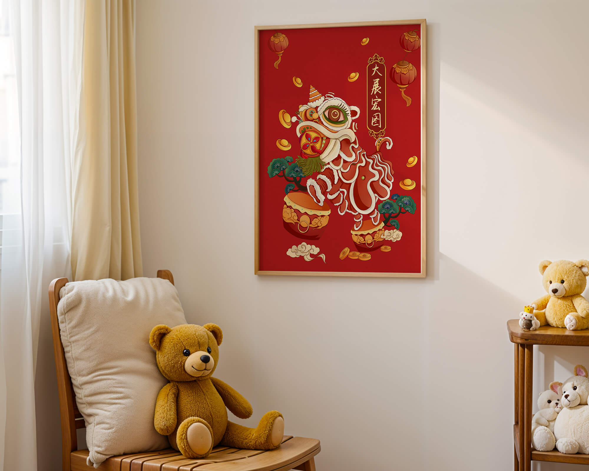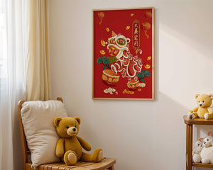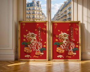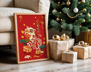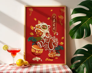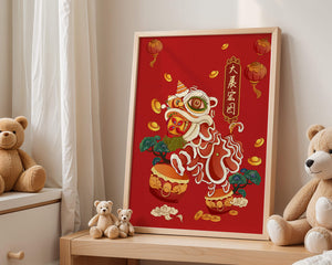 Cette illustration vibrante capture l'essence de la culture chinoise traditionnelle en mettant l'accent sur une danse du lion. Mettant en valeur des rouges et des ors riches, elle met en avant divers éléments festifs qui donnent vie à l'œuvre.