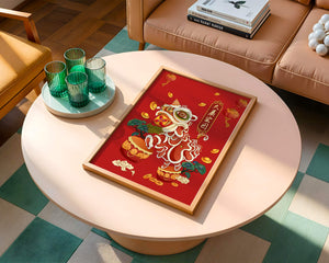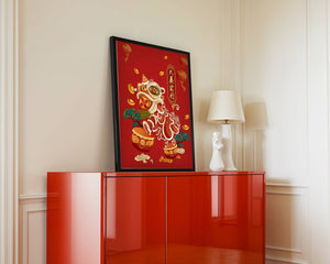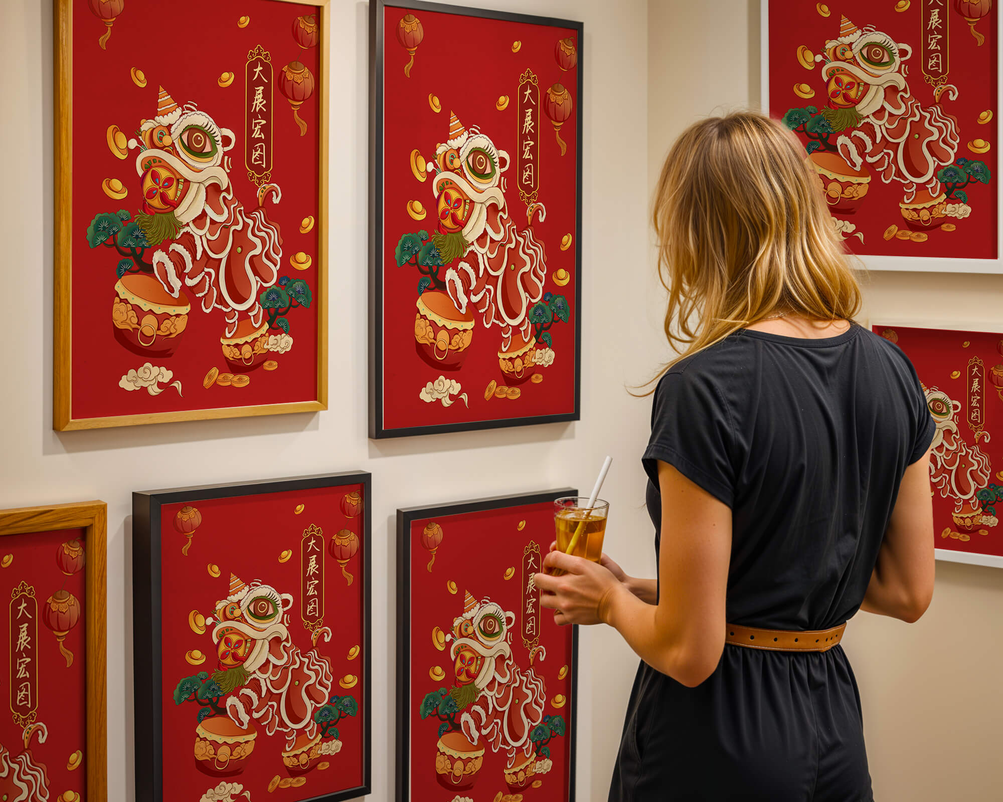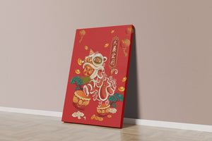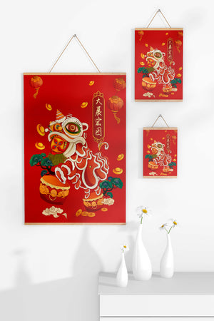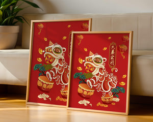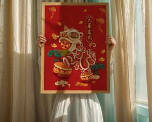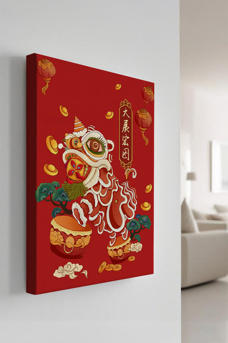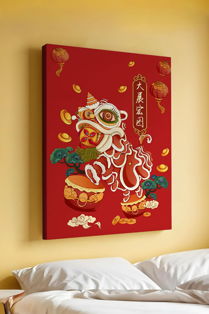 L'image présente un lion dynamique et coloré, avec des motifs et des textures complexes qui évoquent un sentiment de mouvement et de fête. Le lion, au centre de l'œuvre, arbore des yeux brillants, une crinière détaillée et des décorations élaborées caractéristiques des fêtes traditionnelles chinoises. Autour du lion se trouvent des pièces d'or, des lanternes rouges et des caractères chinois traditionnels symbolisant la prospérité et la bonne fortune. L'utilisation de couleurs vives et de détails raffinés fait de cette illustration un choix parfait pour une décoration festive et l'appréciation de l'art culturel. Cette œuvre célèbre non seulement les riches traditions de la culture chinoise, mais constitue également un ajout éclatant à toute pièce, apportant une touche d'auspices et de joie.| Taper |