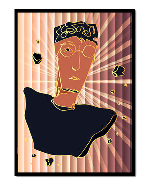 A striking abstract portrait infused with golden highlights and a surreal background. The fragmented composition and geometric lines create a sense of movement and mystery.