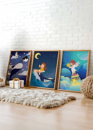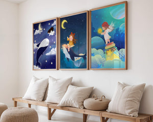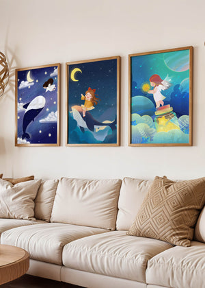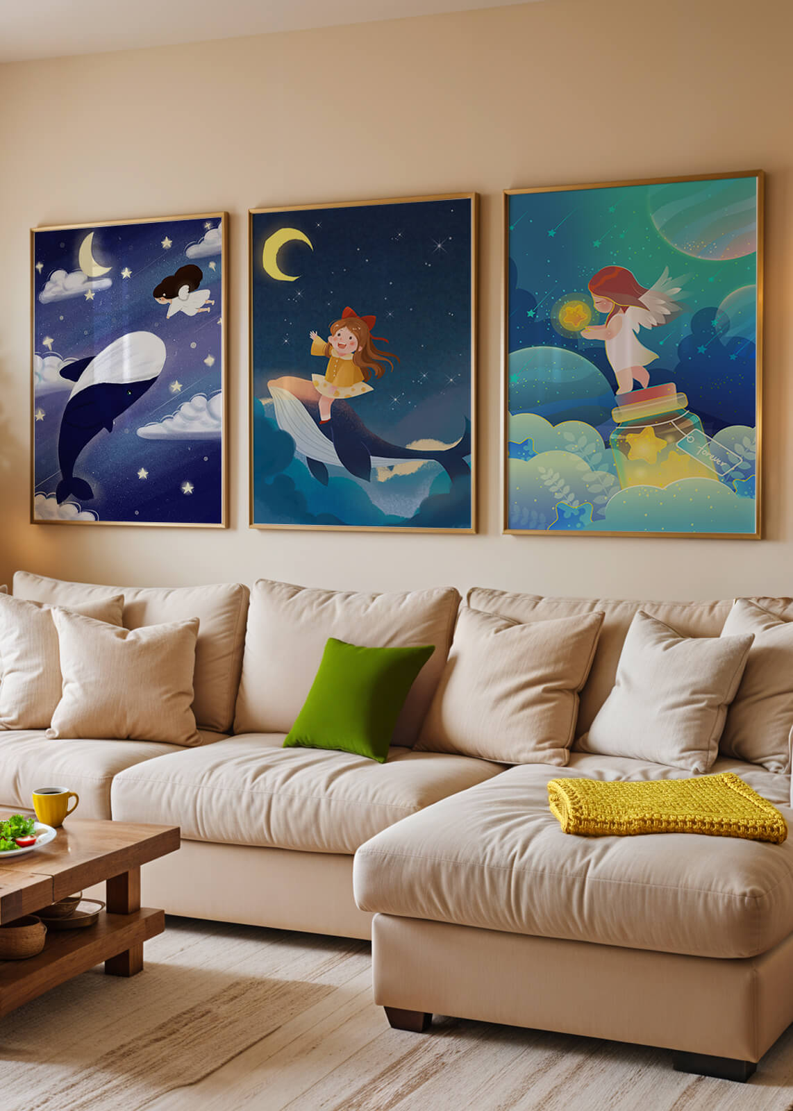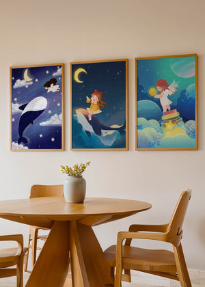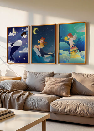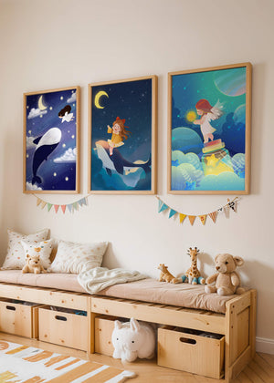Las ilustraciones presentan escenas nocturnas con niños interactuando con ballenas y nubes, mientras vuelan bajo la luz de la luna. Las imágenes evocan una sensación de libertad y creatividad, convirtiéndolas en una excelente adición para la decoración de habitaciones infantiles. La combinación de colores vibrantes y elementos oníricos inspira tanto a jóvenes como a mayores, fomentando la exploración de la imaginación y los sueños.
