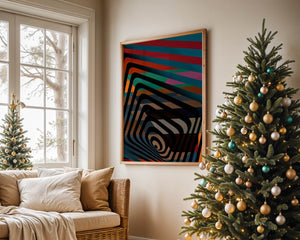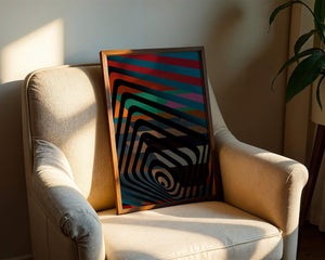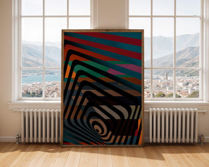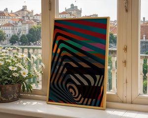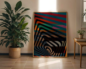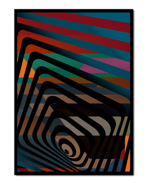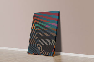 This artwork features a dynamic and colorful geometric composition with concentric stripes creating a sense of depth and movement.