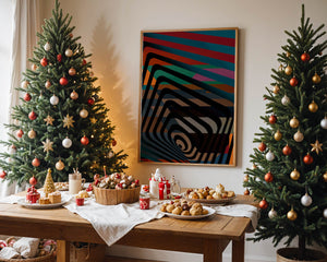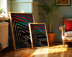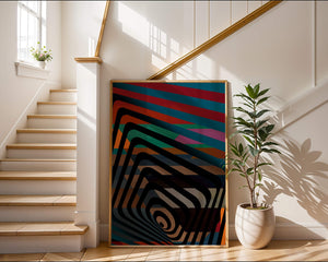 The artwork captivates viewers with its complex patterns and vibrant colors. At the forefront, concentric stripes draw the eye inward, creating an engaging visual journey. The combination of colors, including deep blues, reds, and greens, adds to the lively and energetic feel of the design.