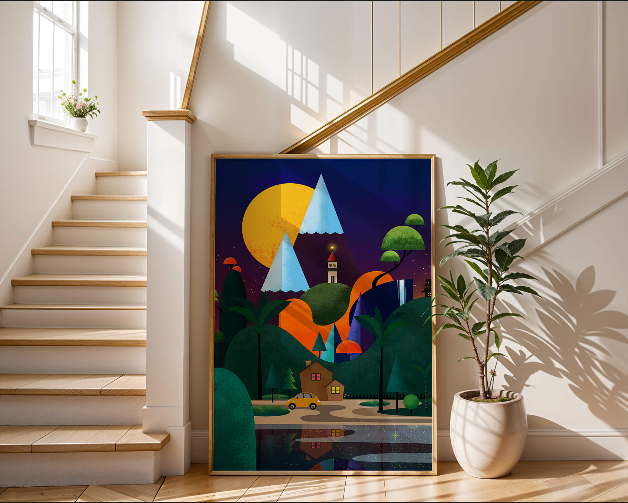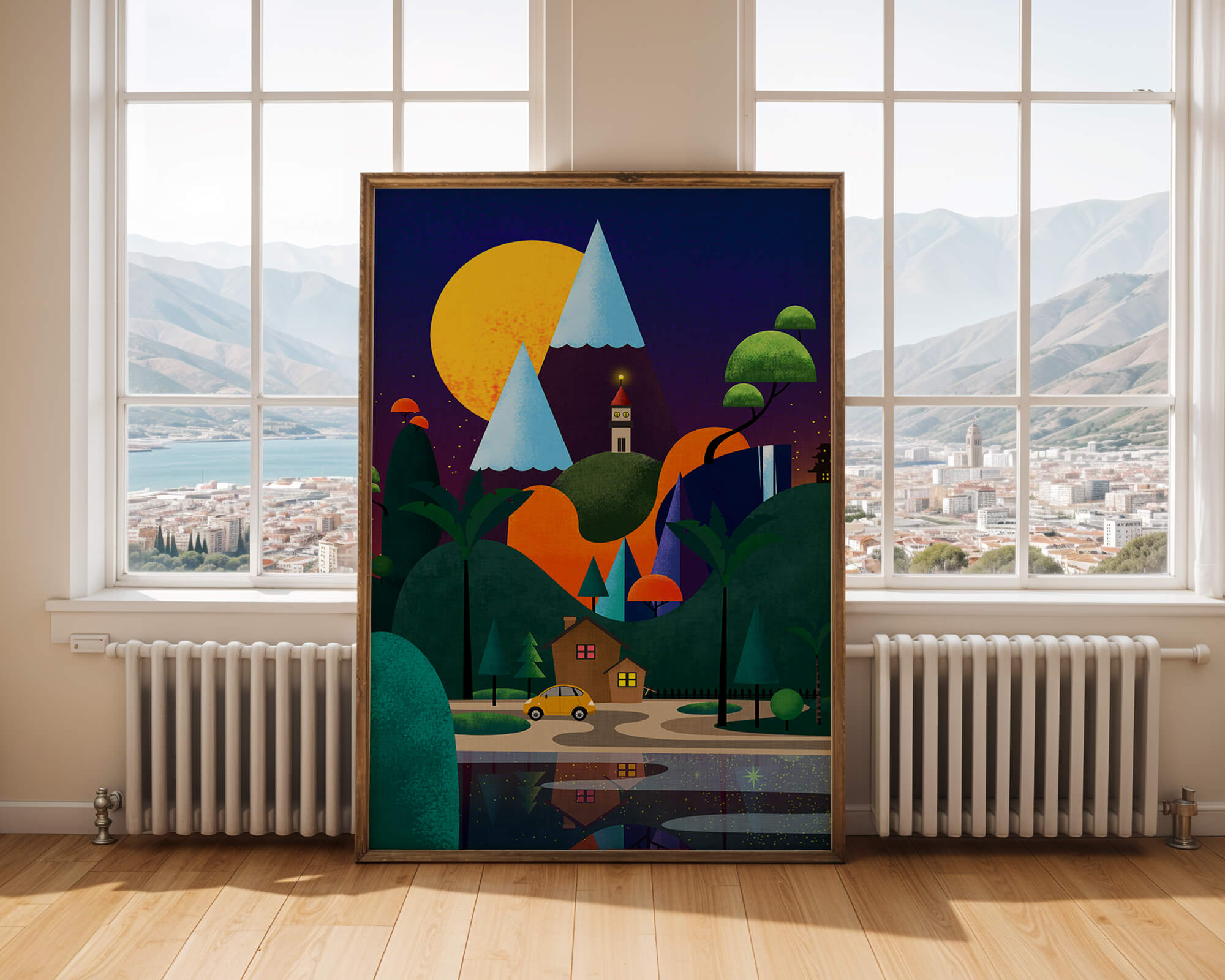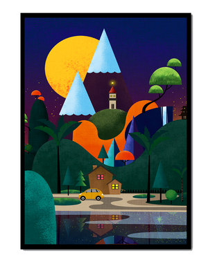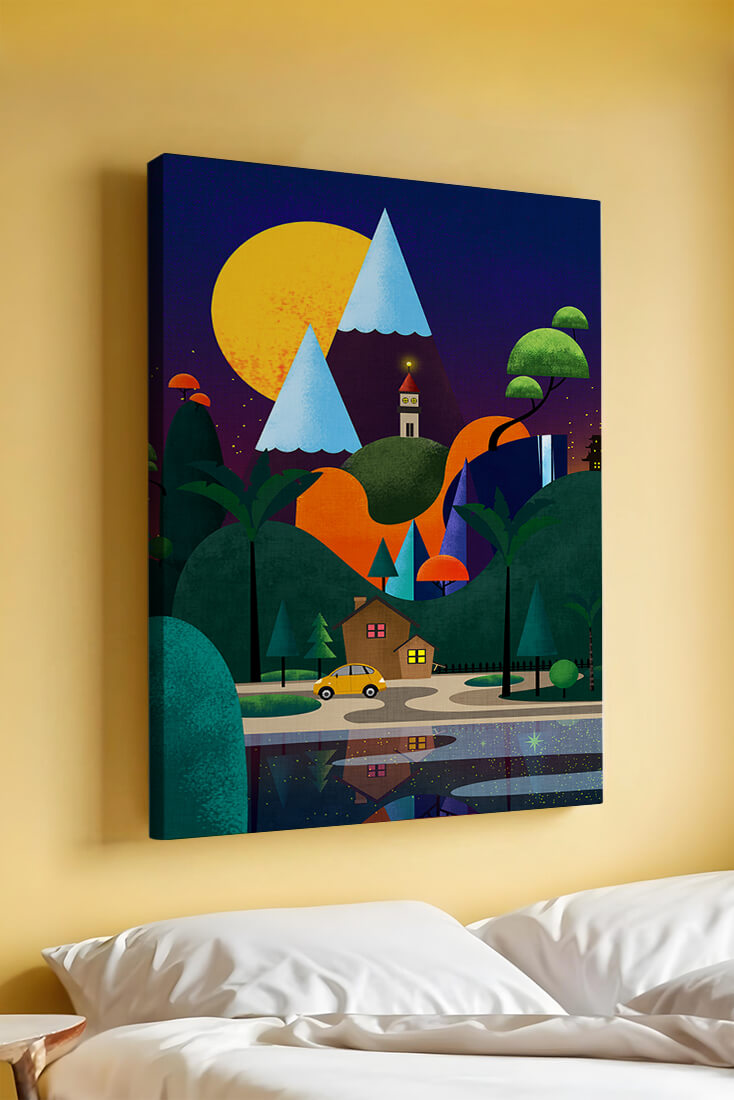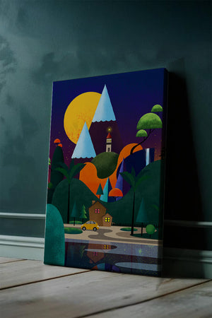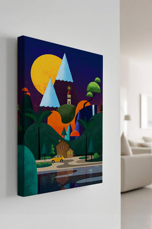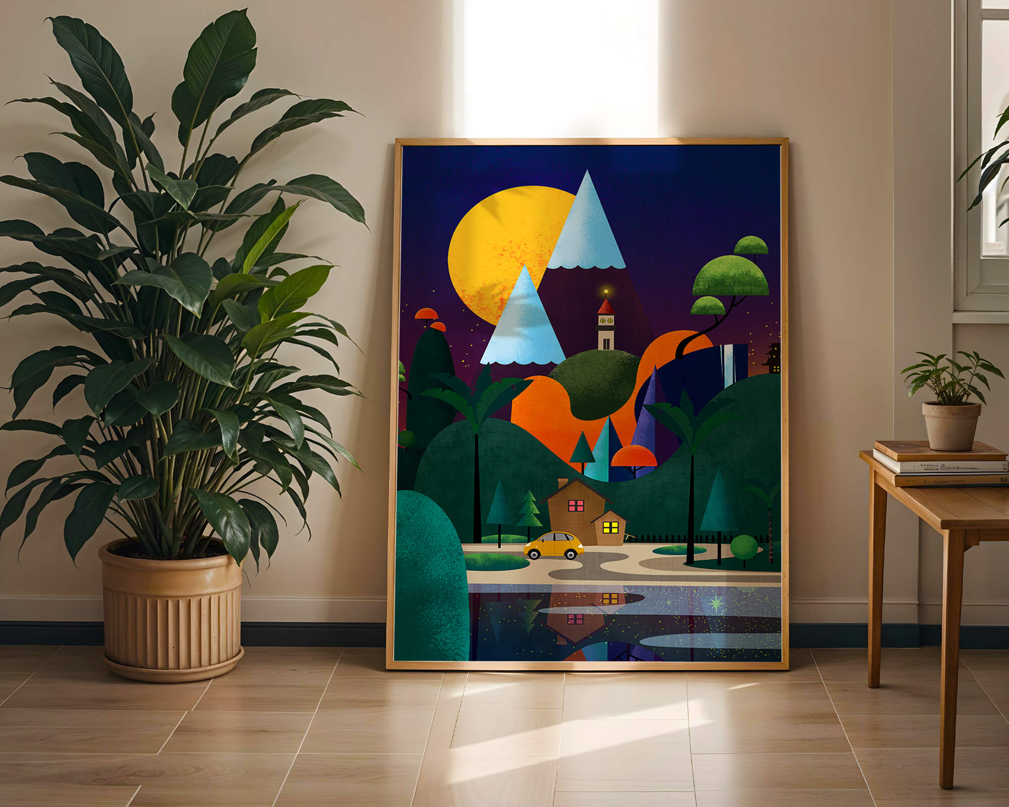 In this artwork, a yellow car is parked beside the house, which has illuminated windows, adding warmth to the composition. The large yellow moon contrasts with the dark sky, casting a serene glow over the scenery. The towering mountains and varied trees create a dynamic interplay of shapes, colors, and textures. The scene conveys a sense of tranquility and imagination, perfect for fans of modern and abstract art genres.| Type |