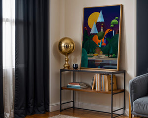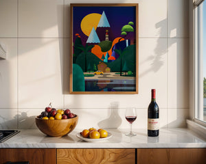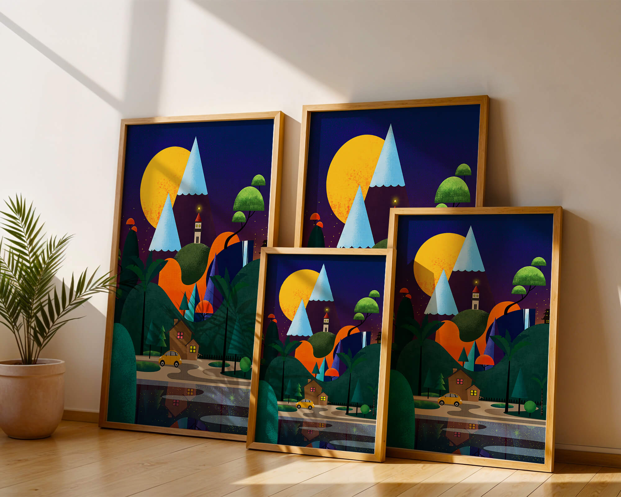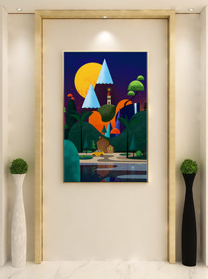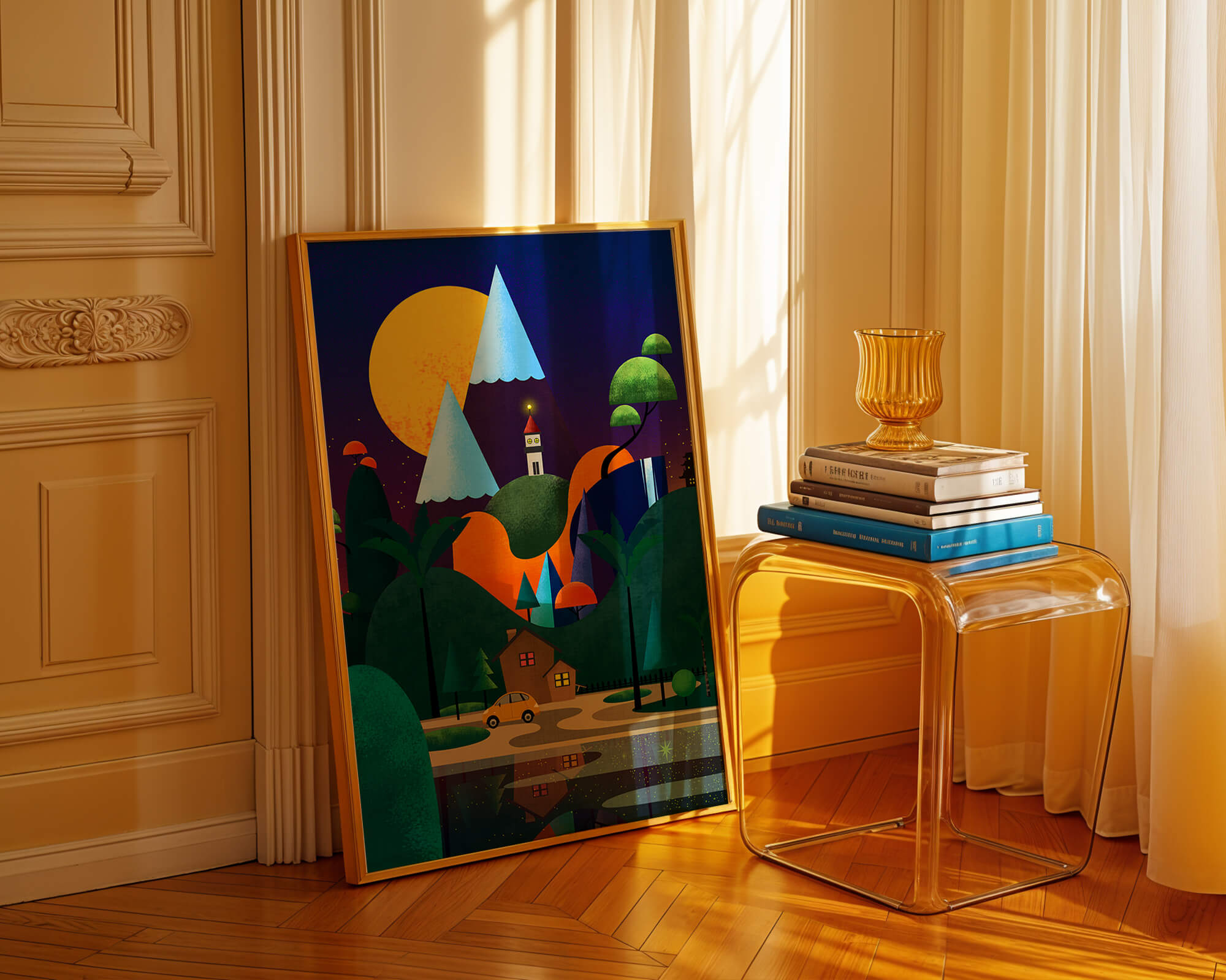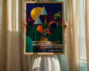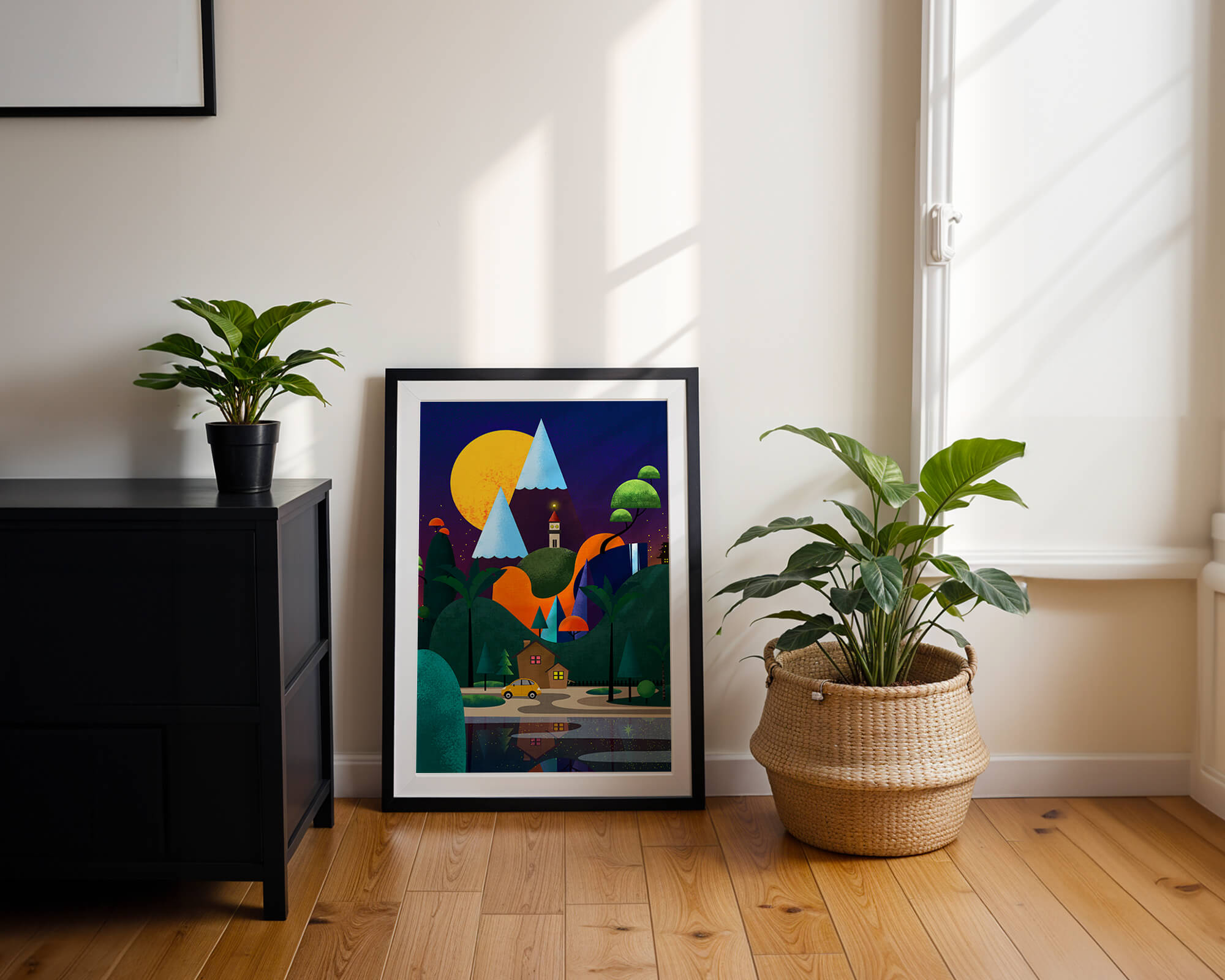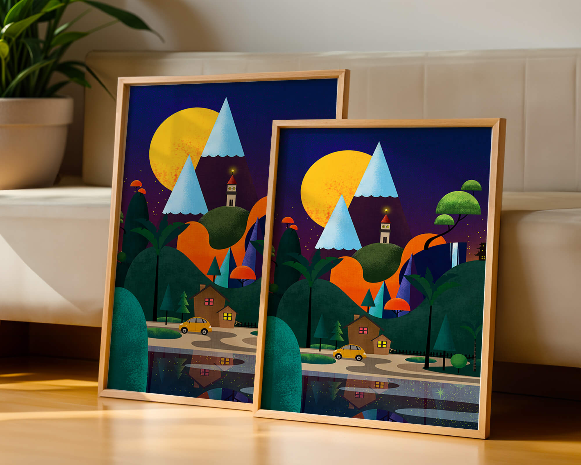 In this artwork, a yellow car is parked beside the house, which has illuminated windows, adding warmth to the composition. The large yellow moon contrasts with the dark sky, casting a serene glow over the scenery. The towering mountains and varied trees create a dynamic interplay of shapes, colors, and textures. The scene conveys a sense of tranquility and imagination, perfect for fans of modern and abstract art genres.| Type |