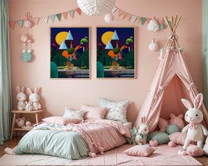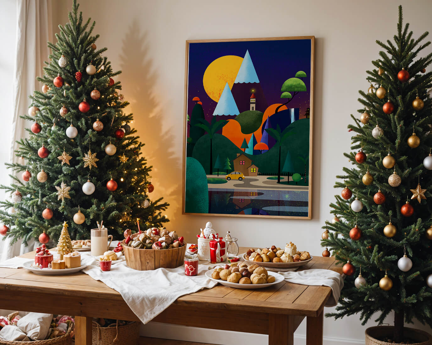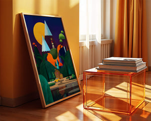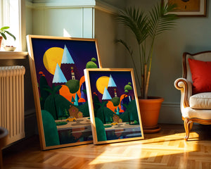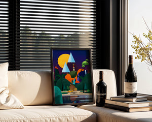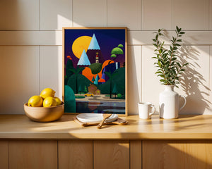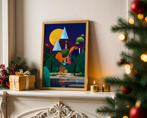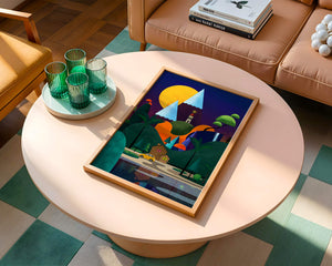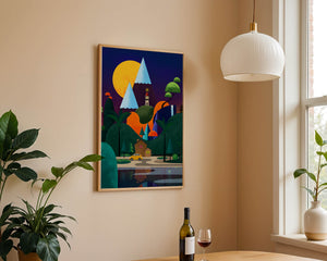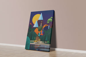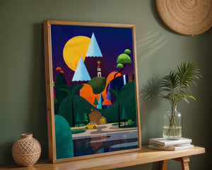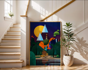 Colorful Modern Landscape with Geometric Elements and A House by The Lake Under The Night Sky