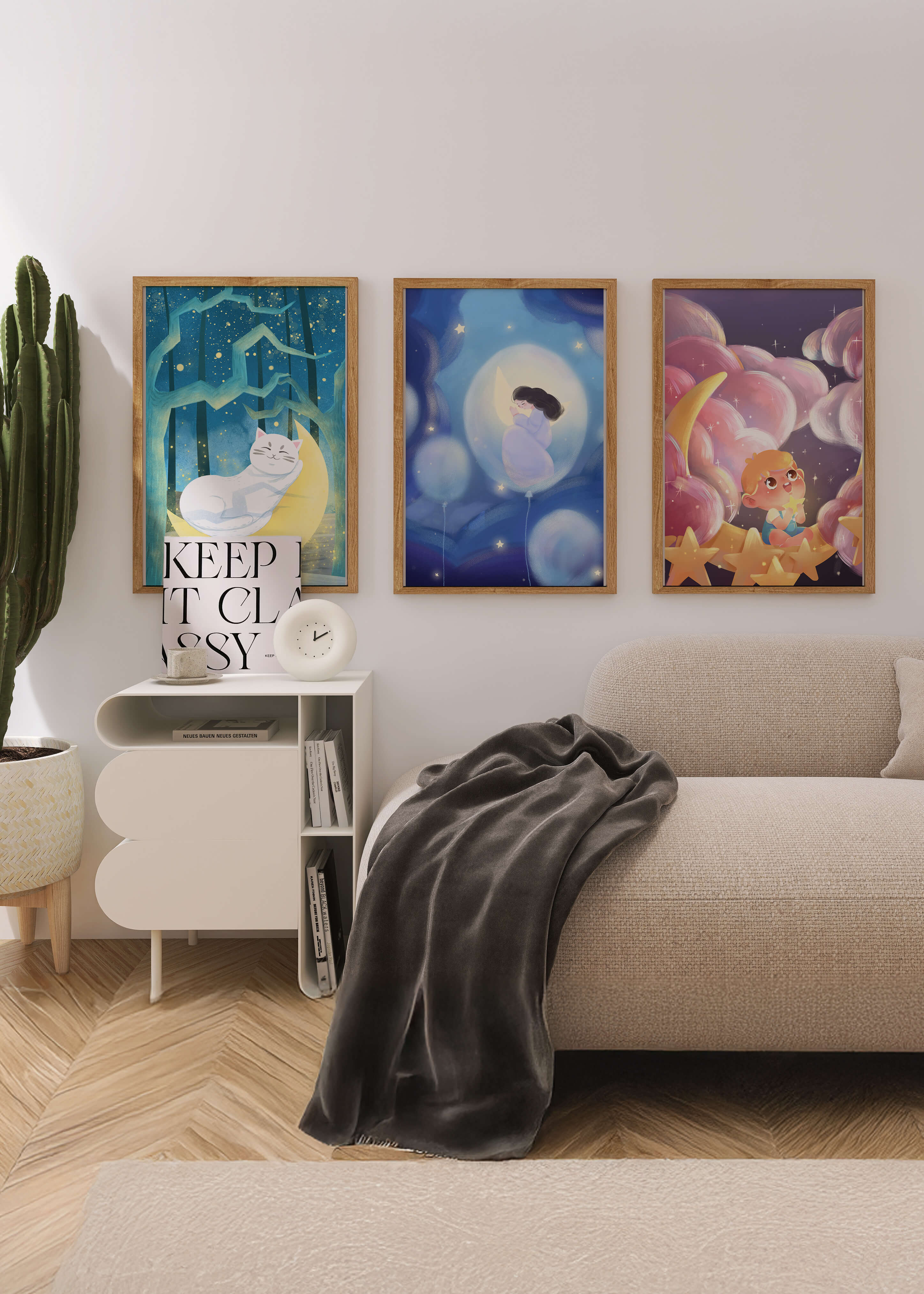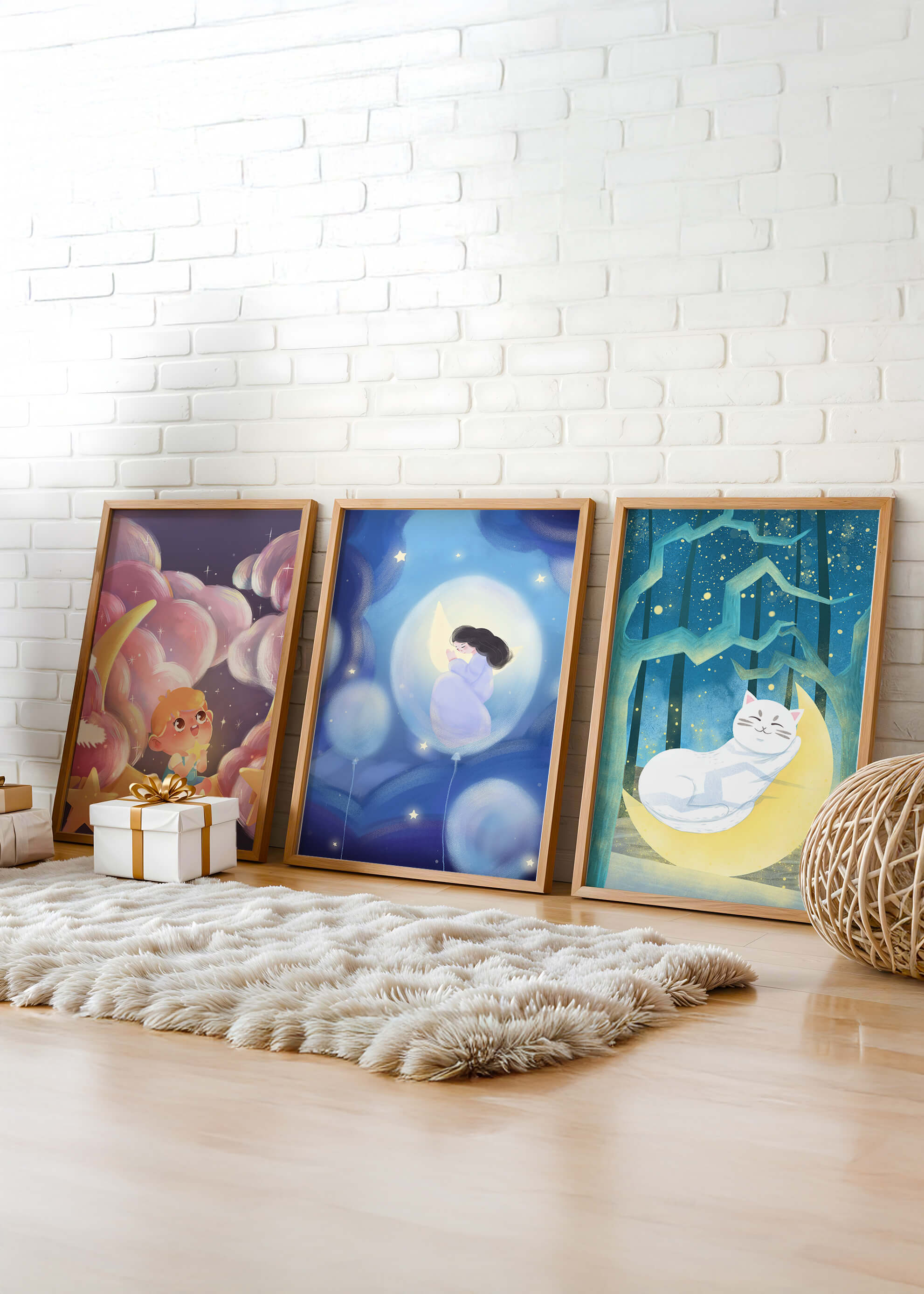 Ubicado en un entorno luminoso, cada obra capta la imaginación con su paleta de colores suaves y delicados. El primer cuadro muestra a un niño rodeado de nubes y estrellas, evocando una sensación de aventura y exploración en el espacio. La segunda imagen centra la atención en una figura soñadora sosteniendo una luna, envuelta en una tranquilidad celestial. El tercero presenta un gato blanco descansando en un bosque estrellado, transmitiendo relajación y paz nocturna. Estas ilustraciones son perfectas para decorar habitaciones infantiles o cualquier espacio que busque añadir un toque de fantasía y dulzura. La calidad de impresión alta asegura detalles vívidos y colores vibrantes, ideales para inspirar sueños y crear un ambiente cálido y acogedor.