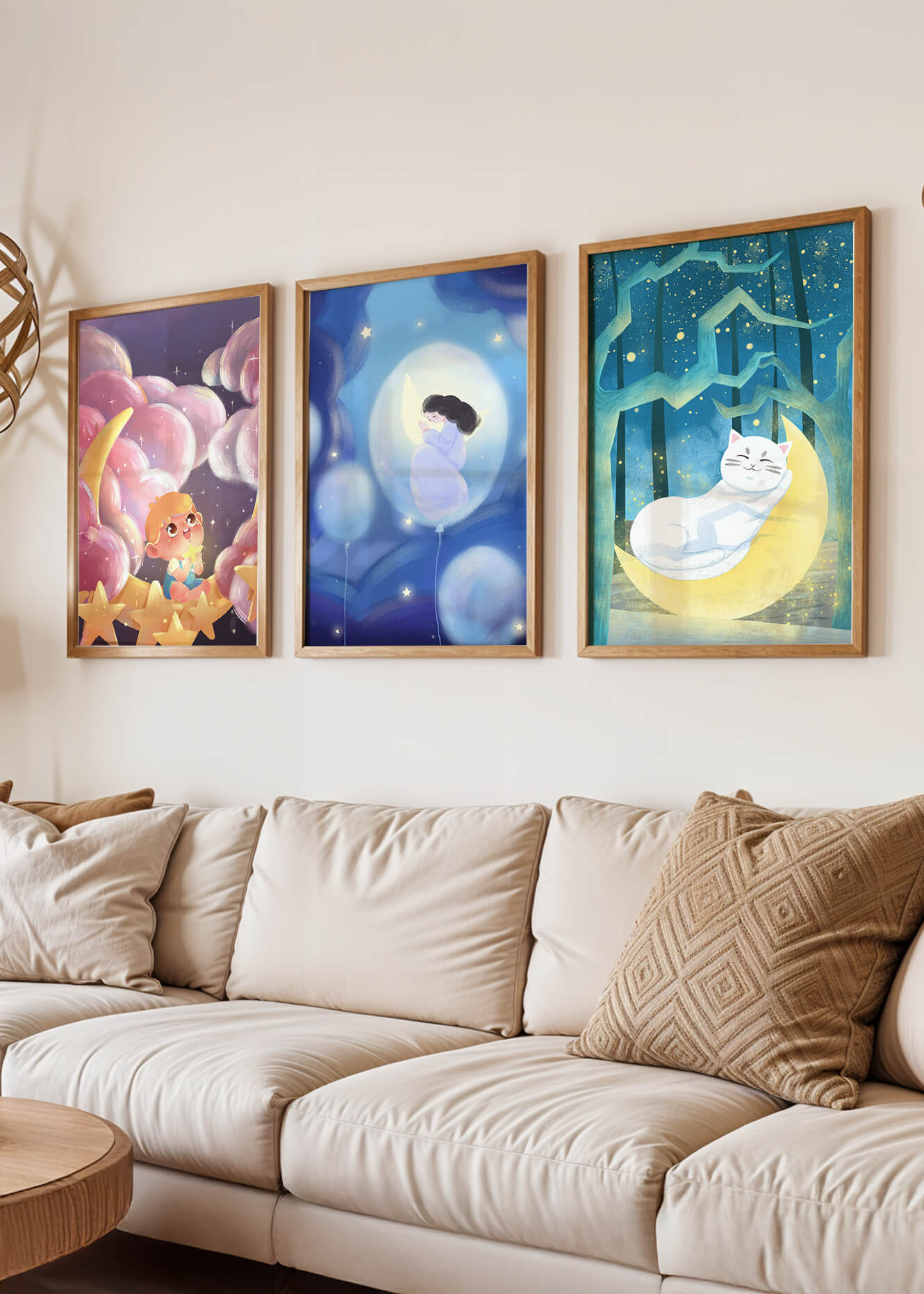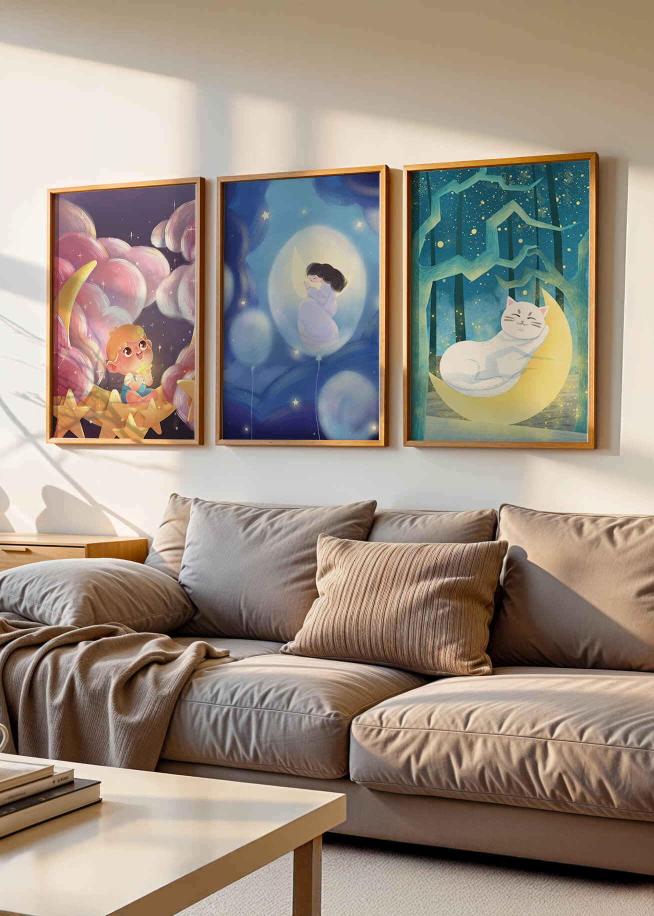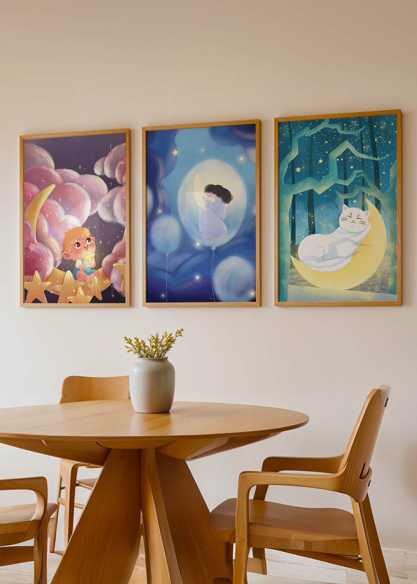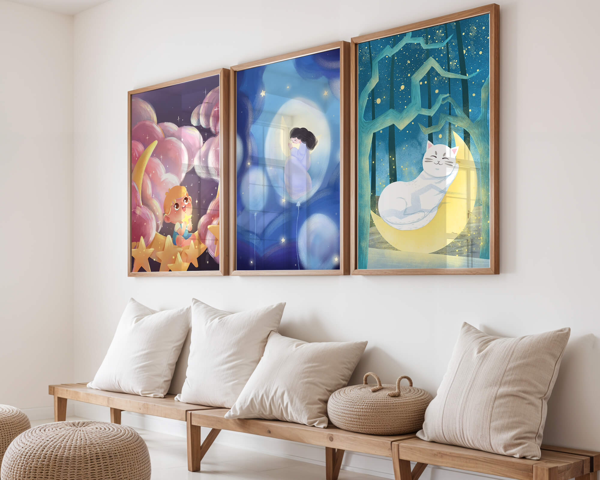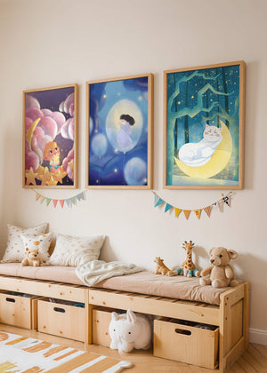 Esta colección de imágenes artísticas presenta tres cuadros contiguos, cada uno con un diseño único y encantador. Las ilustraciones destacan temas infantiles y de ensueño con elementos como niños, lunas y gatos, creando una atmósfera mágica y reconfortante.