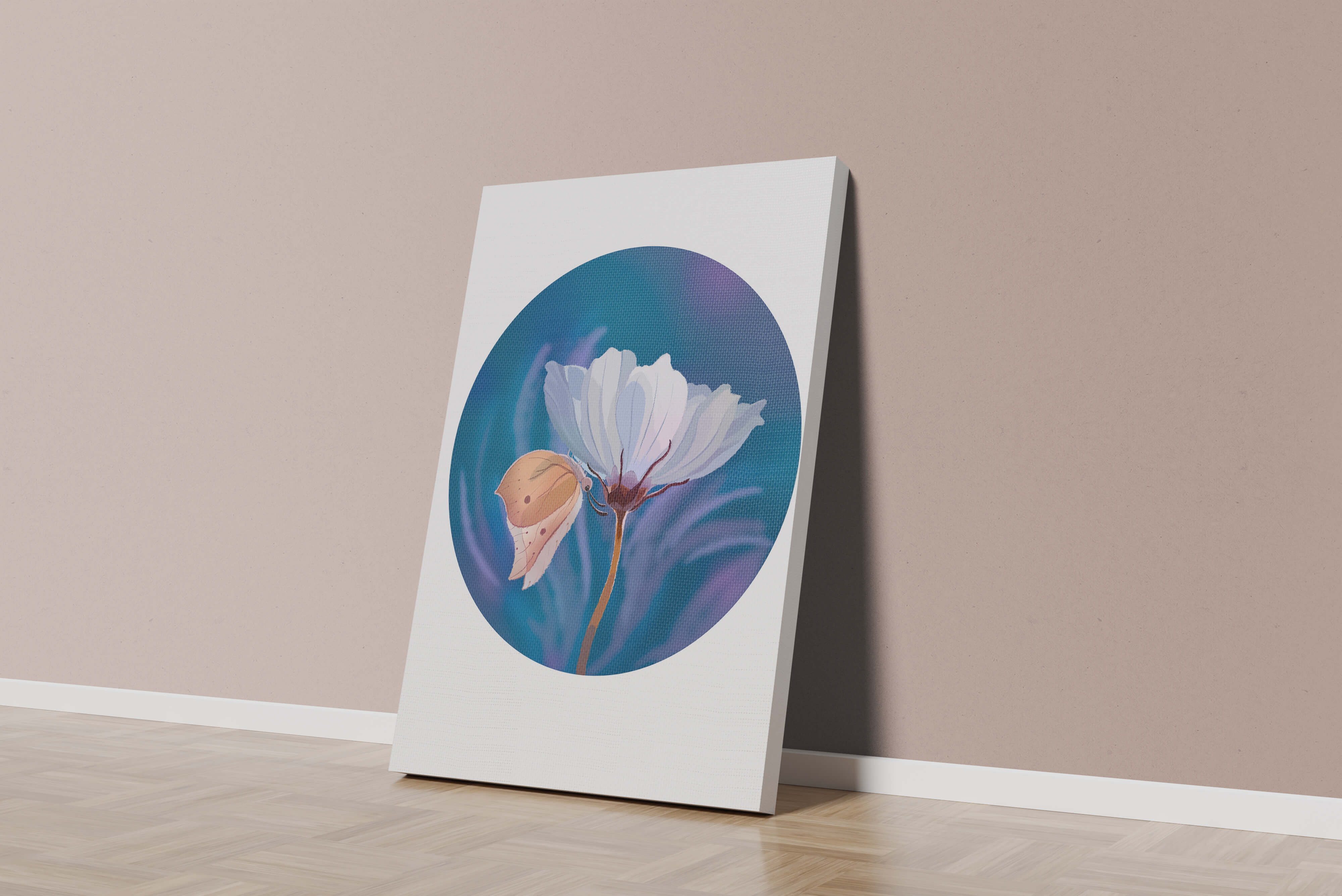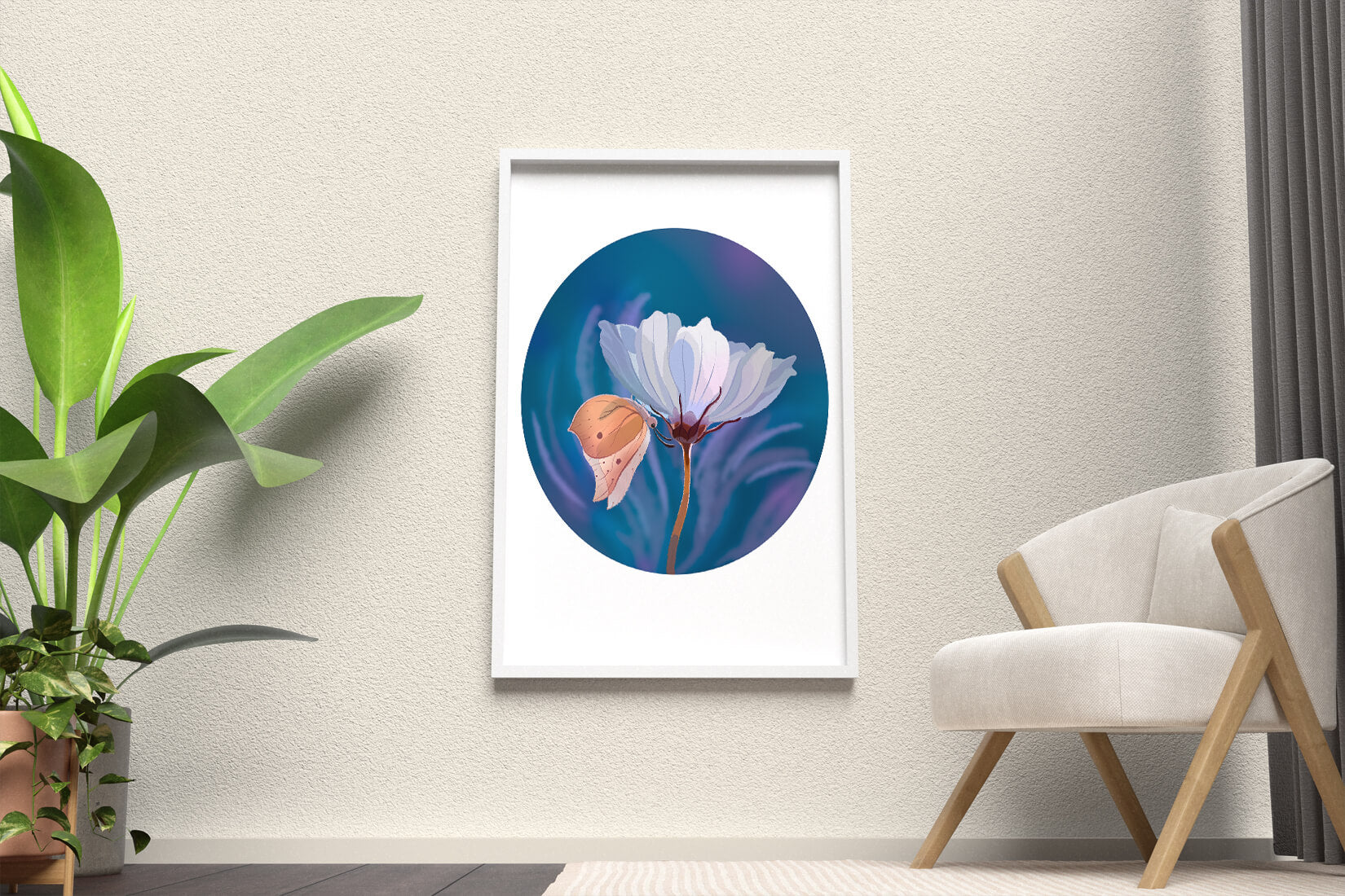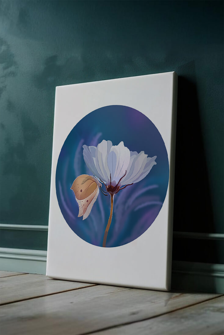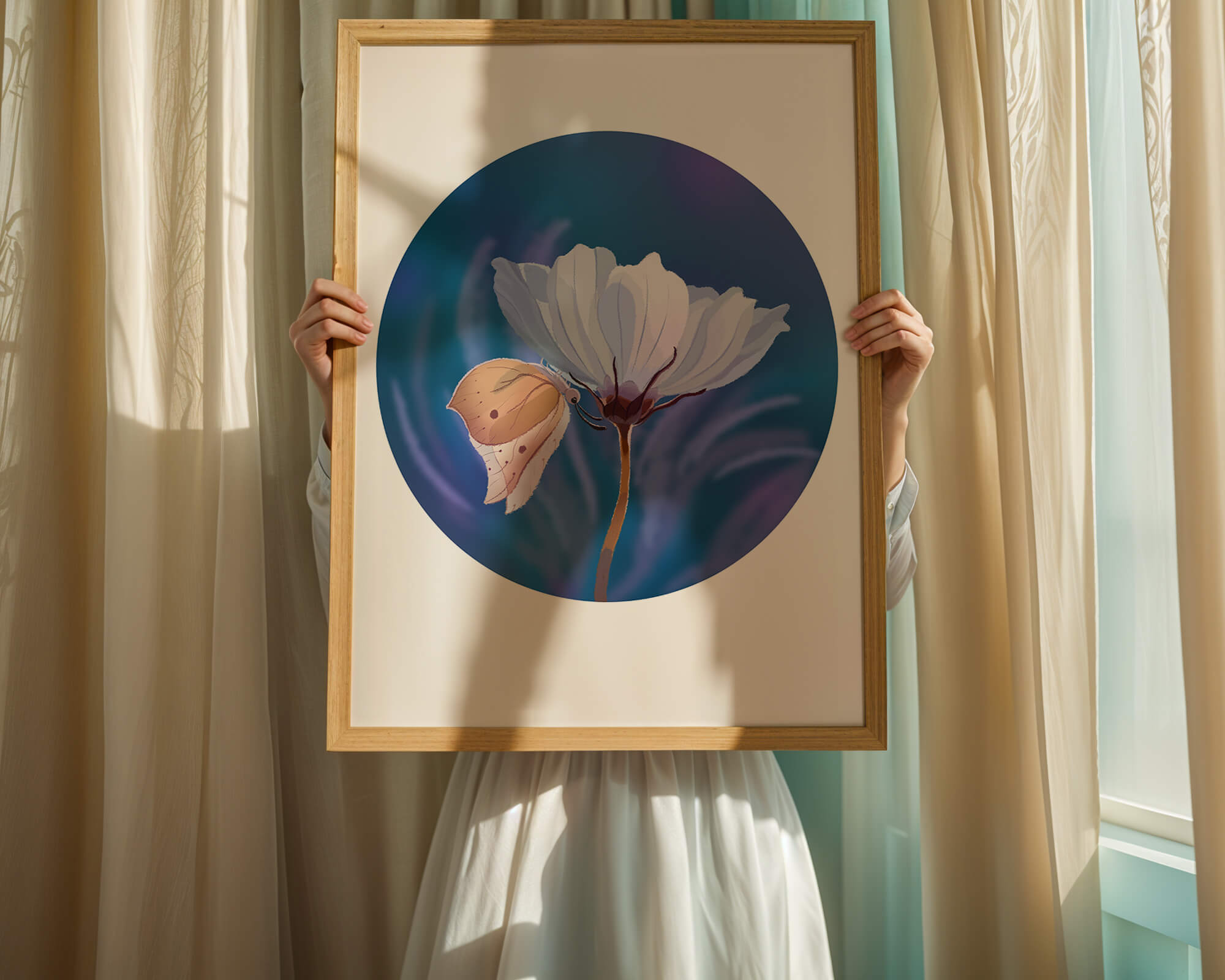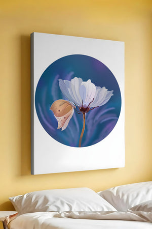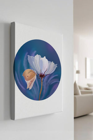 The artwork showcases an elegant balance between the intricate design of the butterfly and the smooth, gentle curves of the flower. The blue background enhances the tranquility of the scene, making it a perfect addition to any space seeking a touch of natures elegance. The subtle play of colors and shadows adds depth and life to the composition, drawing the viewer into its serene world.Its an ideal piece for rooms looking to infuse a sense of peacefulness and natural beauty. Whether displayed in a living room, bedroom, or office, this illustration can bring a soothing and visually appealing presence, making it a timeless choice for art lovers.| Type |