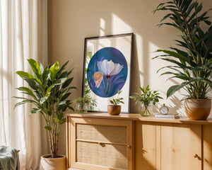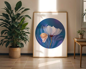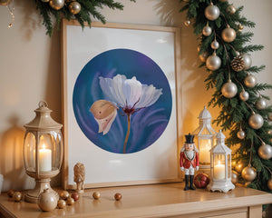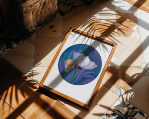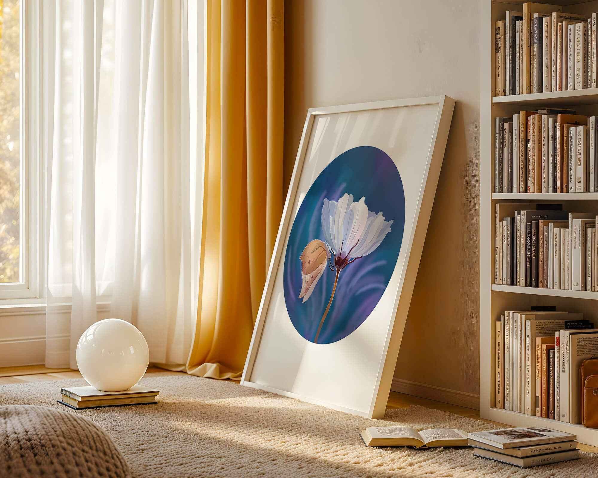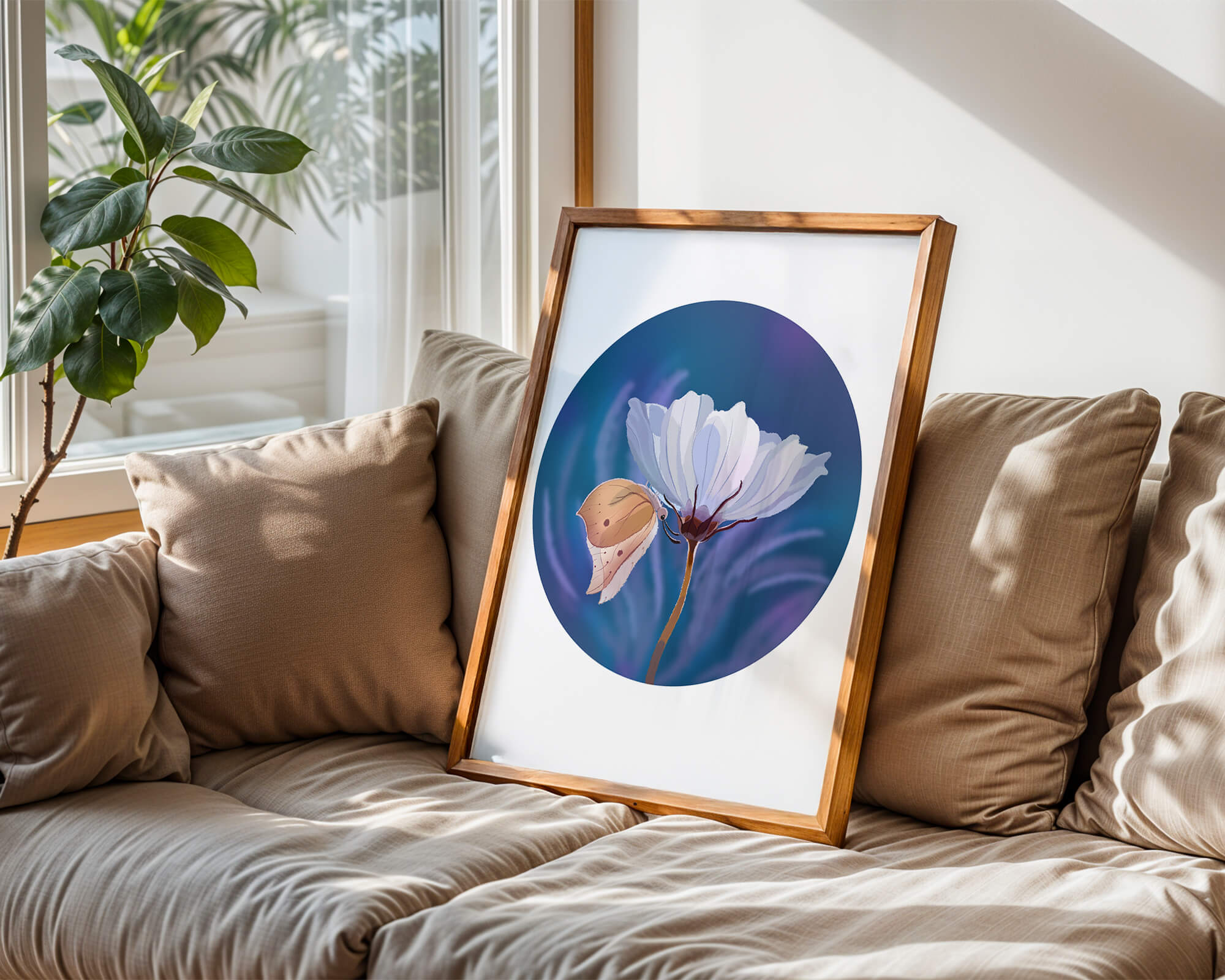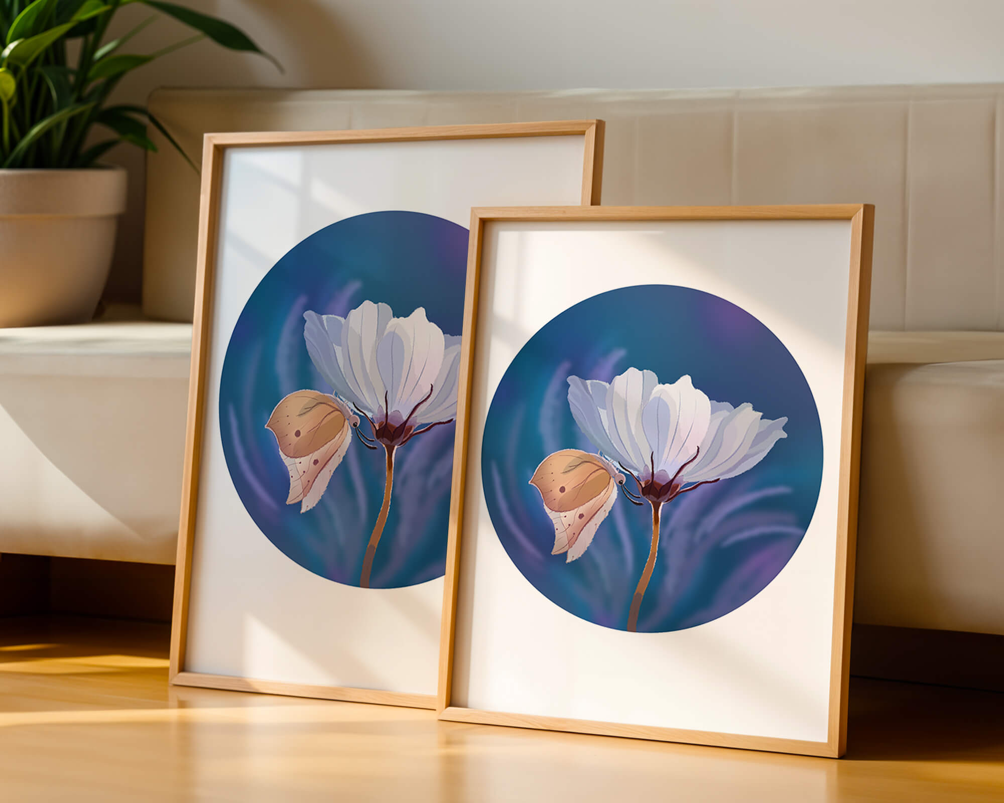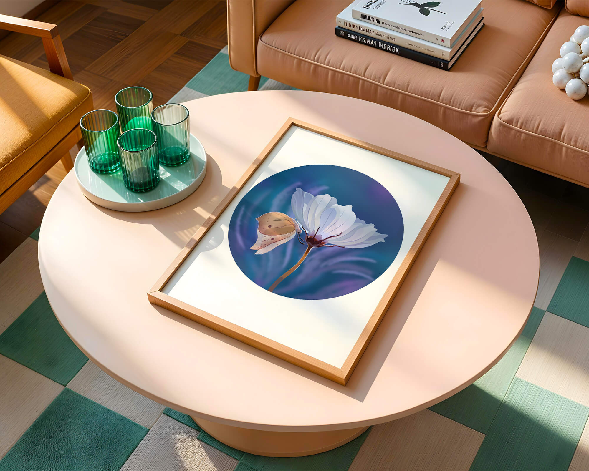 The artwork showcases an elegant balance between the intricate design of the butterfly and the smooth, gentle curves of the flower. The blue background enhances the tranquility of the scene, making it a perfect addition to any space seeking a touch of natures elegance. The subtle play of colors and shadows adds depth and life to the composition, drawing the viewer into its serene world.Its an ideal piece for rooms looking to infuse a sense of peacefulness and natural beauty. Whether displayed in a living room, bedroom, or office, this illustration can bring a soothing and visually appealing presence, making it a timeless choice for art lovers.| Type |