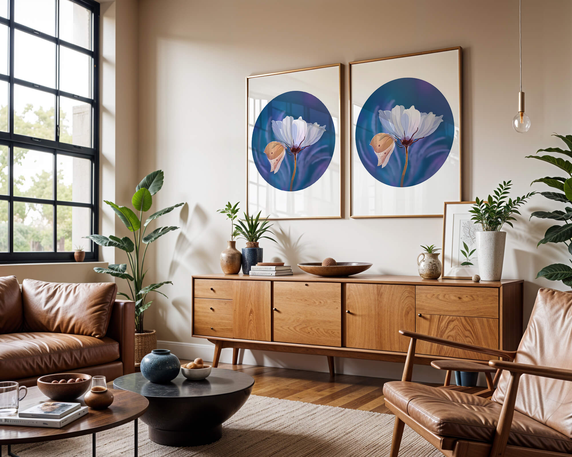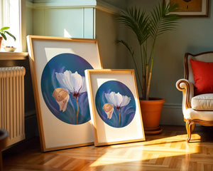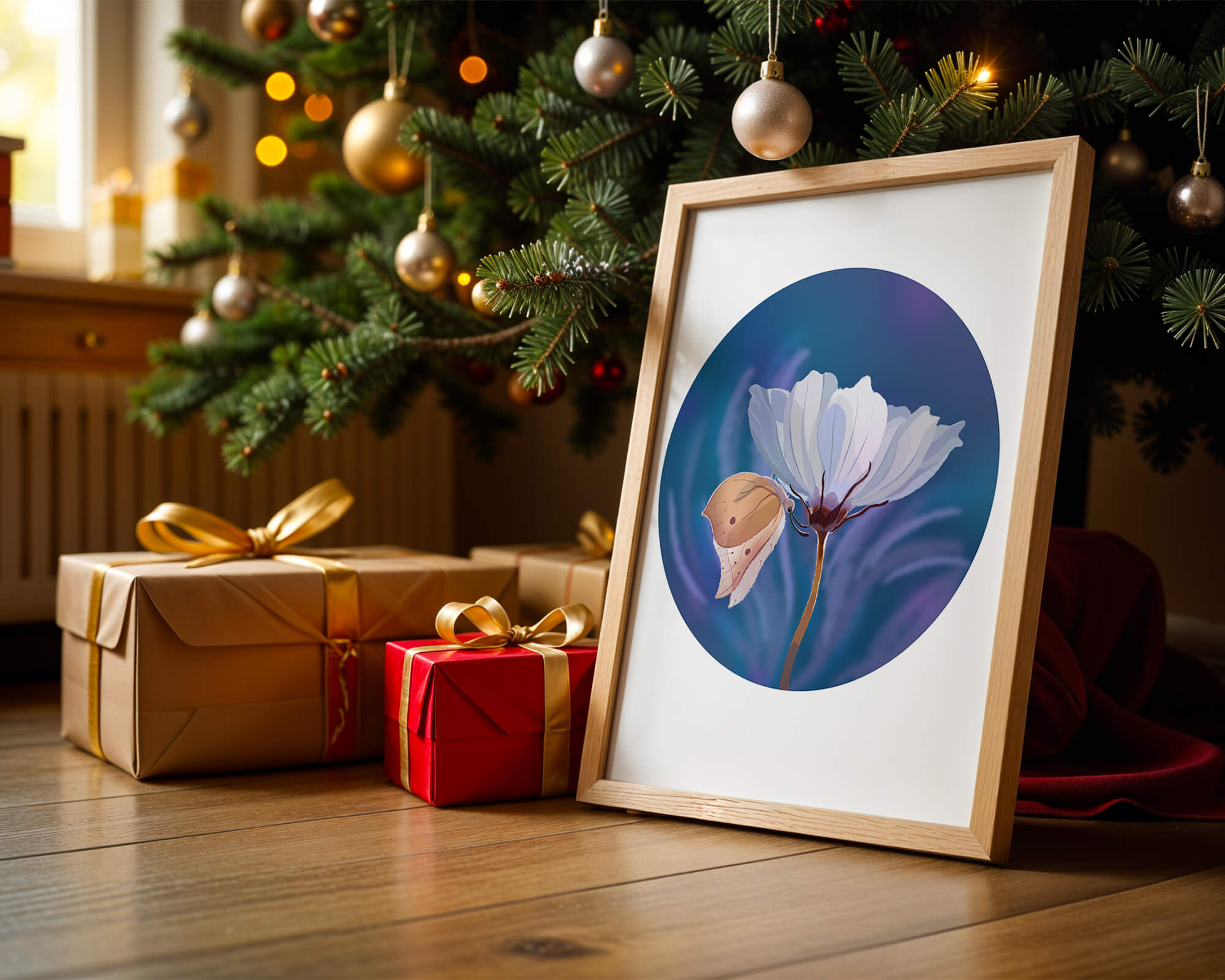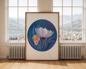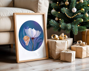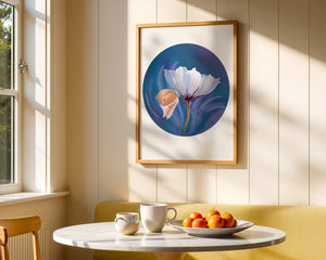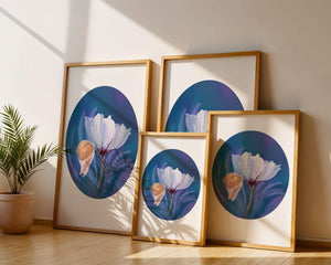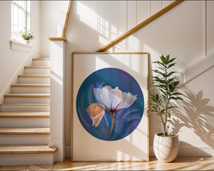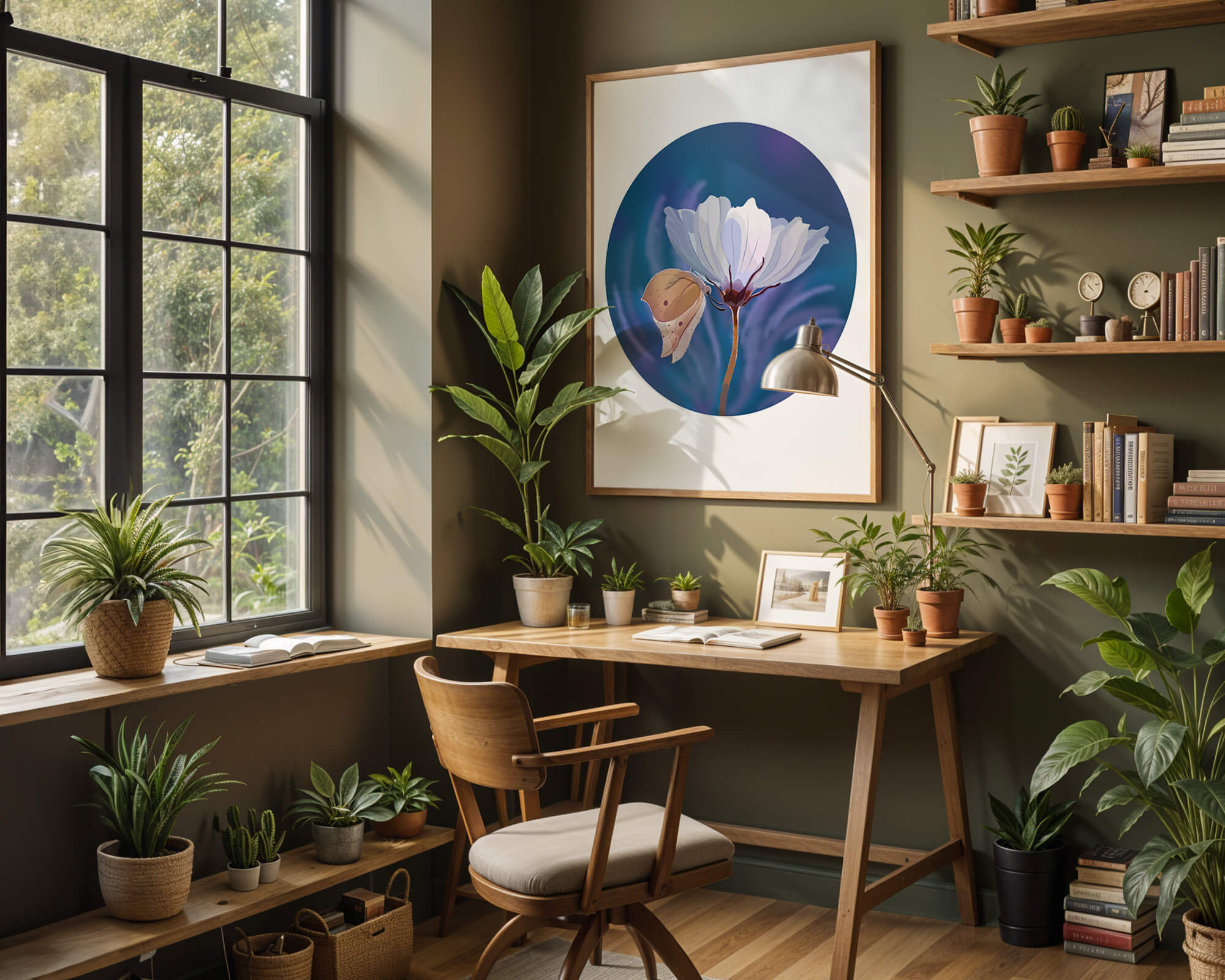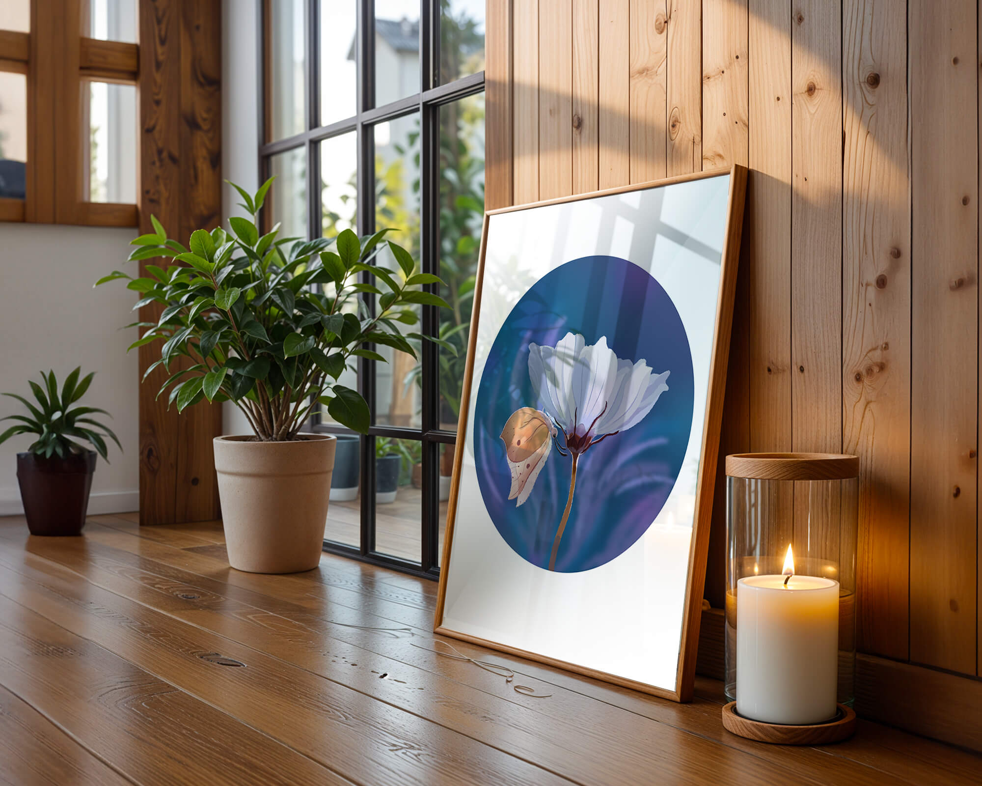 The artwork showcases an elegant balance between the intricate design of the butterfly and the smooth, gentle curves of the flower. The blue background enhances the tranquility of the scene, making it a perfect addition to any space seeking a touch of natures elegance. The subtle play of colors and shadows adds depth and life to the composition, drawing the viewer into its serene world.Its an ideal piece for rooms looking to infuse a sense of peacefulness and natural beauty. Whether displayed in a living room, bedroom, or office, this illustration can bring a soothing and visually appealing presence, making it a timeless choice for art lovers.| Type |