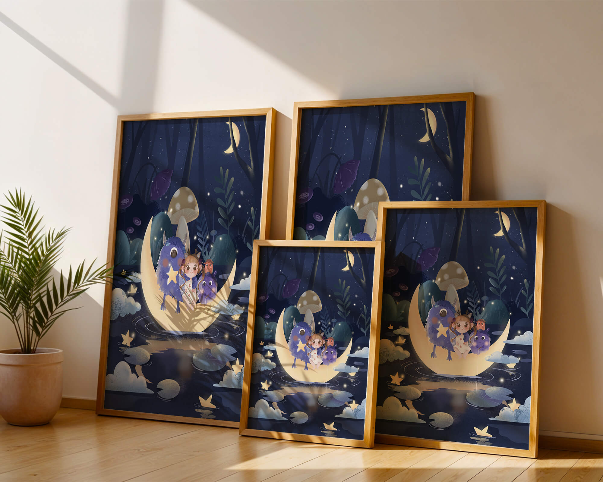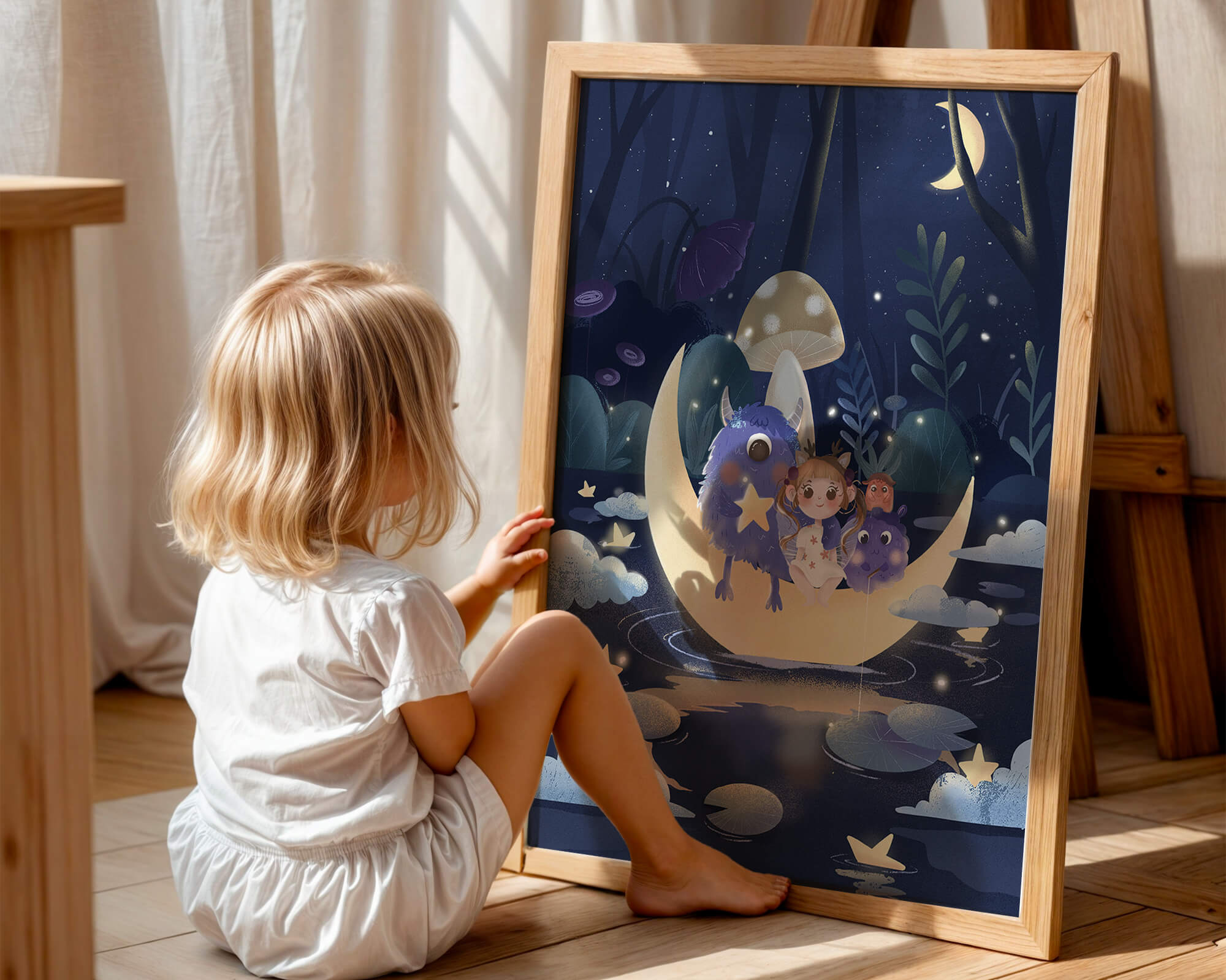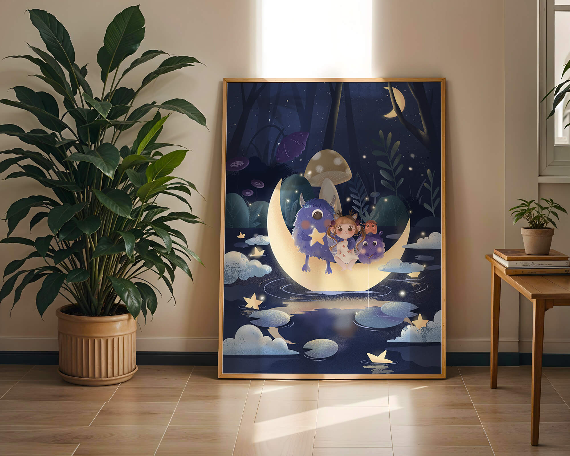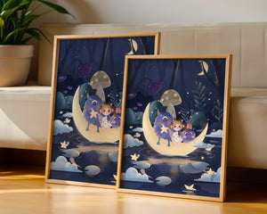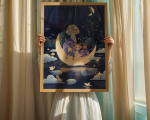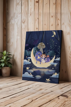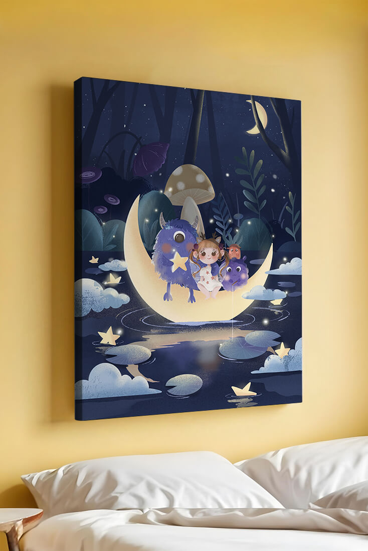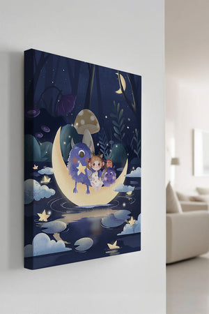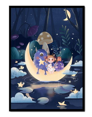 In the depths of an enchanting forest, under the soft light of the moon, a little girl embarks on a surreal adventure. Seated comfortably alongside two endearing monsters, the trio is serenely perched on a luminous crescent moon that floats gently above a reflective, star-speckled pond. The surrounding landscape is dotted with giant mushrooms and shadowy foliage, creating a mystical atmosphere filled with possibilities.The scene captures the essence of a childs dream, where the boundaries of reality and fantasy blur, inviting the viewer into a world where imagination reigns supreme. The playful interaction between the girl and her monster companions invites thoughts of companionship and| Type |