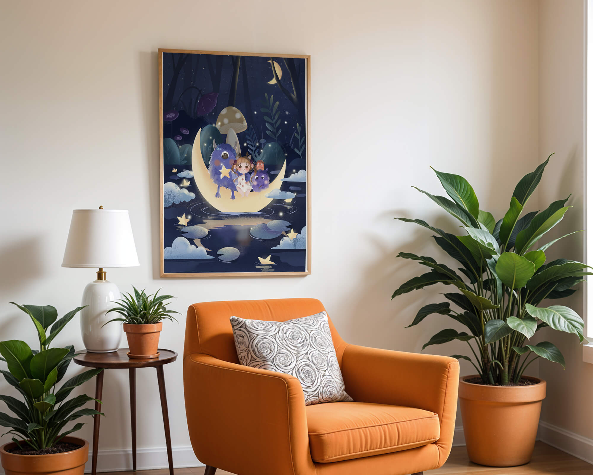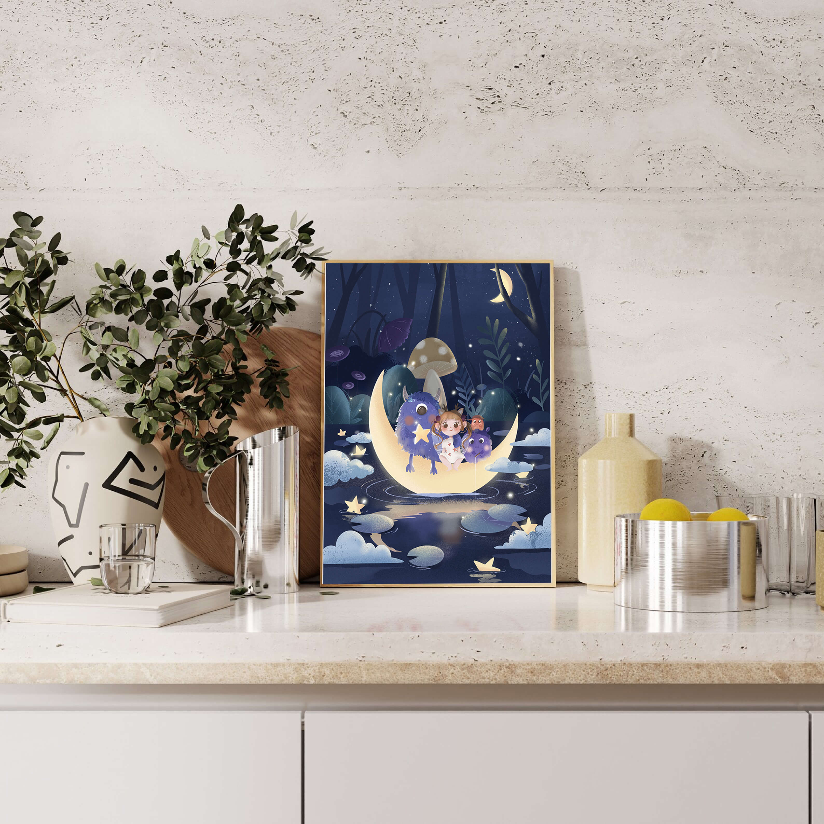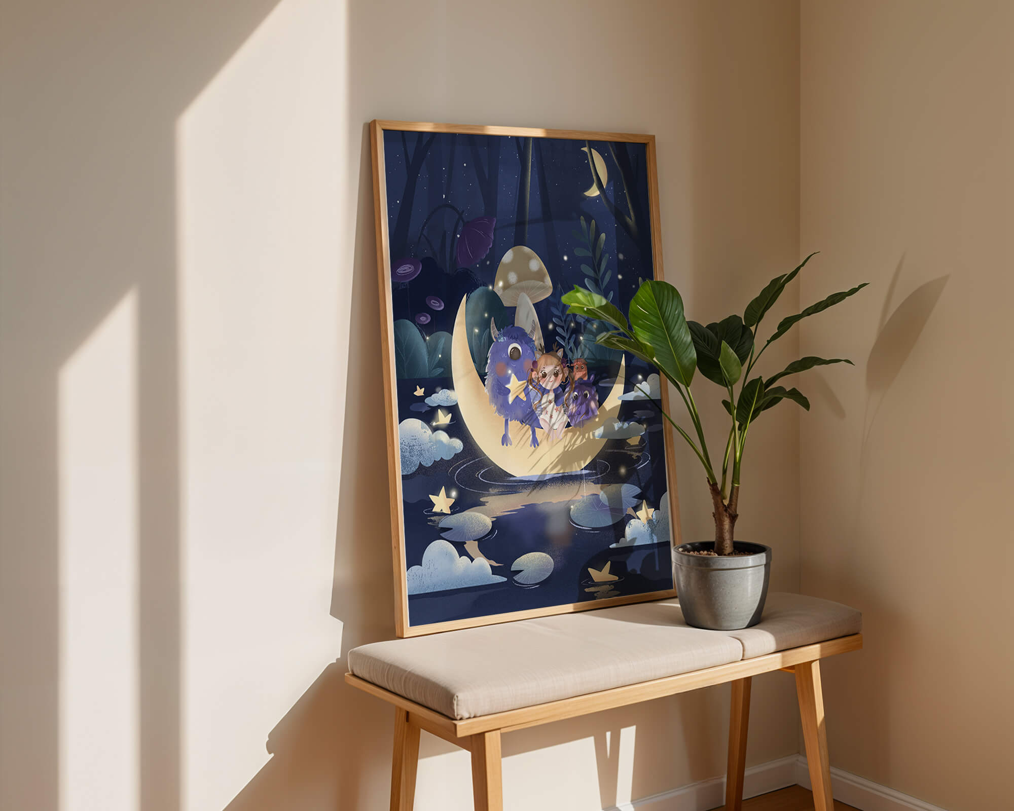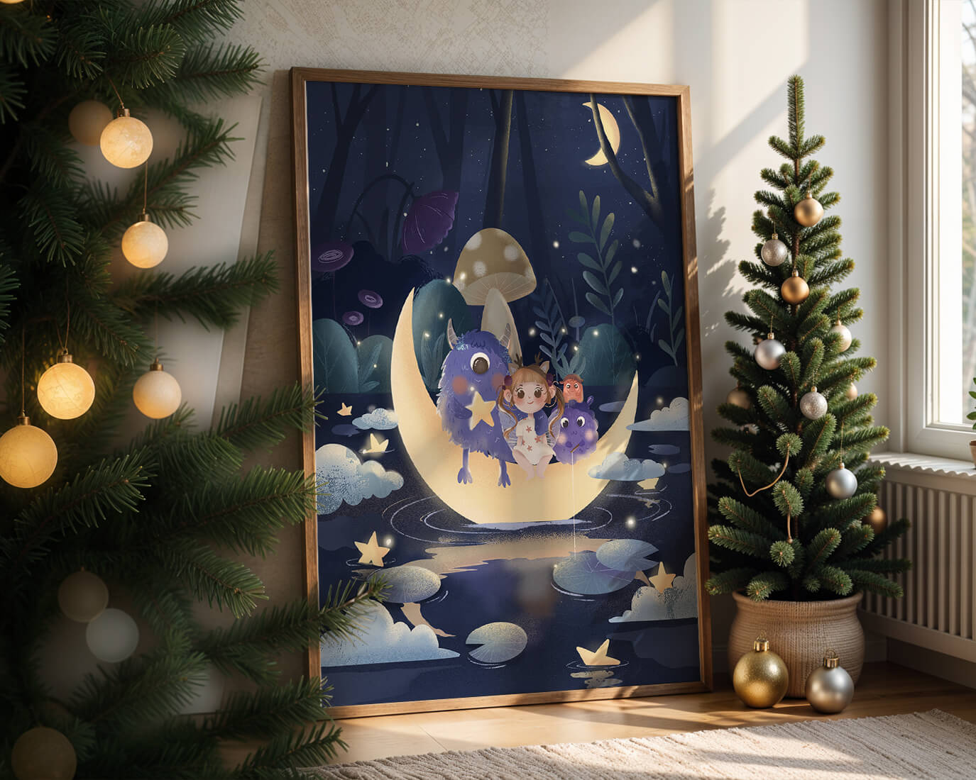 In the depths of an enchanting forest, under the soft light of the moon, a little girl embarks on a surreal adventure. Seated comfortably alongside two endearing monsters, the trio is serenely perched on a luminous crescent moon that floats gently above a reflective, star-speckled pond. The surrounding landscape is dotted with giant mushrooms and shadowy foliage, creating a mystical atmosphere filled with possibilities.The scene captures the essence of a childs dream, where the boundaries of reality and fantasy blur, inviting the viewer into a world where imagination reigns supreme. The playful interaction between the girl and her monster companions invites thoughts of companionship and| Type |