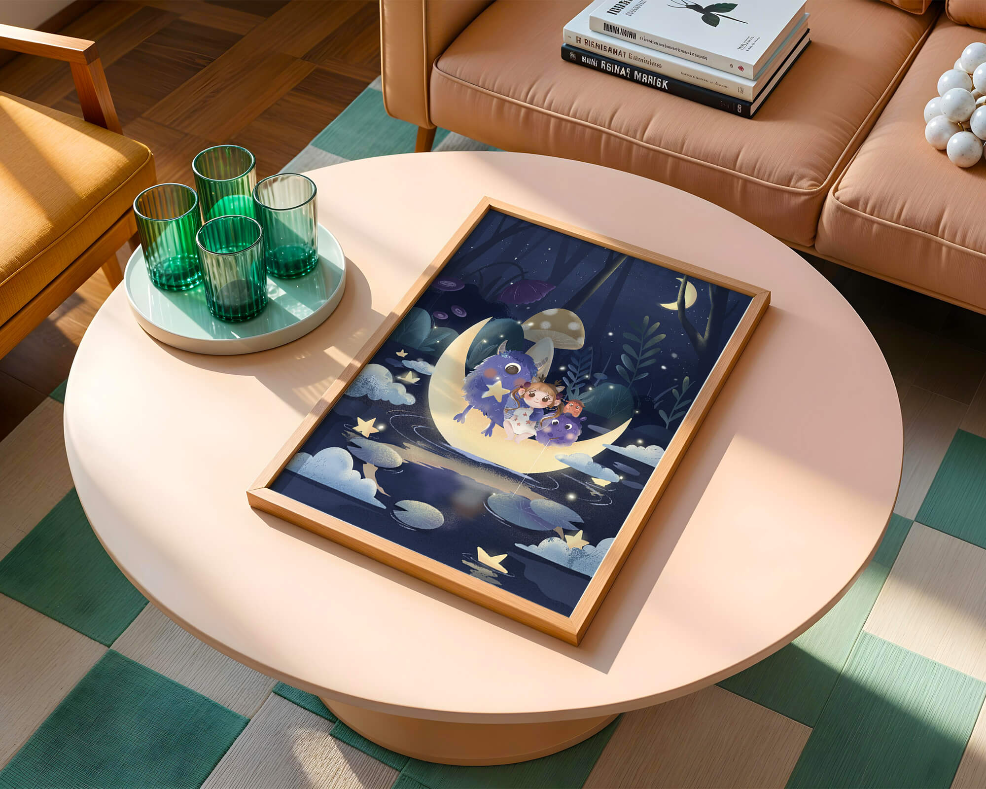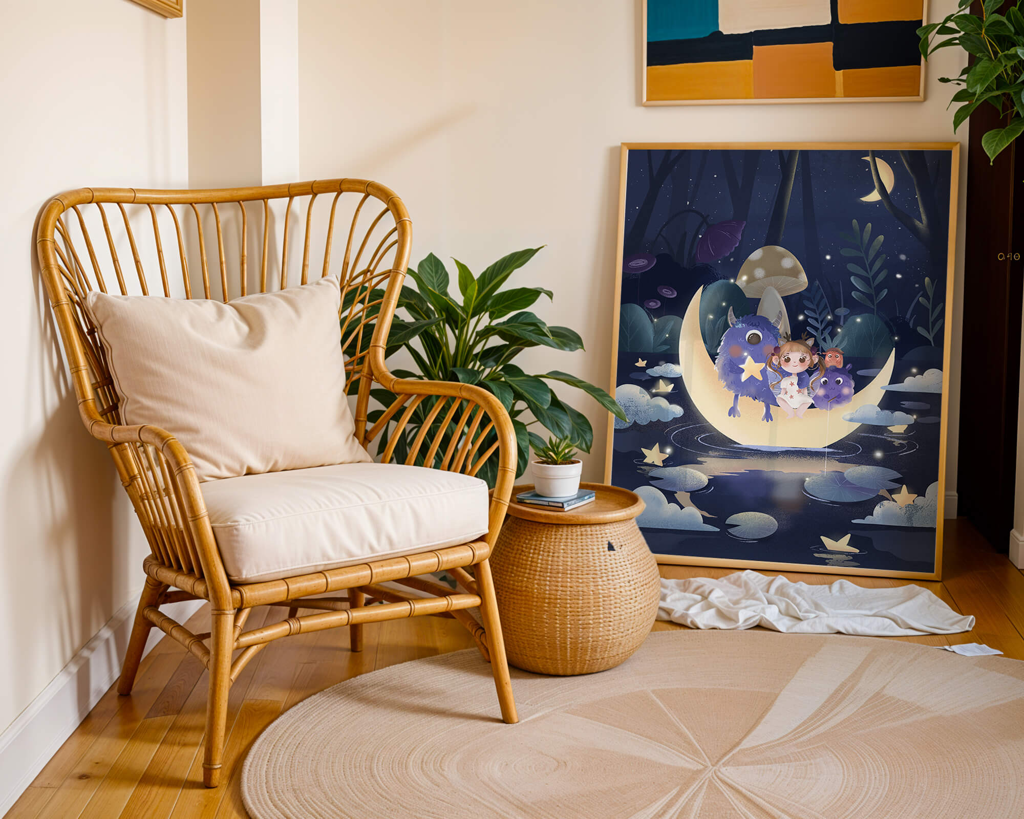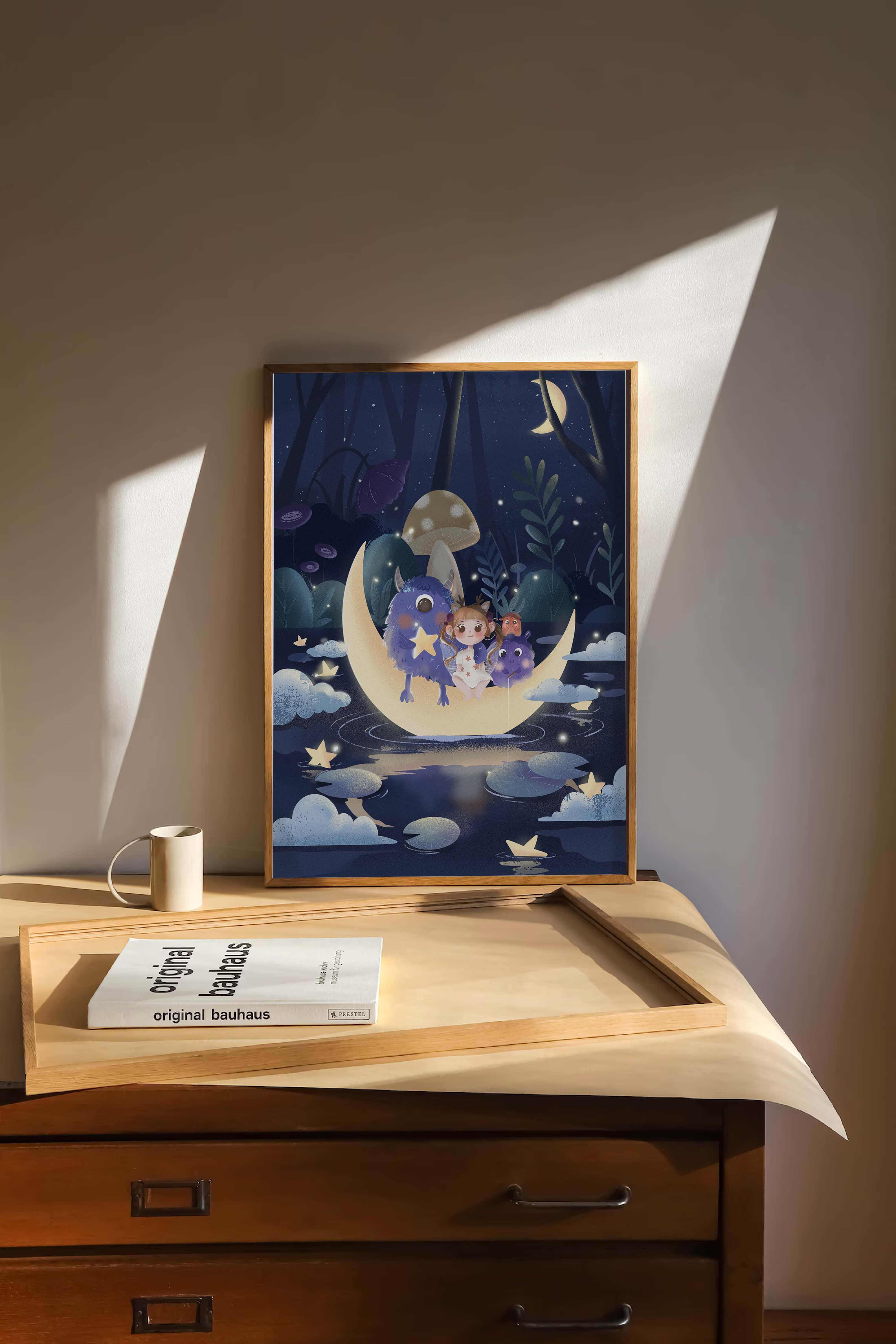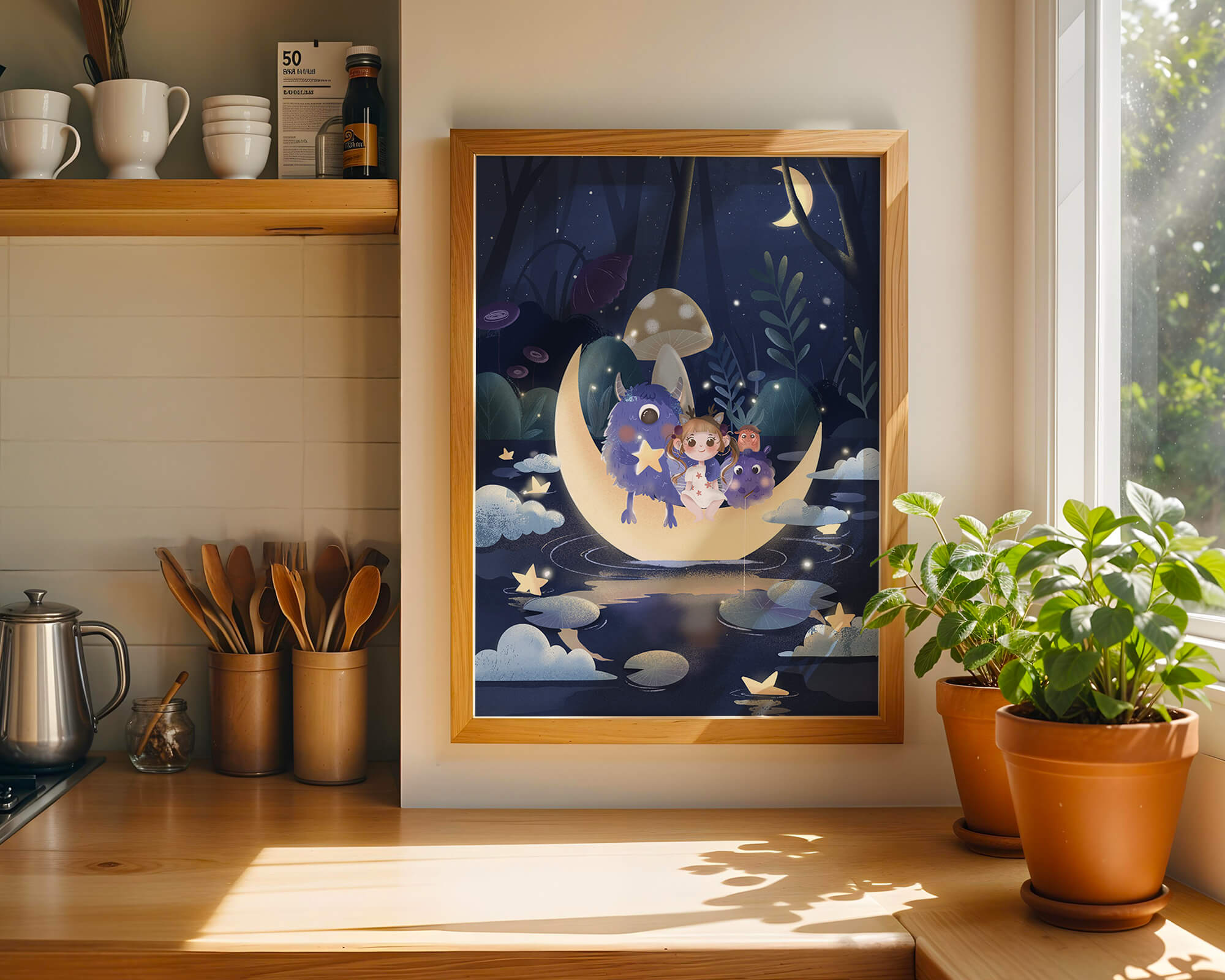 In the depths of an enchanting forest, under the soft light of the moon, a little girl embarks on a surreal adventure. Seated comfortably alongside two endearing monsters, the trio is serenely perched on a luminous crescent moon that floats gently above a reflective, star-speckled pond. The surrounding landscape is dotted with giant mushrooms and shadowy foliage, creating a mystical atmosphere filled with possibilities.The scene captures the essence of a childs dream, where the boundaries of reality and fantasy blur, inviting the viewer into a world where imagination reigns supreme. The playful interaction between the girl and her monster companions invites thoughts of companionship and| Type |