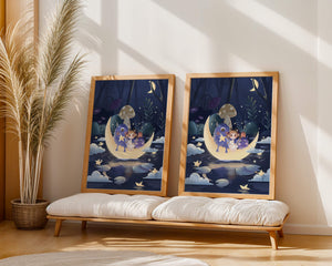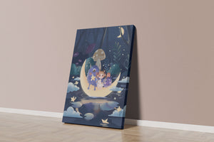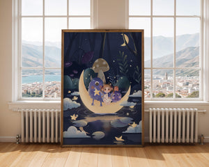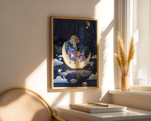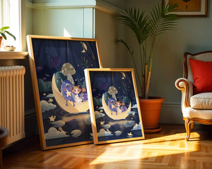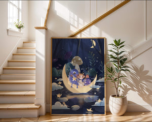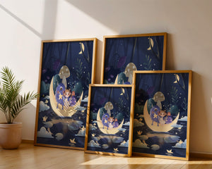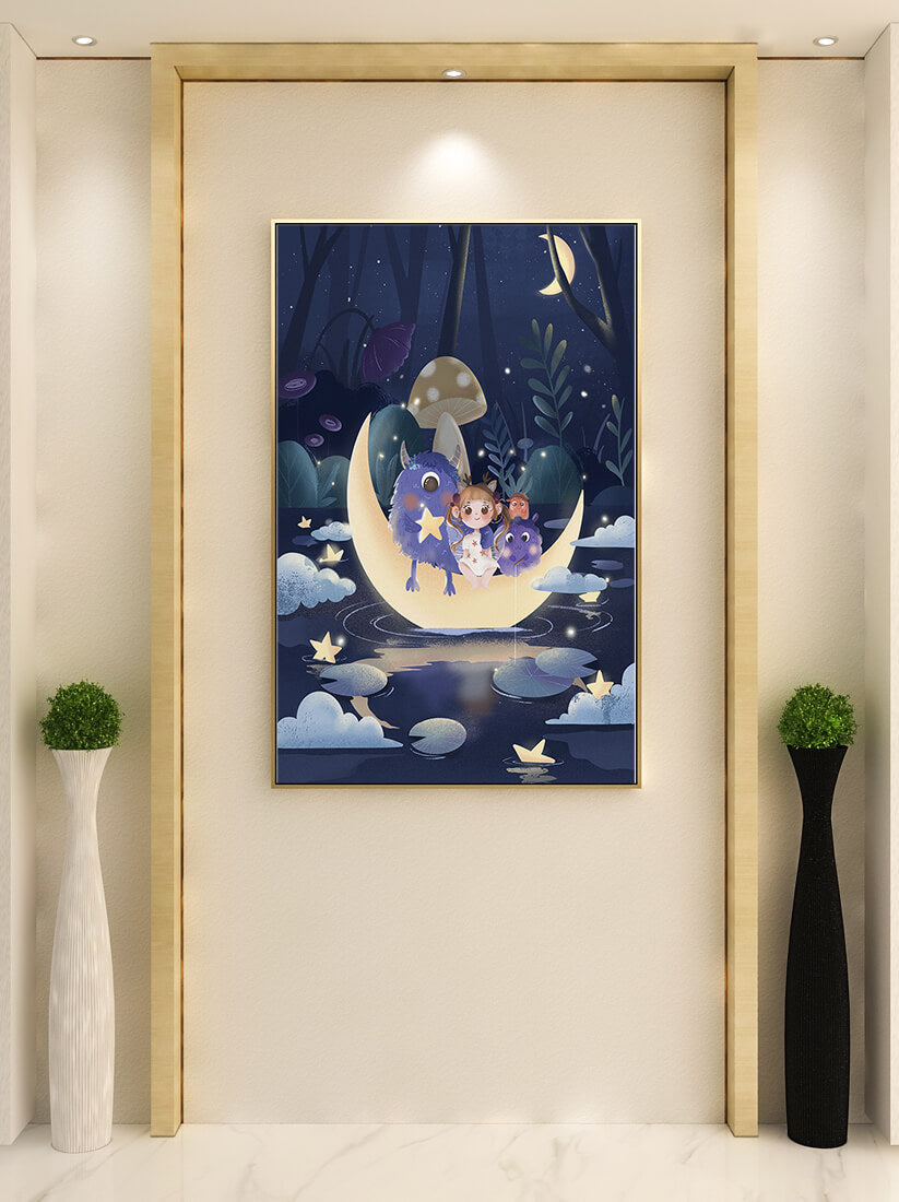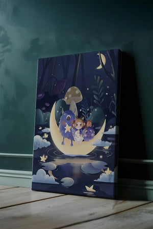 The image presents a whimsical and enchanting night scene where a young girl, accompanied by friendly monsters, sits on a glowing crescent moon. Set in a magical forest, this illustration is rich in fantasy elements that capture the imagination and create a sense of wonder and adventure.