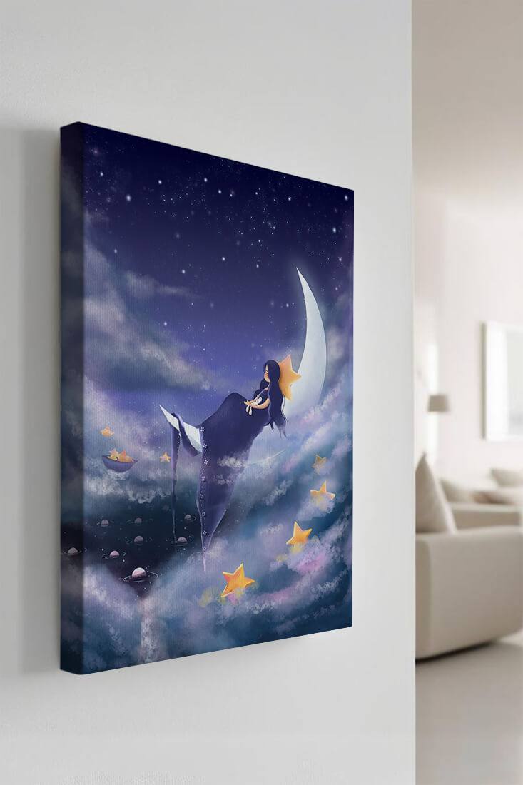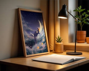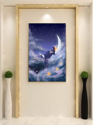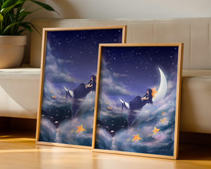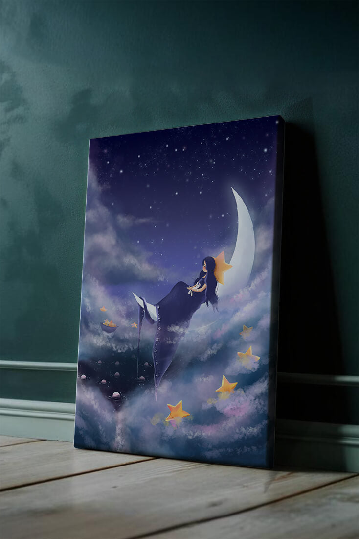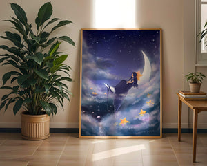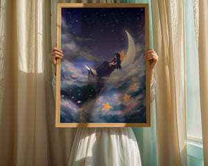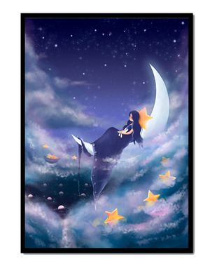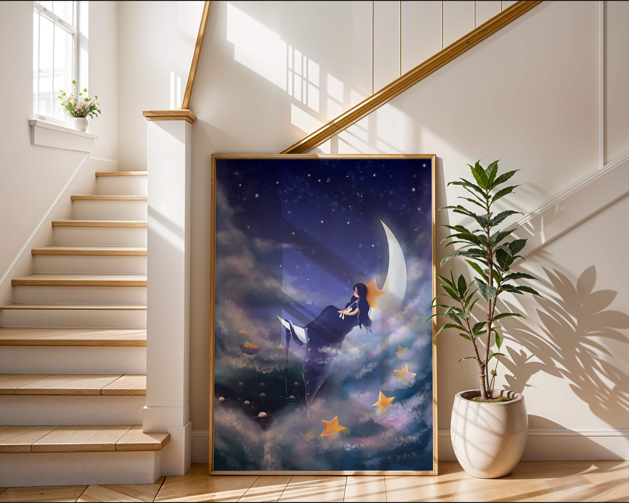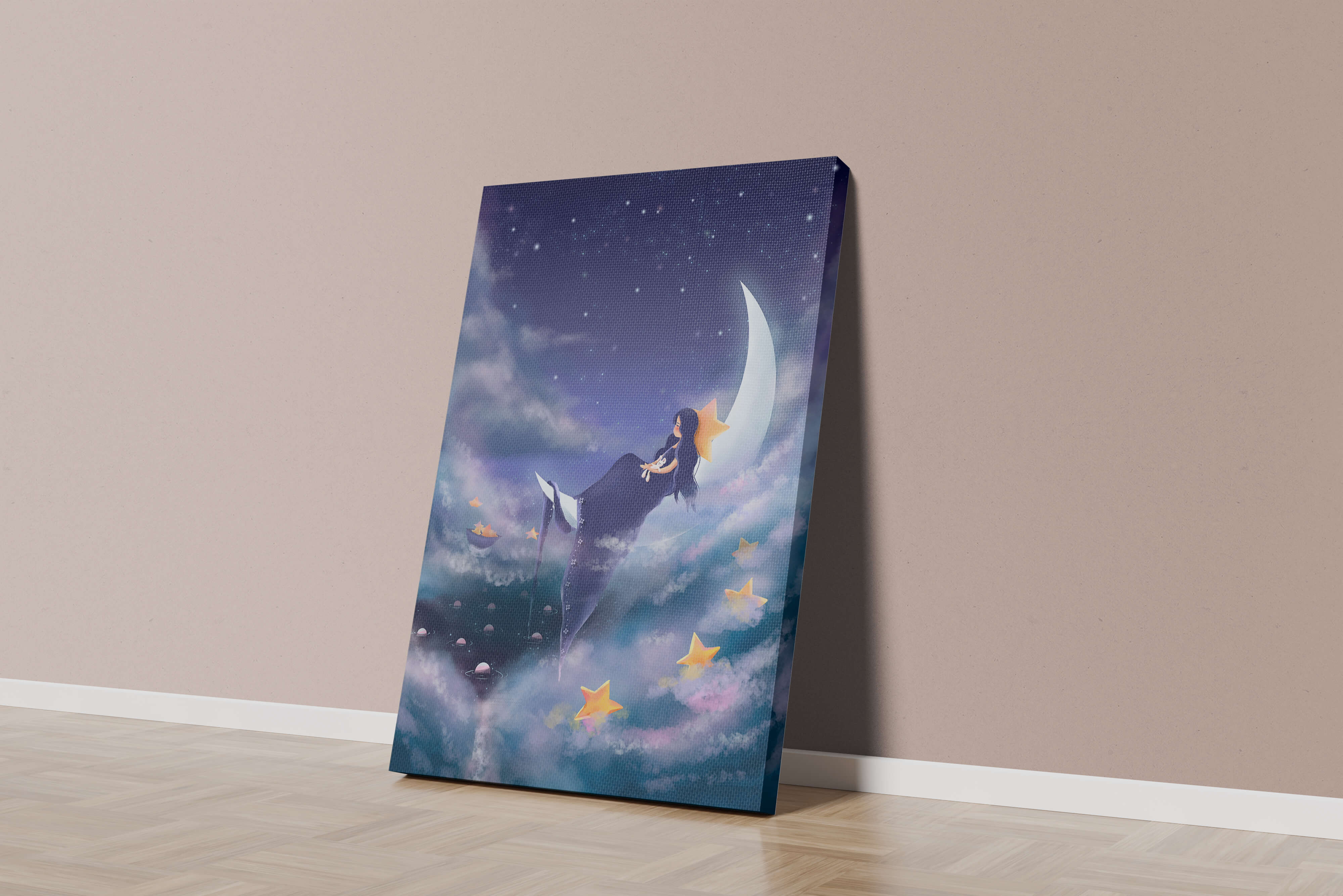This captivating artwork is perfect for adding a touch of magic to any space. The gentle glow from the moon and stars casts a calming effect, creating a soothing ambiance. The night sky blends deep blues and purples, enhancing the celestial theme.Floating among the clouds with a golden star as her companion, the girls peaceful demeanor invites viewers into a world of dreams. This illustration is especially fitting for a childrens room, enveloping it with a sense of wonder and tranquility. Gold accents add a subtle touch of elegance, making this piece suitable for both whimsical and sophisticated settings.| Type |