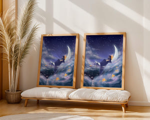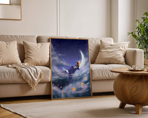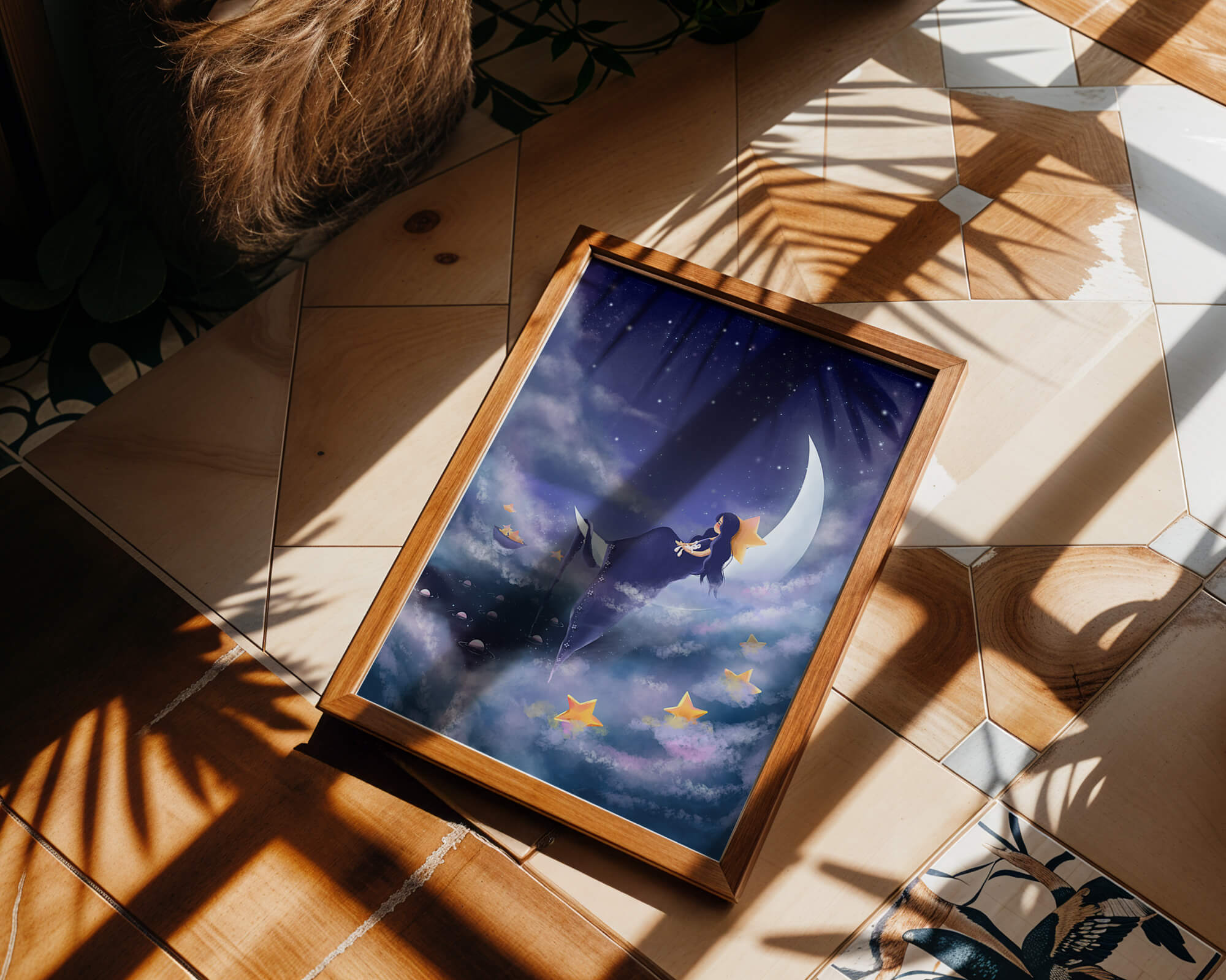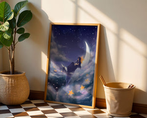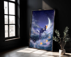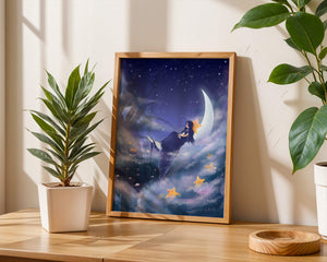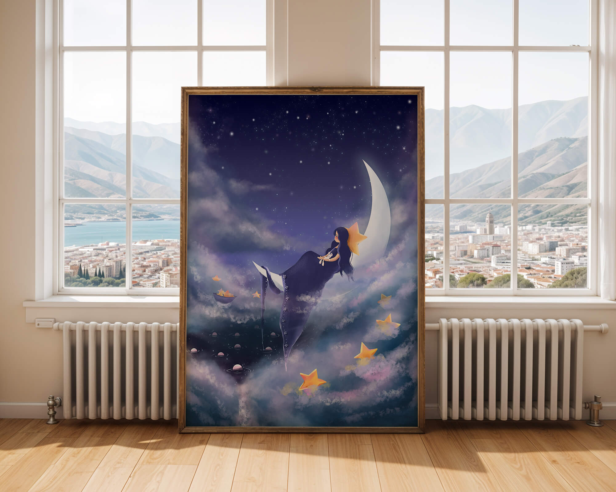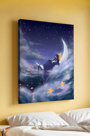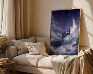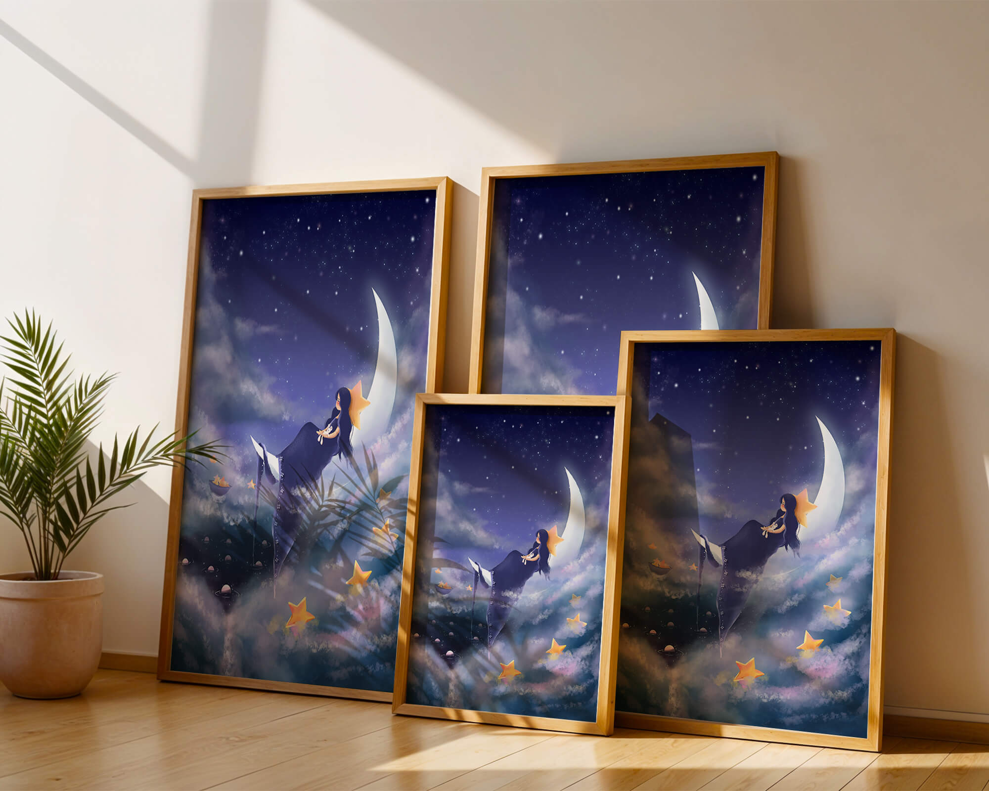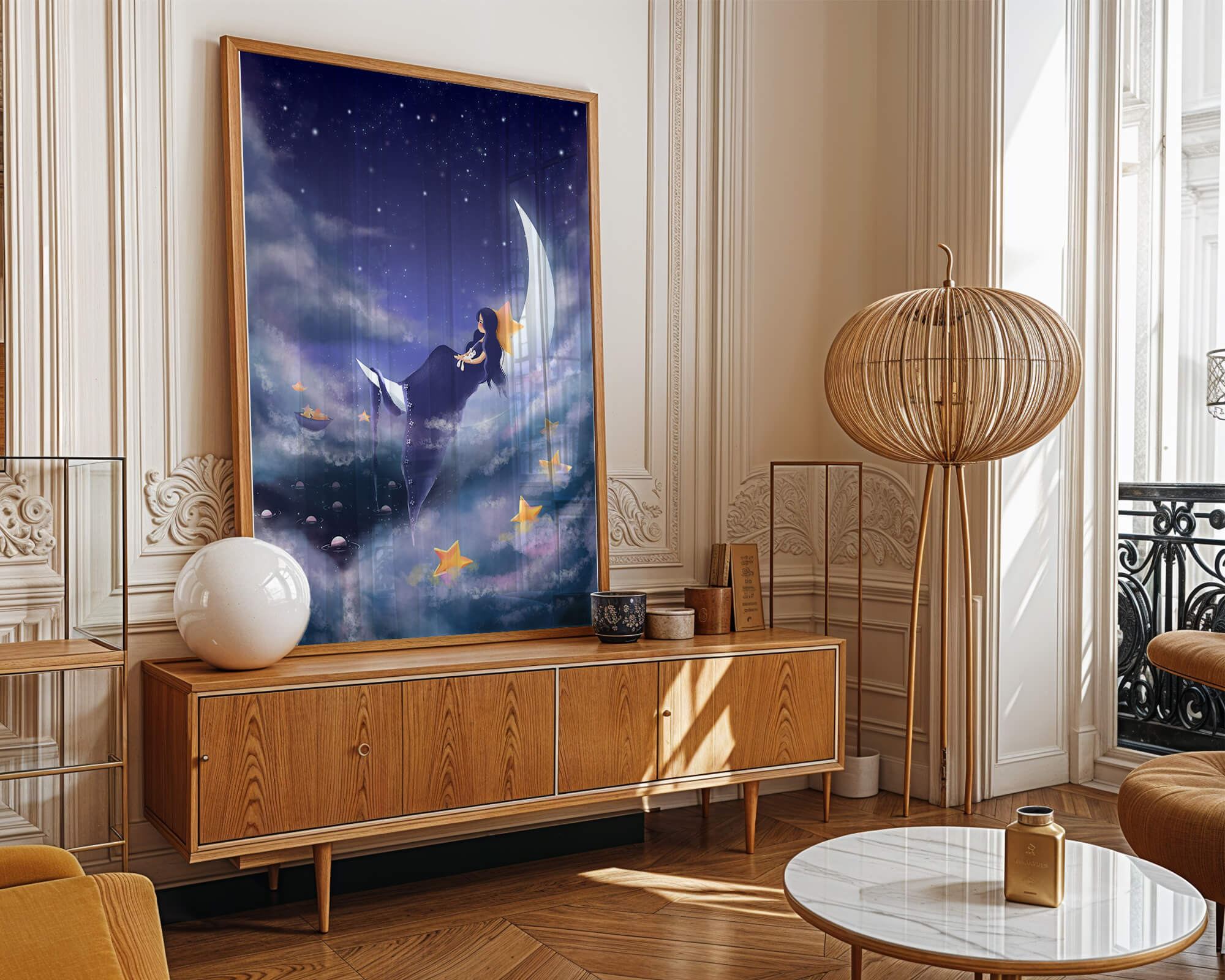 This captivating artwork is perfect for adding a touch of magic to any space. The gentle glow from the moon and stars casts a calming effect, creating a soothing ambiance. The night sky blends deep blues and purples, enhancing the celestial theme.Floating among the clouds with a golden star as her companion, the girls peaceful demeanor invites viewers into a world of dreams. This illustration is especially fitting for a childrens room, enveloping it with a sense of wonder and tranquility. Gold accents add a subtle touch of elegance, making this piece suitable for both whimsical and sophisticated settings.| Type |