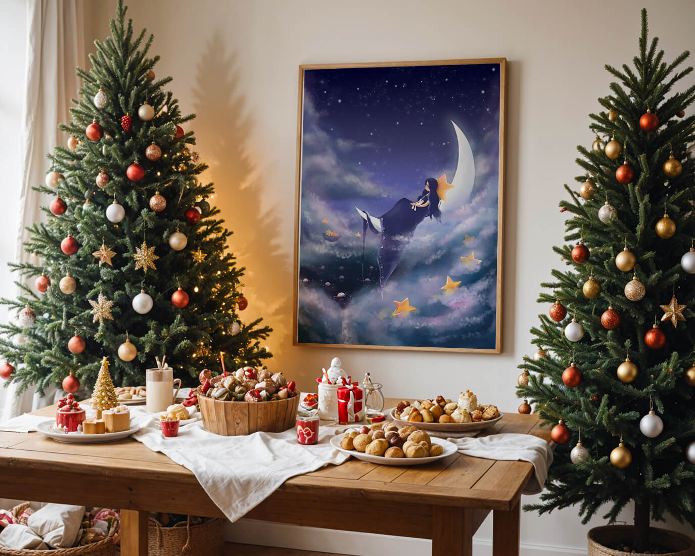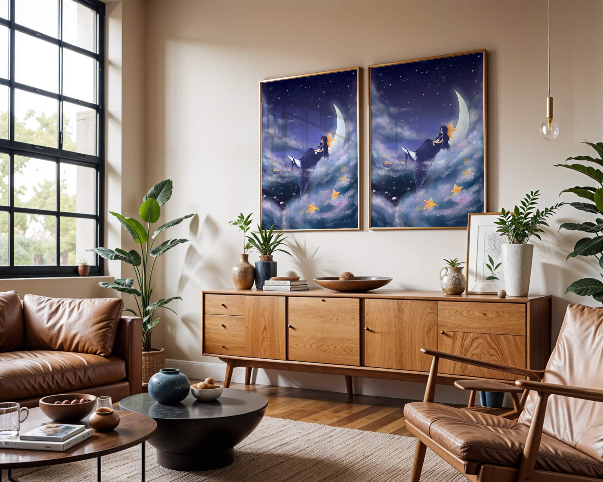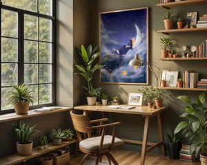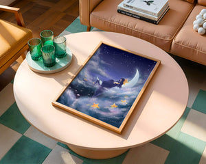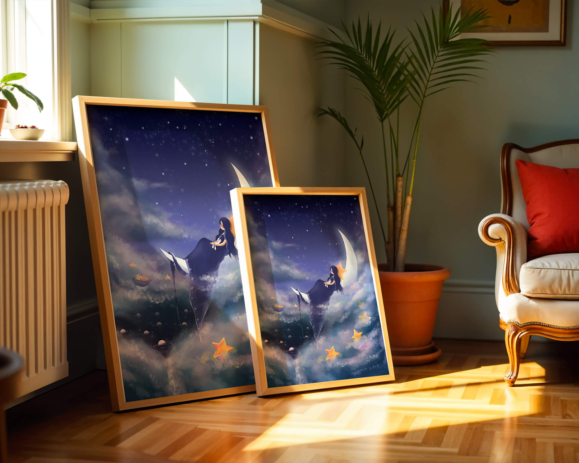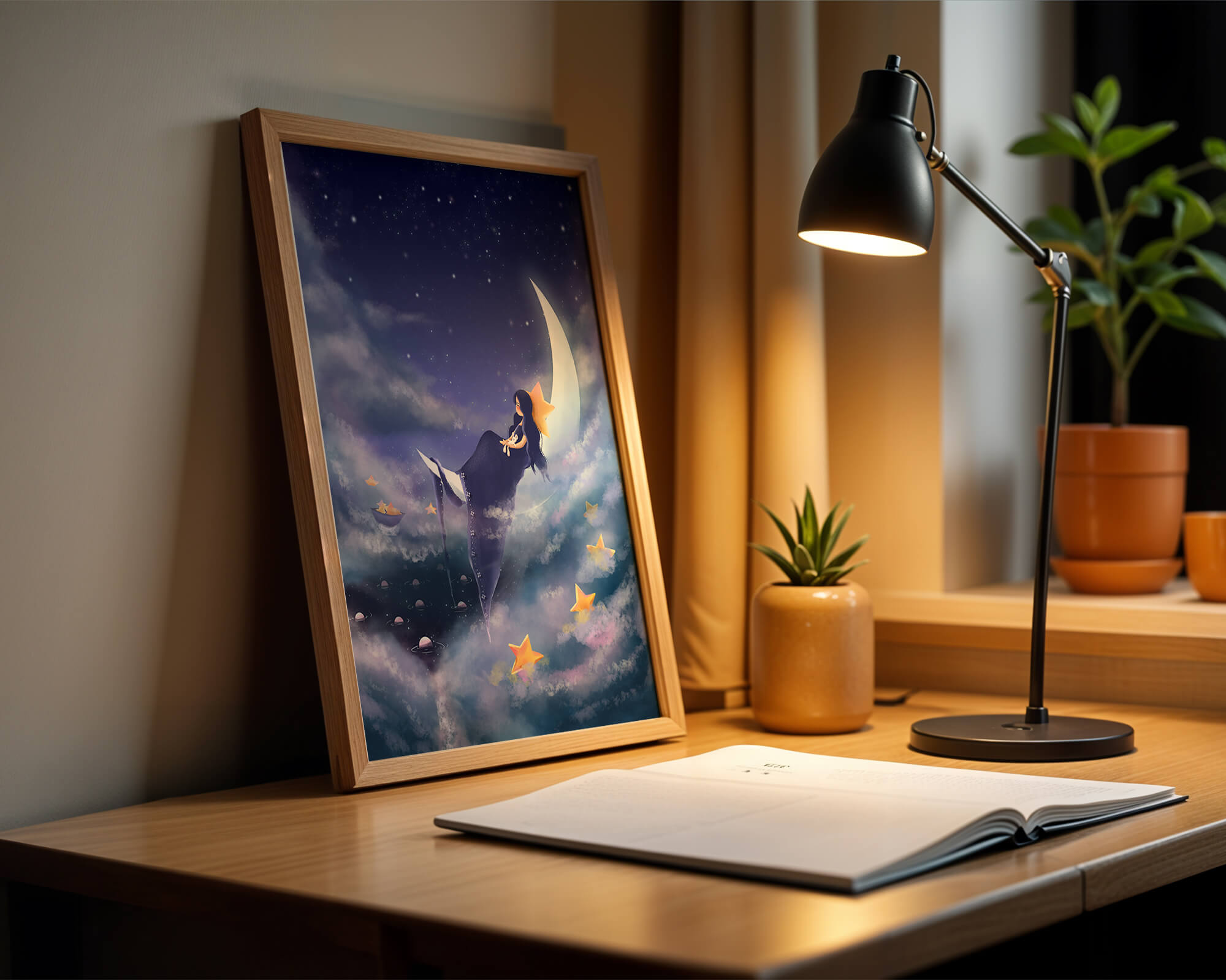 This captivating artwork is perfect for adding a touch of magic to any space. The gentle glow from the moon and stars casts a calming effect, creating a soothing ambiance. The night sky blends deep blues and purples, enhancing the celestial theme.Floating among the clouds with a golden star as her companion, the girls peaceful demeanor invites viewers into a world of dreams. This illustration is especially fitting for a childrens room, enveloping it with a sense of wonder and tranquility. Gold accents add a subtle touch of elegance, making this piece suitable for both whimsical and sophisticated settings.| Type |