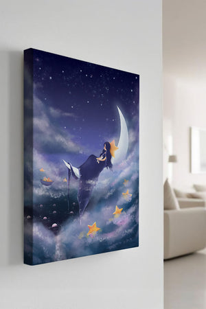 The image reveals a serene night sky scene where a girl sits gracefully on a crescent moon, surrounded by delicate stars. Wispy clouds add to the whimsical atmosphere, creating an enchanting dreamscape ideal for sparking imagination.