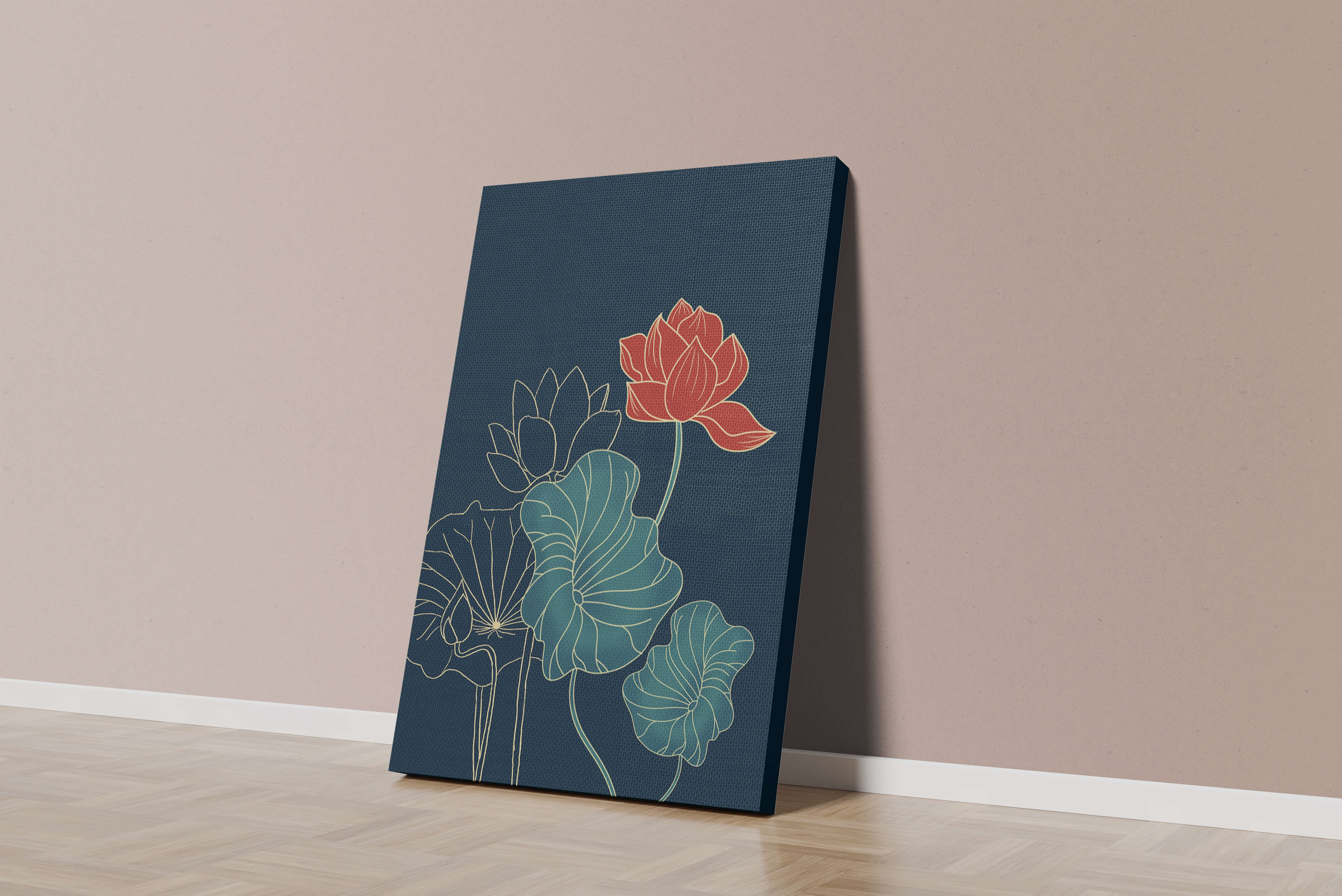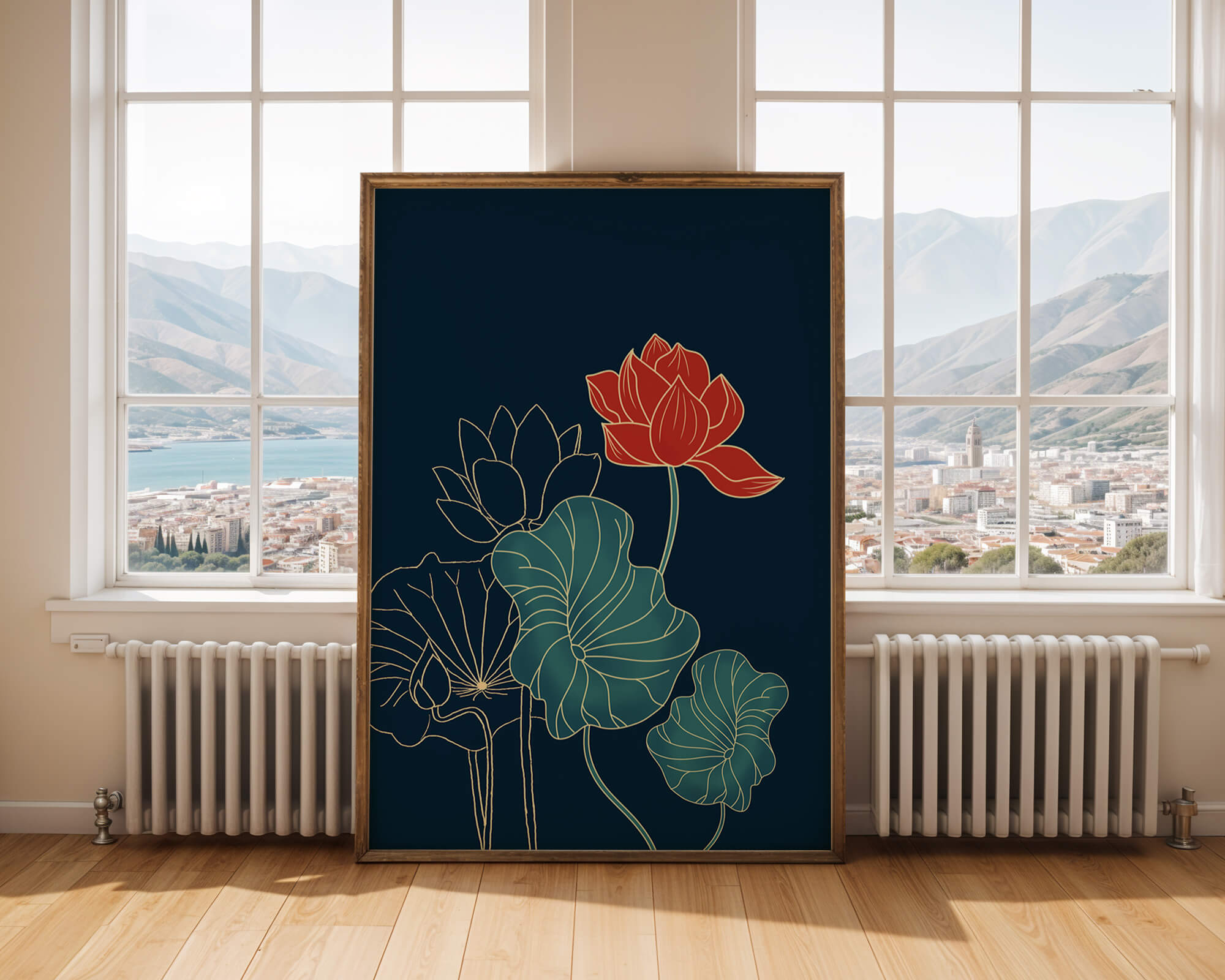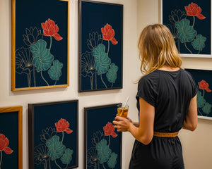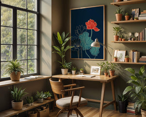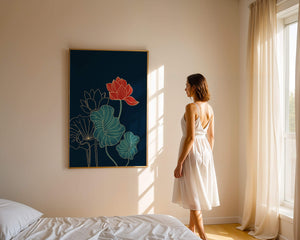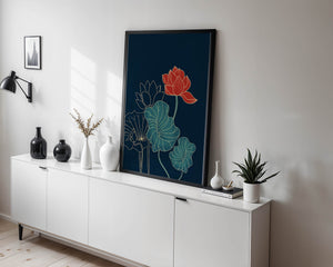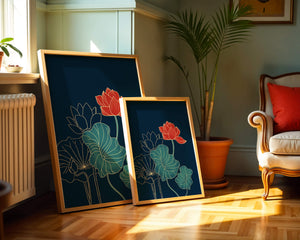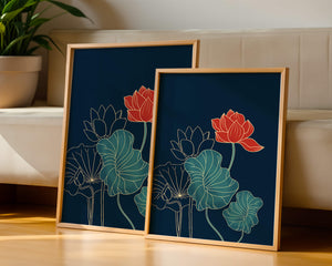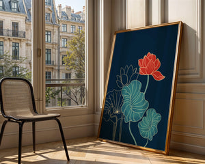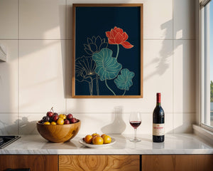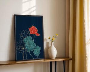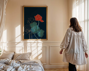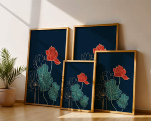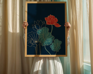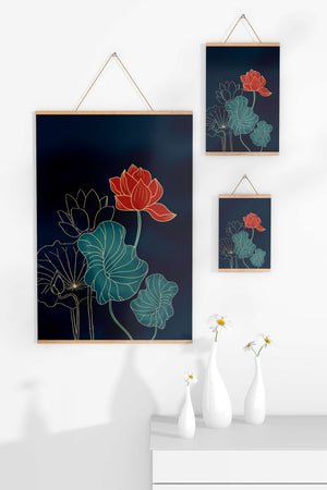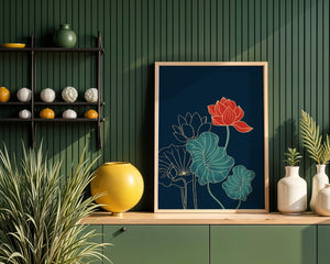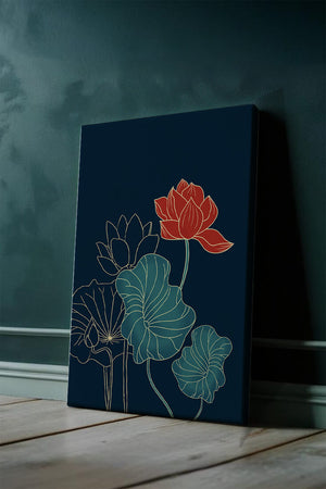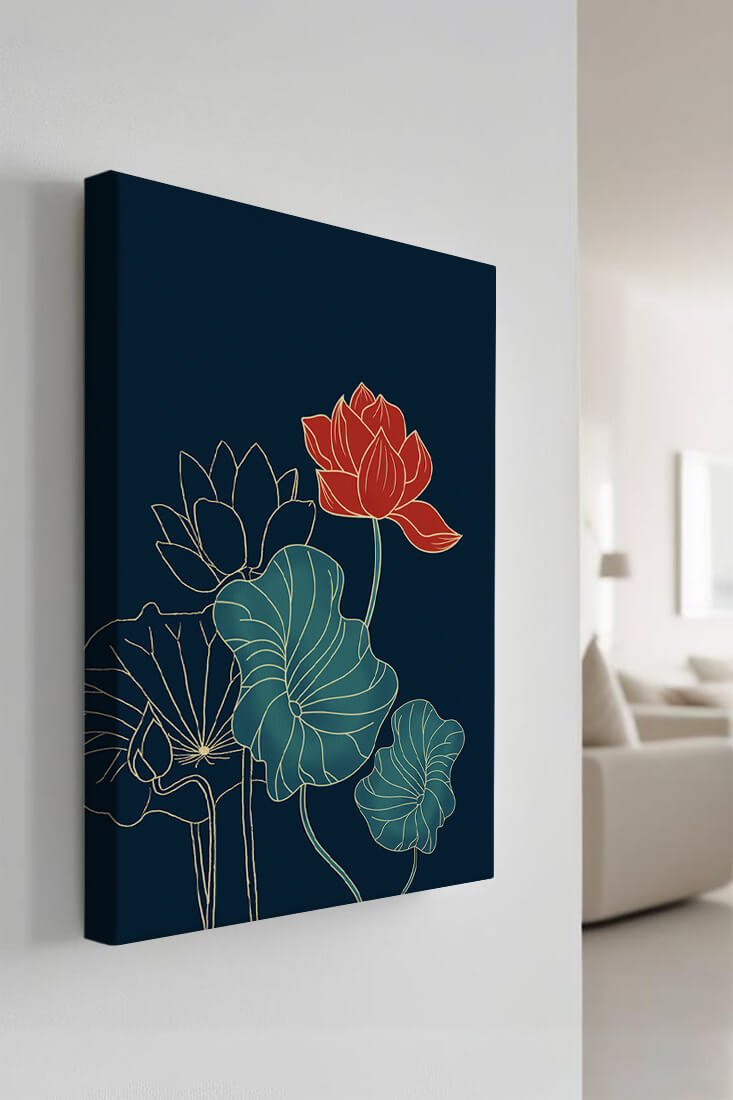 The piece showcases a vibrant red lotus flower standing tall among detailed green leaves and buds. The intricate gold outlines add a touch of sophistication and highlight the delicate structure of each element. The dark background enhances the colors, providing depth and making the flora appear more prominent. This artwork effortlessly combines modern design with classic botanical beauty, making it an ideal addition to any living space. Whether youre looking to add a splash of color or a touch of elegance to your home decor, this floral illustration is a perfect choice.| Type |