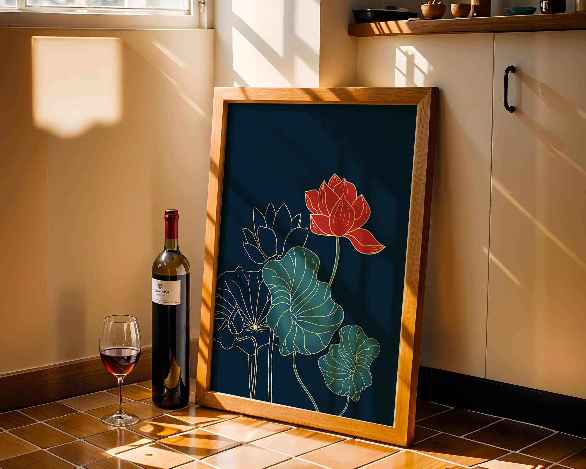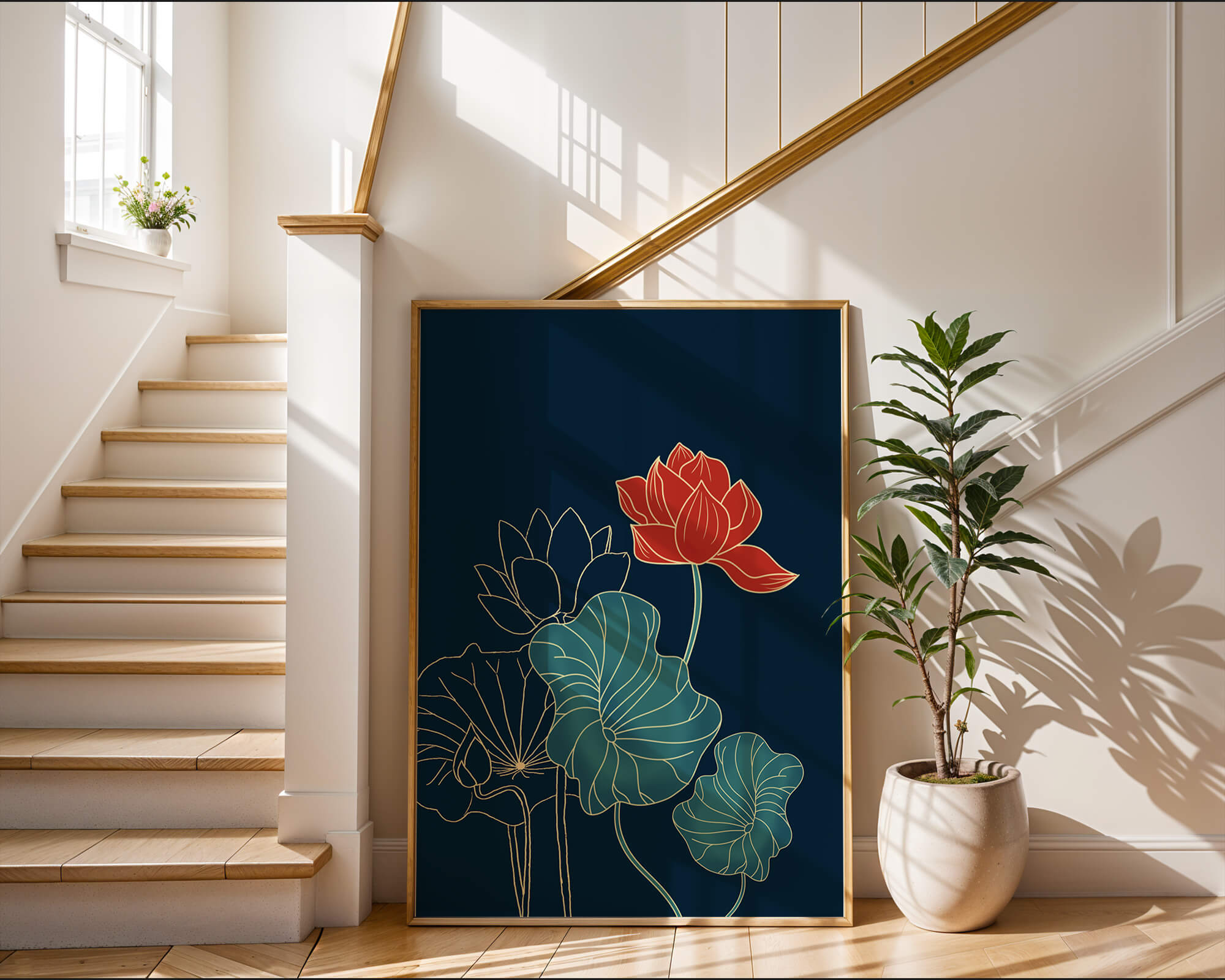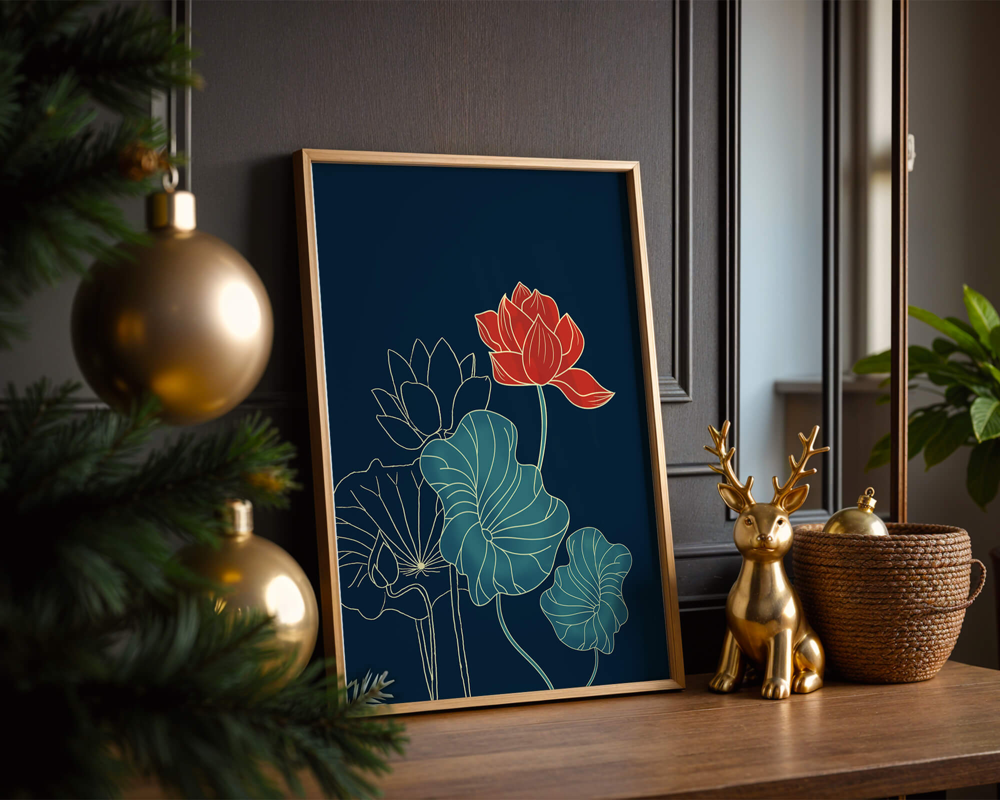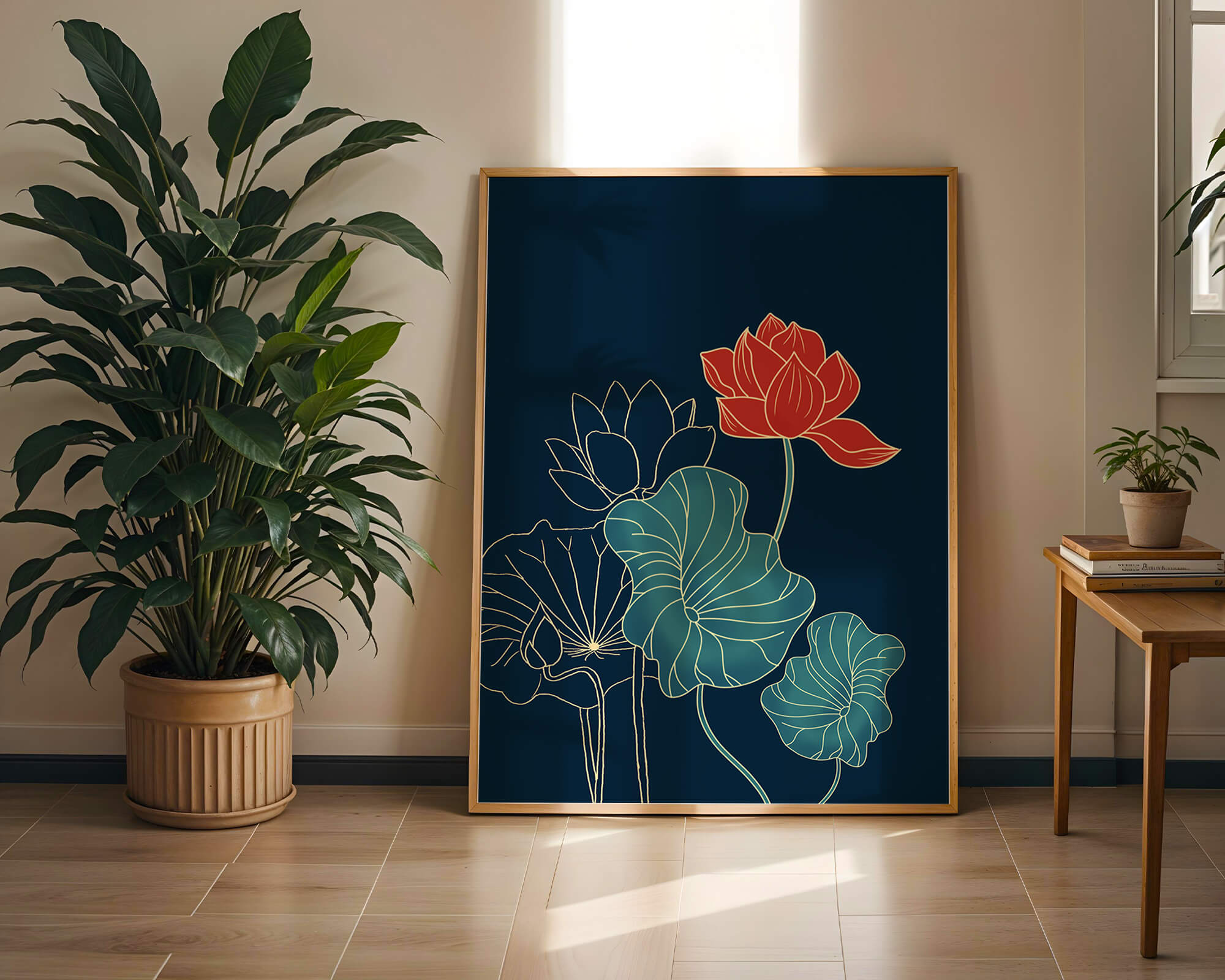 The piece showcases a vibrant red lotus flower standing tall among detailed green leaves and buds. The intricate gold outlines add a touch of sophistication and highlight the delicate structure of each element. The dark background enhances the colors, providing depth and making the flora appear more prominent. This artwork effortlessly combines modern design with classic botanical beauty, making it an ideal addition to any living space. Whether youre looking to add a splash of color or a touch of elegance to your home decor, this floral illustration is a perfect choice.| Type |