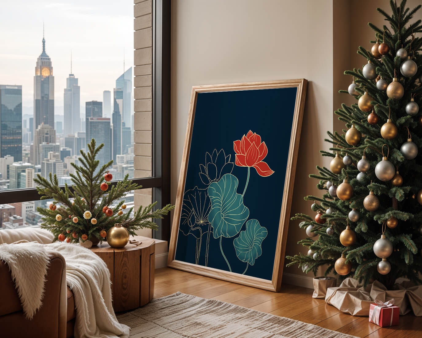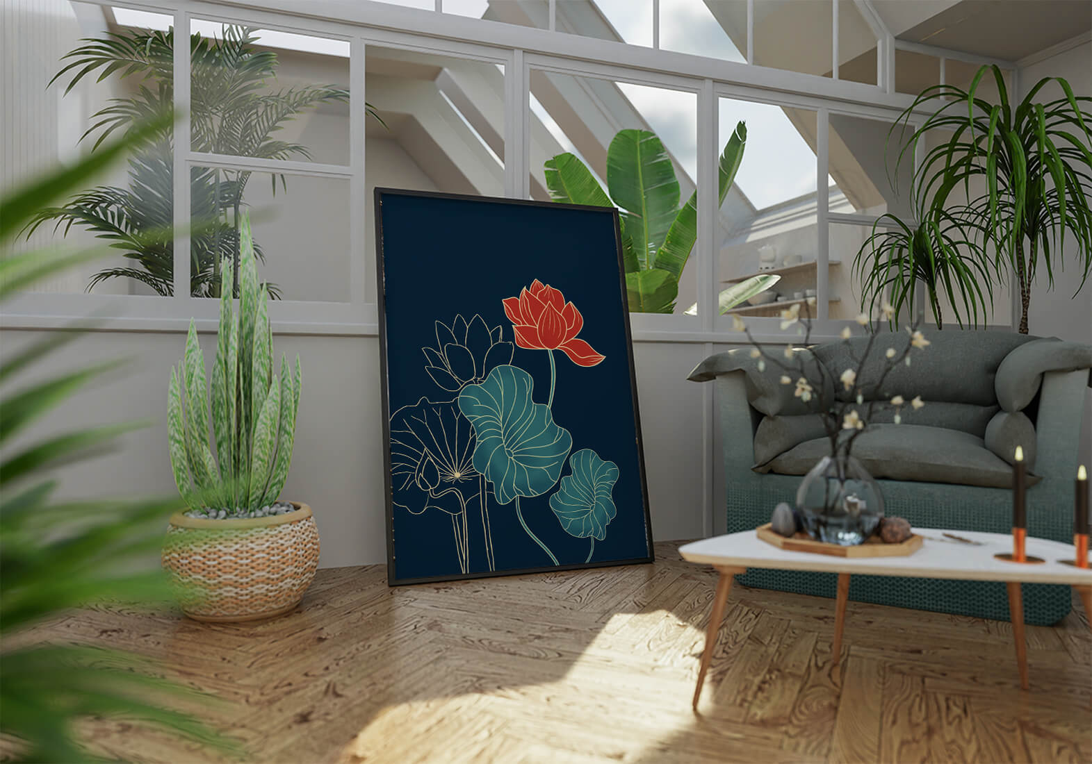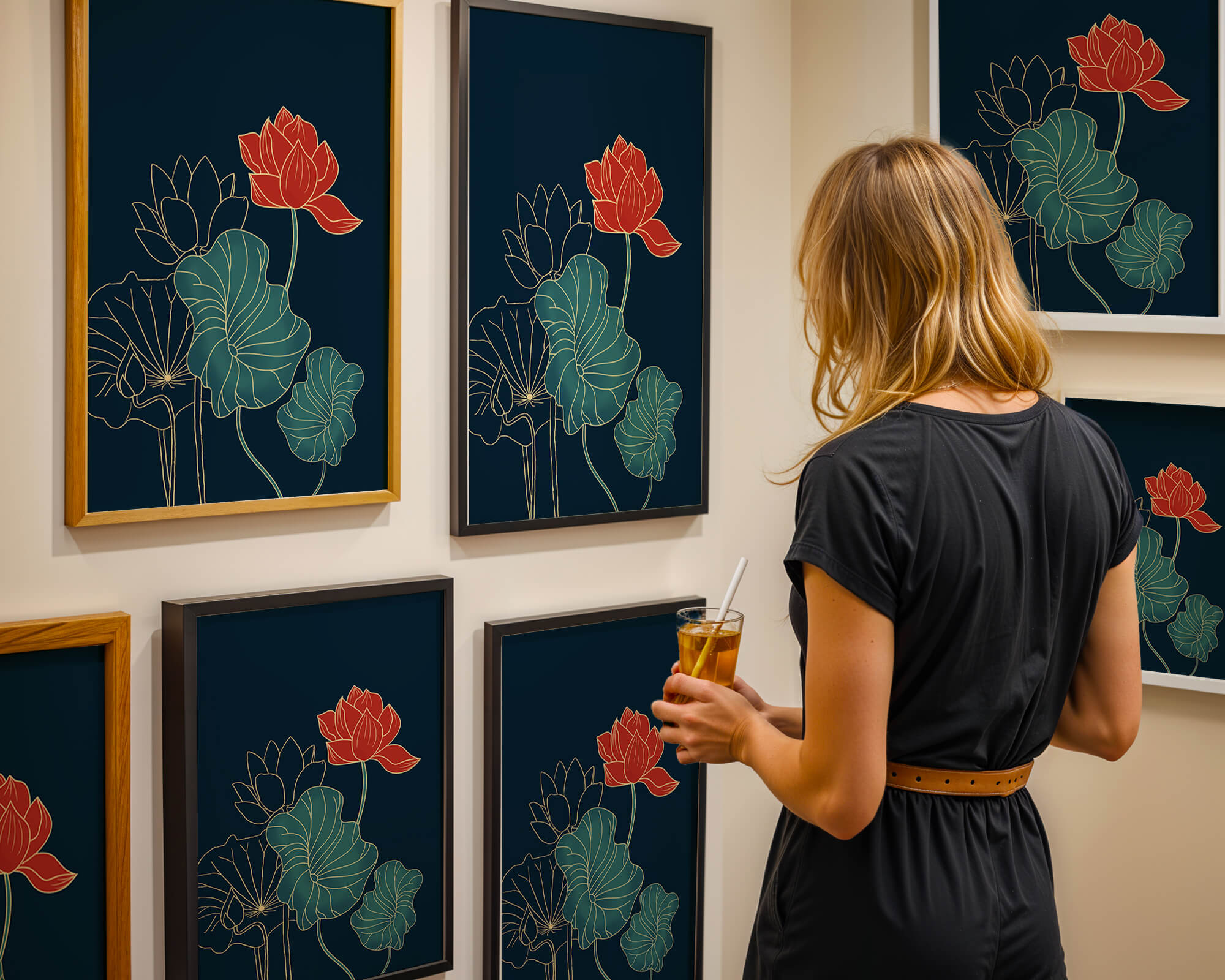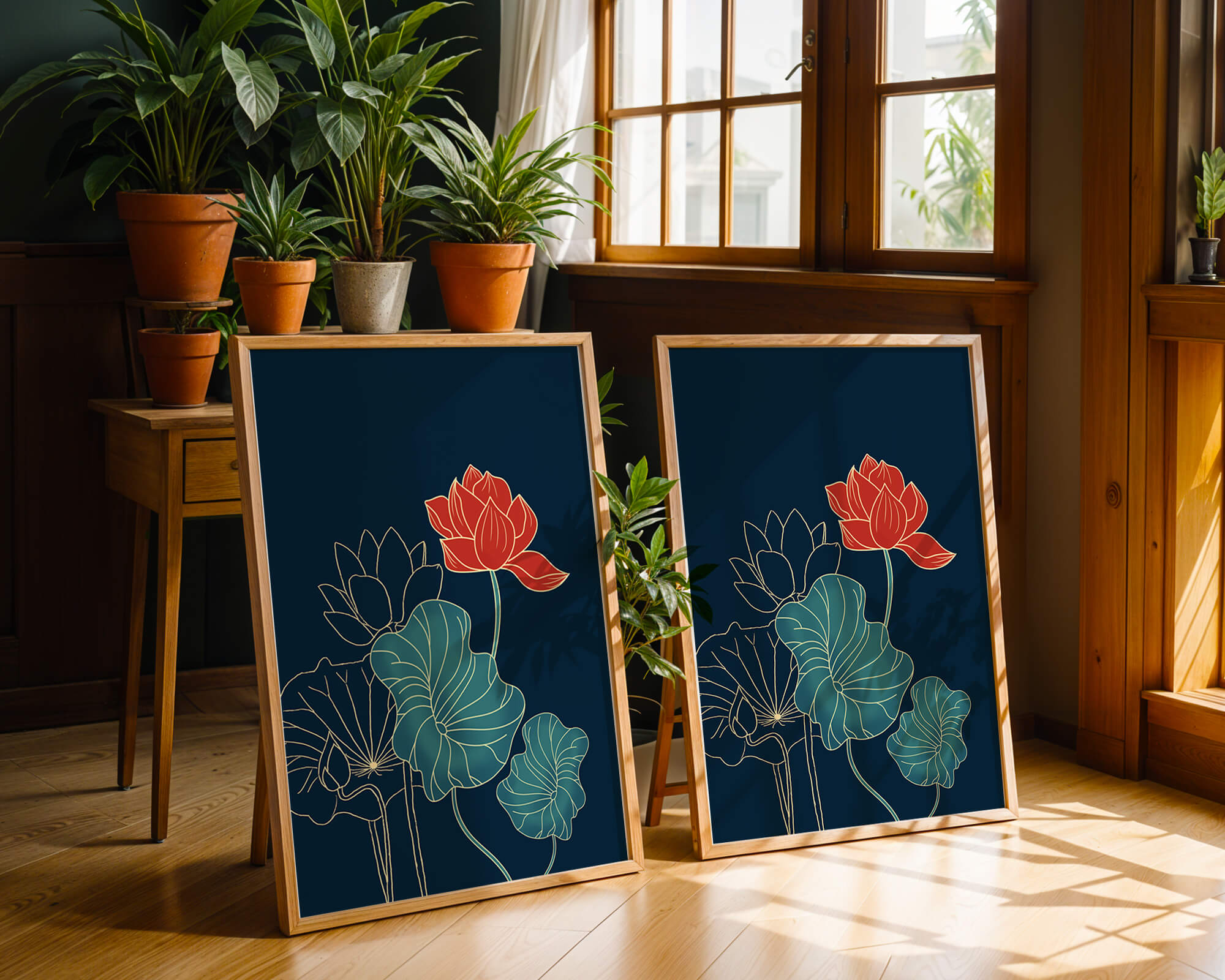 The piece showcases a vibrant red lotus flower standing tall among detailed green leaves and buds. The intricate gold outlines add a touch of sophistication and highlight the delicate structure of each element. The dark background enhances the colors, providing depth and making the flora appear more prominent. This artwork effortlessly combines modern design with classic botanical beauty, making it an ideal addition to any living space. Whether youre looking to add a splash of color or a touch of elegance to your home decor, this floral illustration is a perfect choice.| Type |