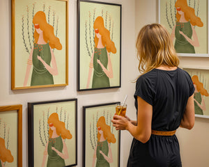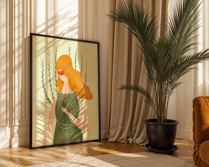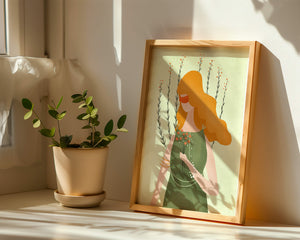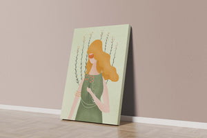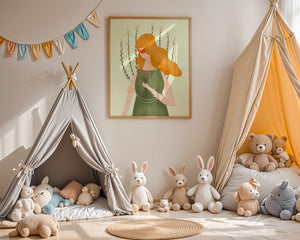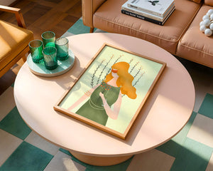 The minimalist style of the illustration, combined with a harmonious color palette of green and orange, creates a calming and aesthetically pleasing image. Perfect for those who appreciate art that exudes both simplicity and sophistication, this piece would be a delightful addition to any space.