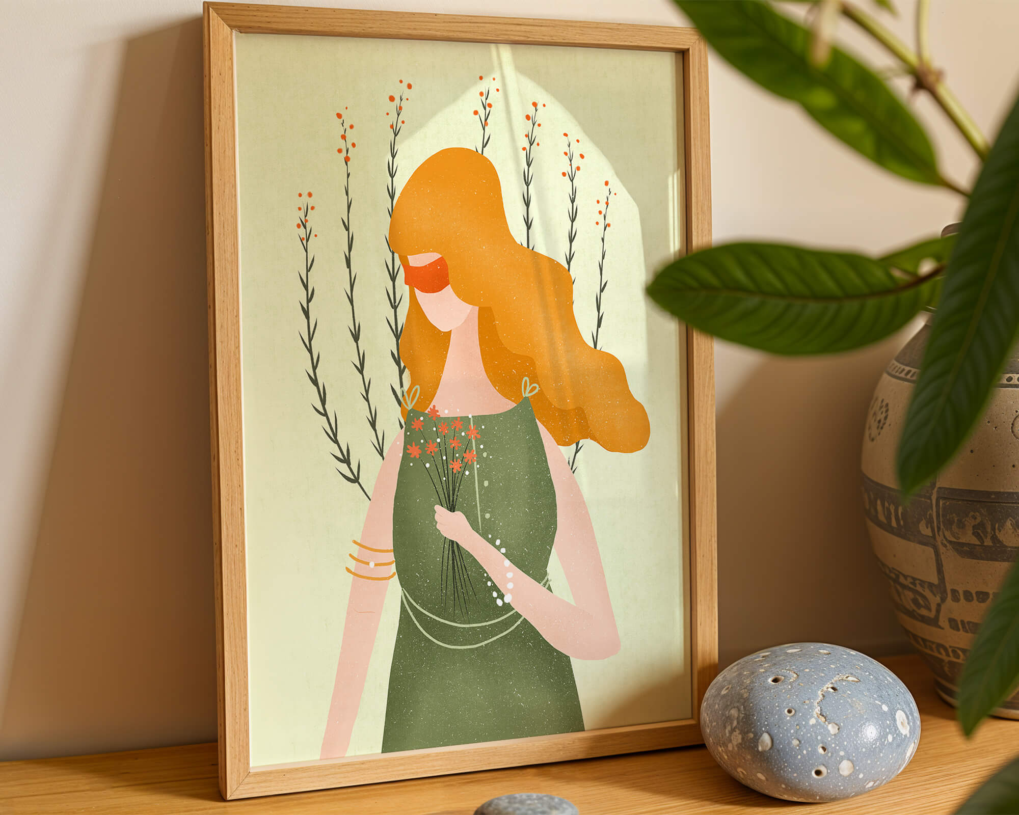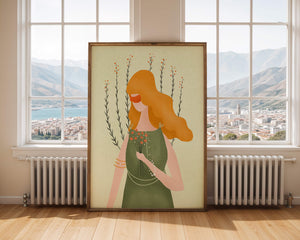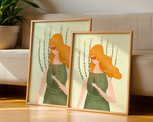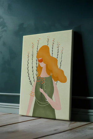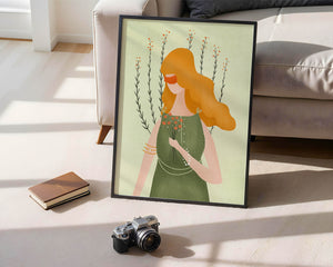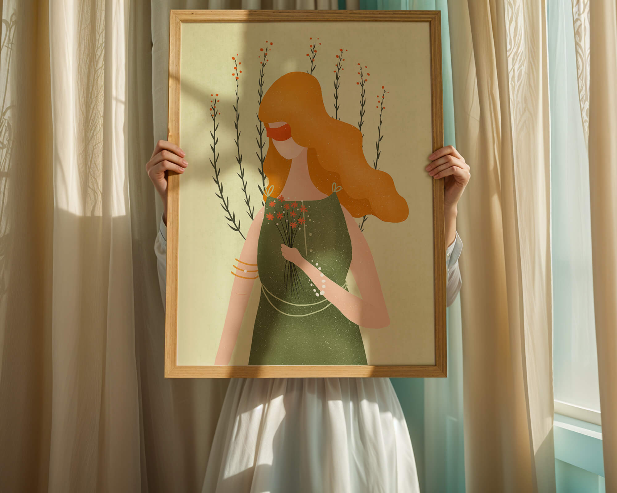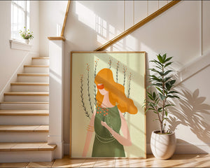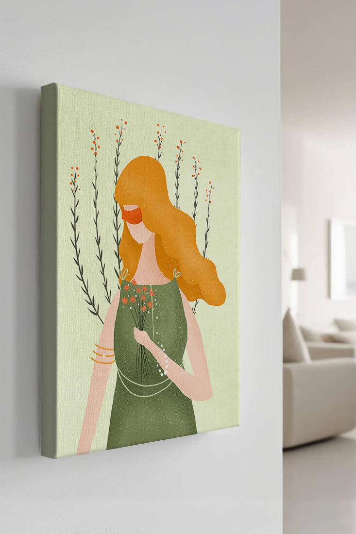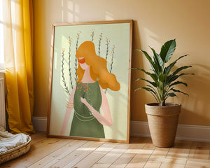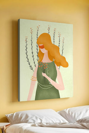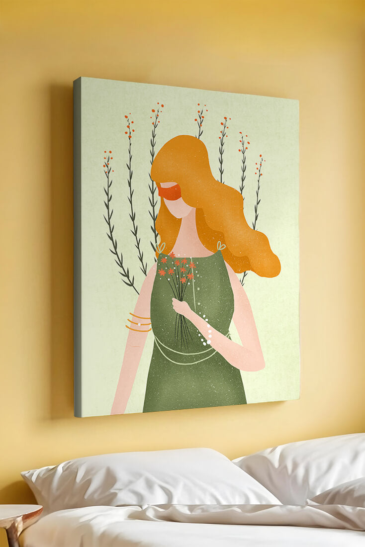 This illustration features a graceful woman in an elegant green dress, holding a bouquet of small orange flowers. Her vibrant orange hair complements the floral theme, set against a soft, garden-like background.