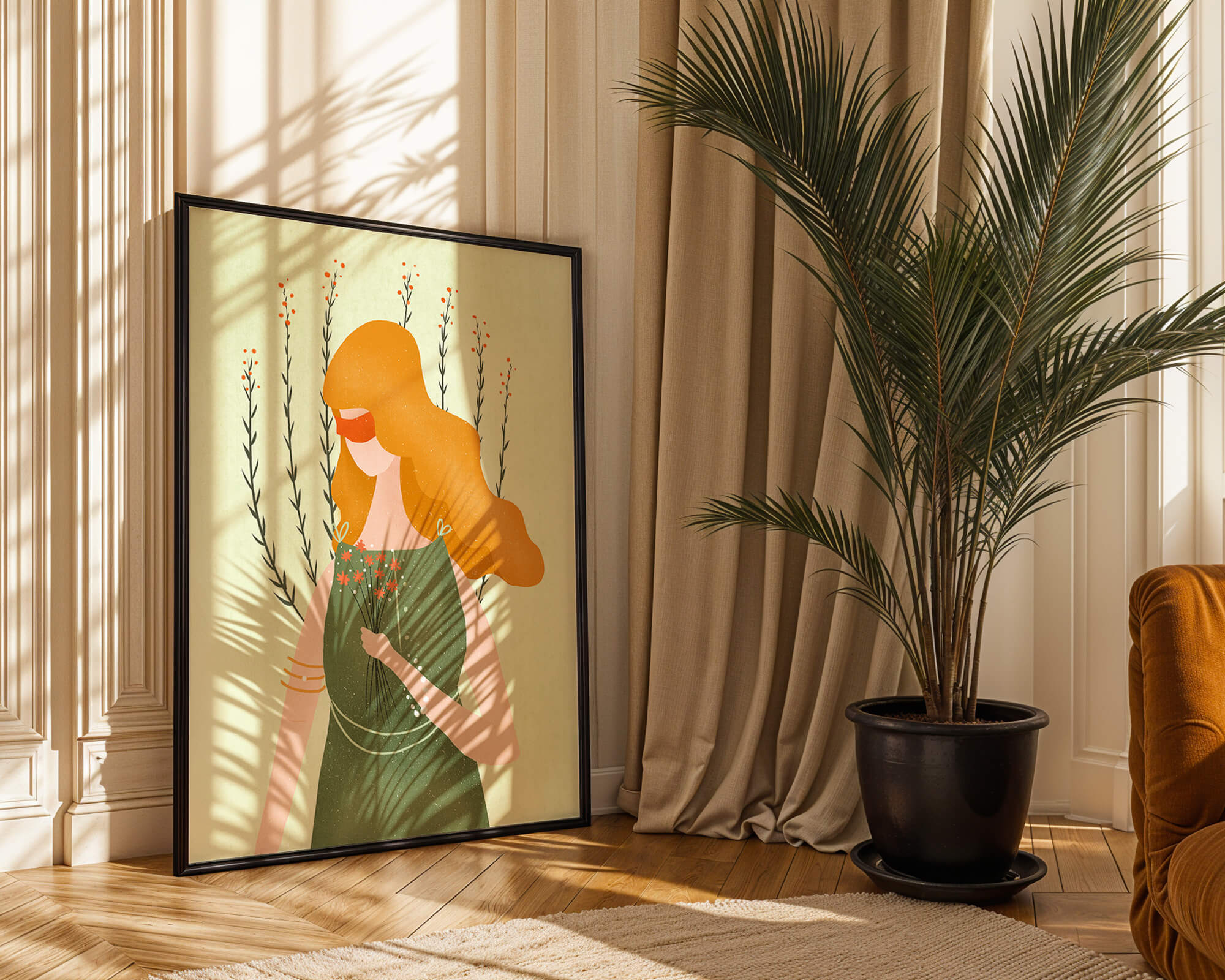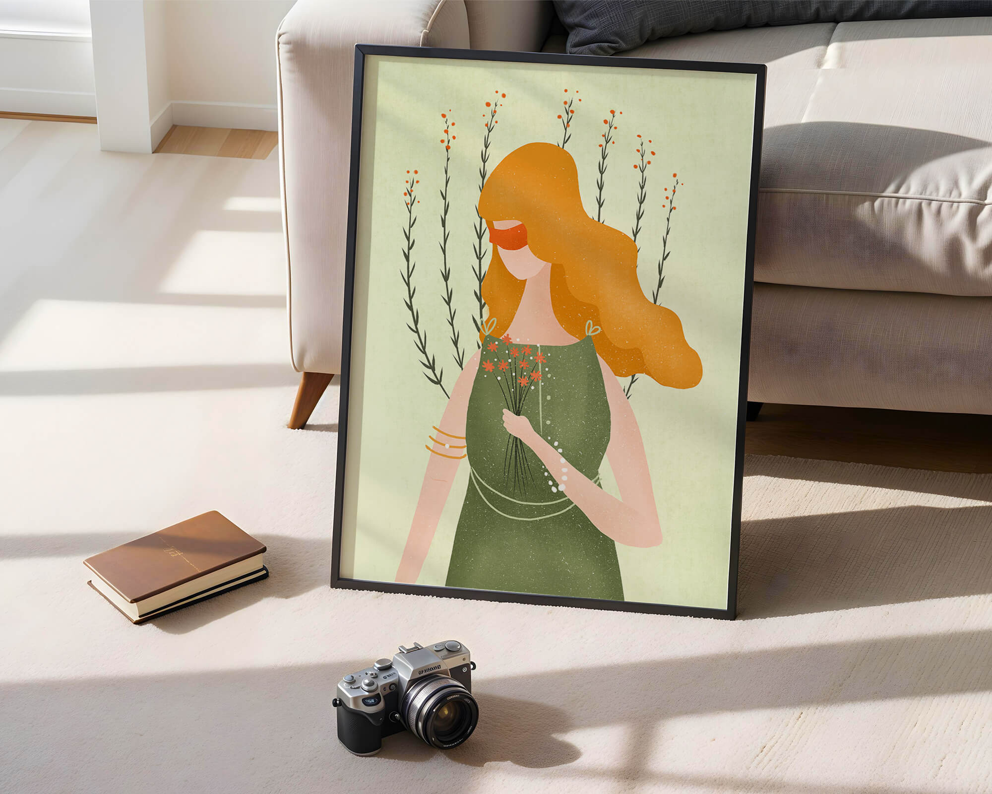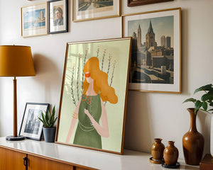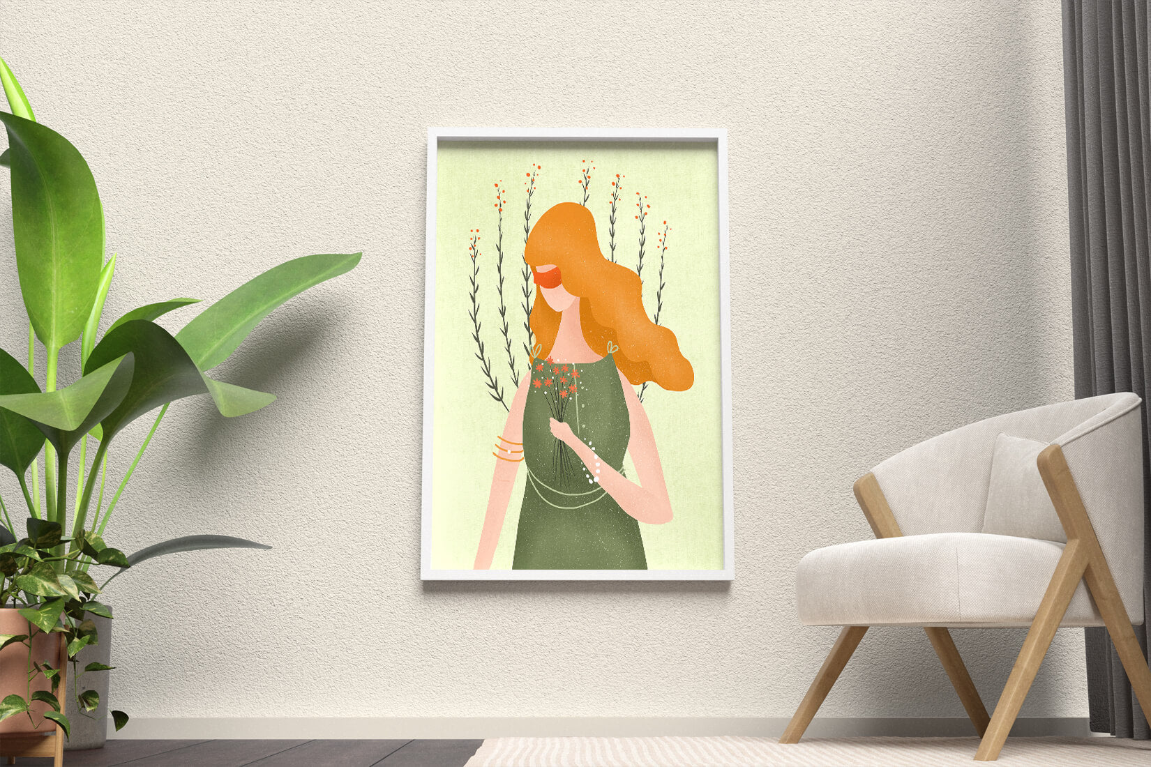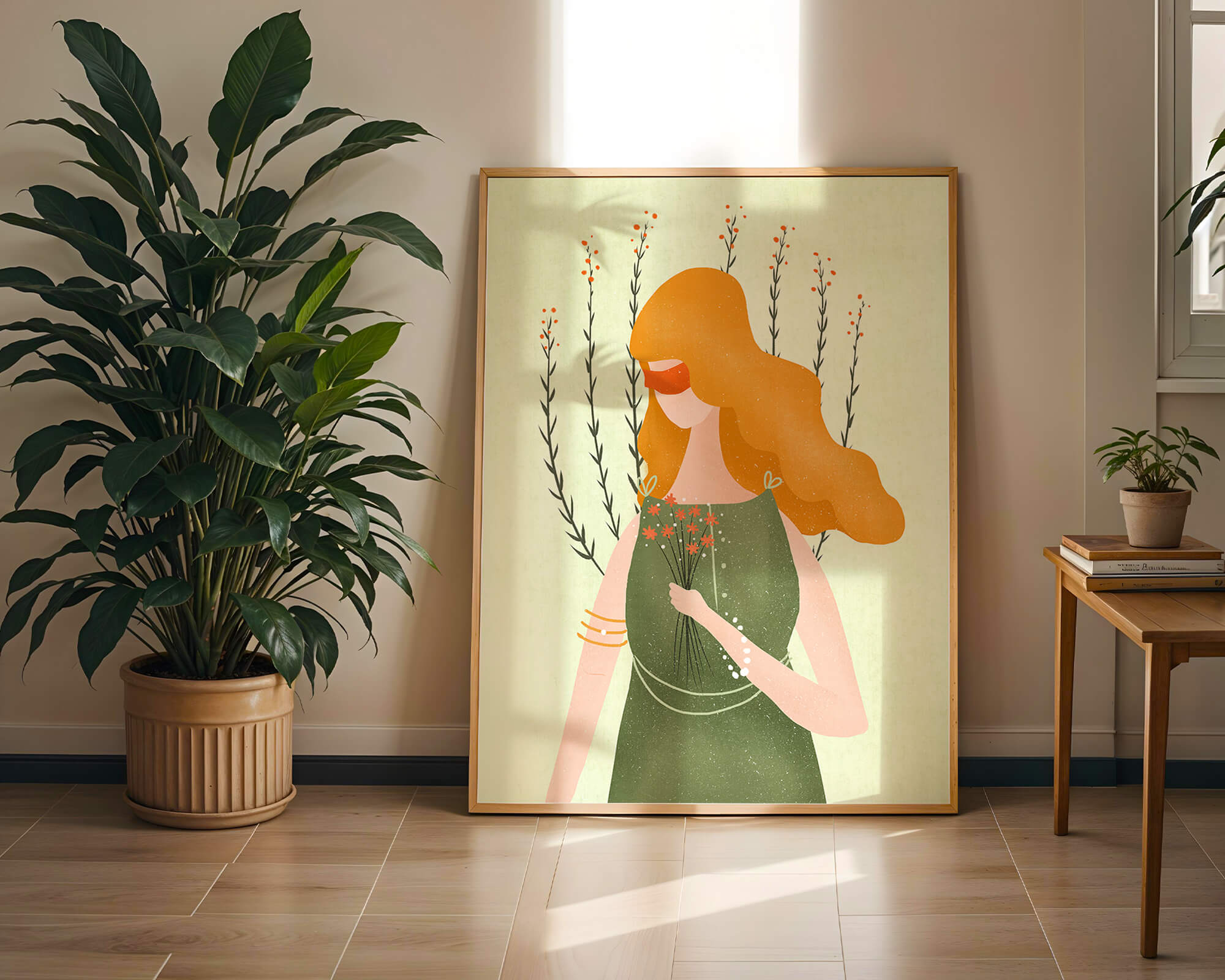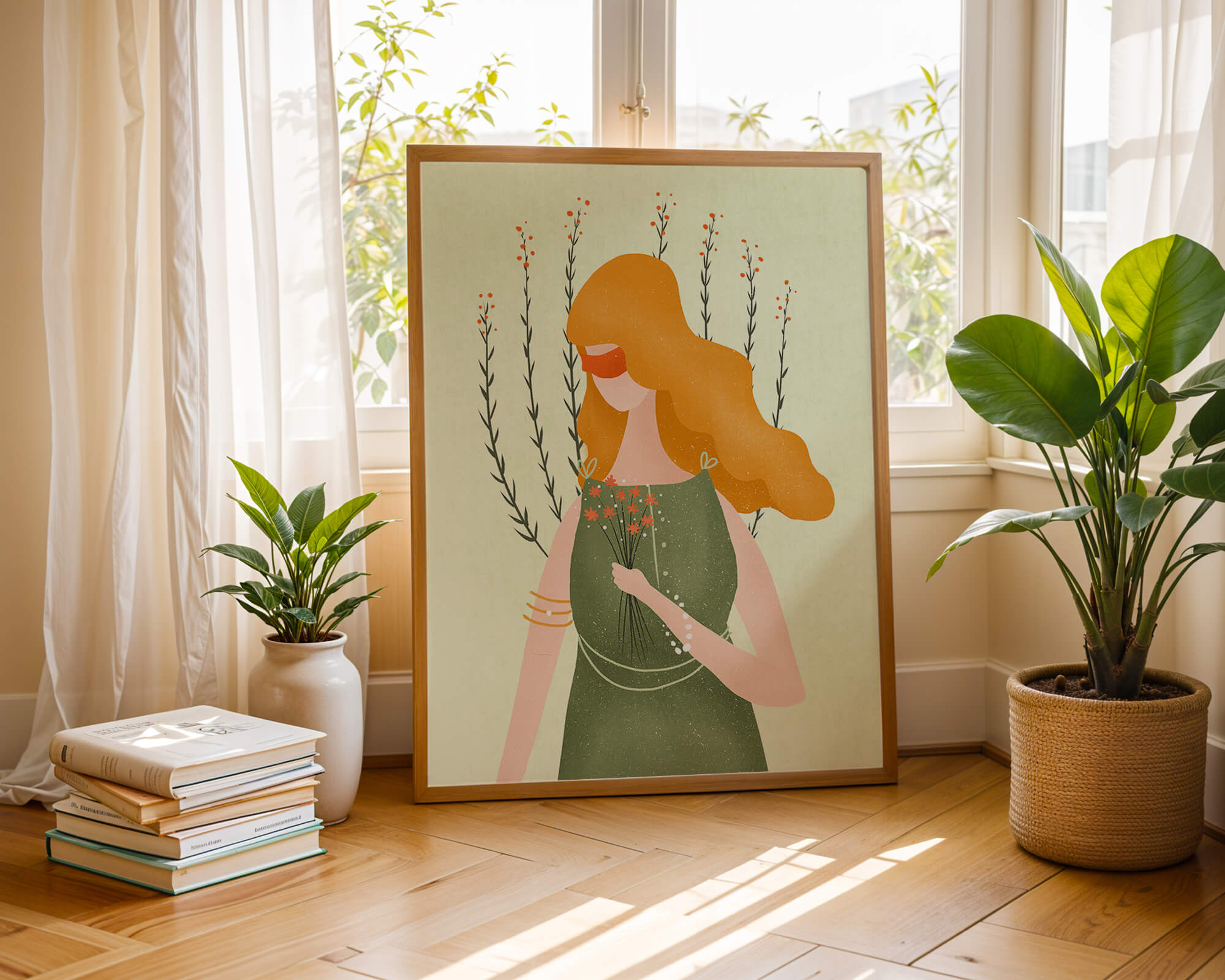 This illustration features a graceful woman in an elegant green dress, holding a bouquet of small orange flowers. Her vibrant orange hair complements the floral theme, set against a soft, garden-like background.