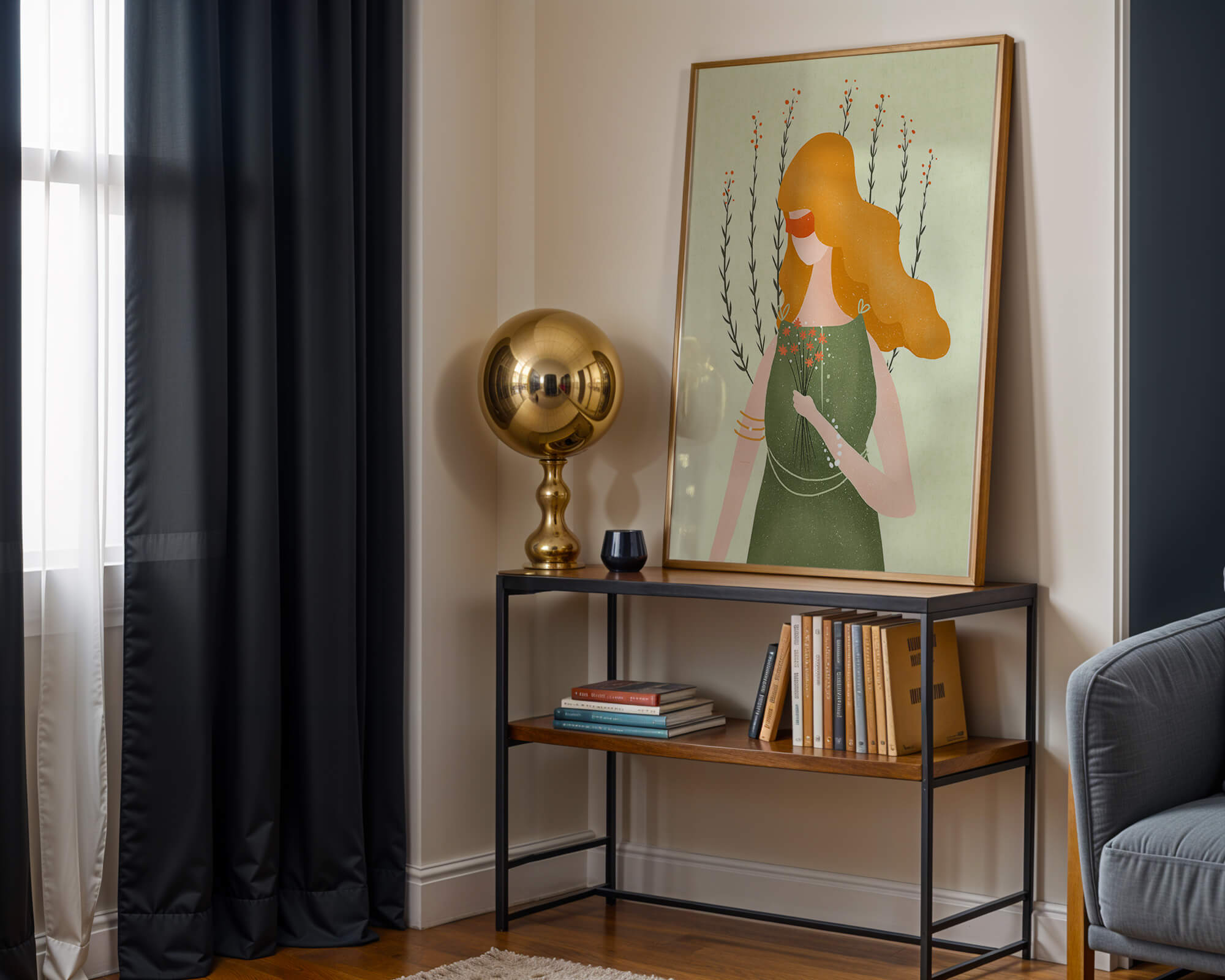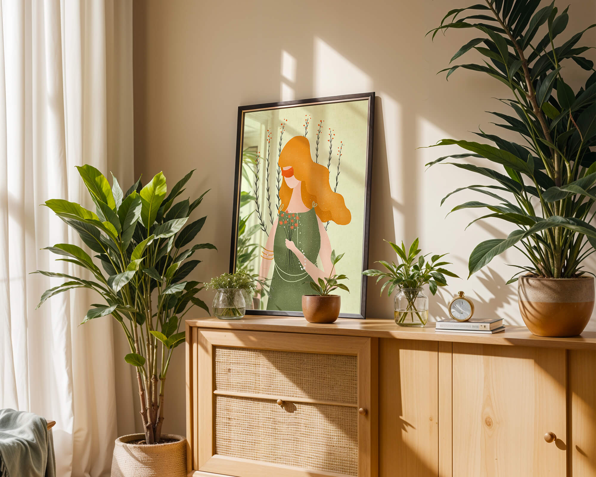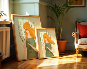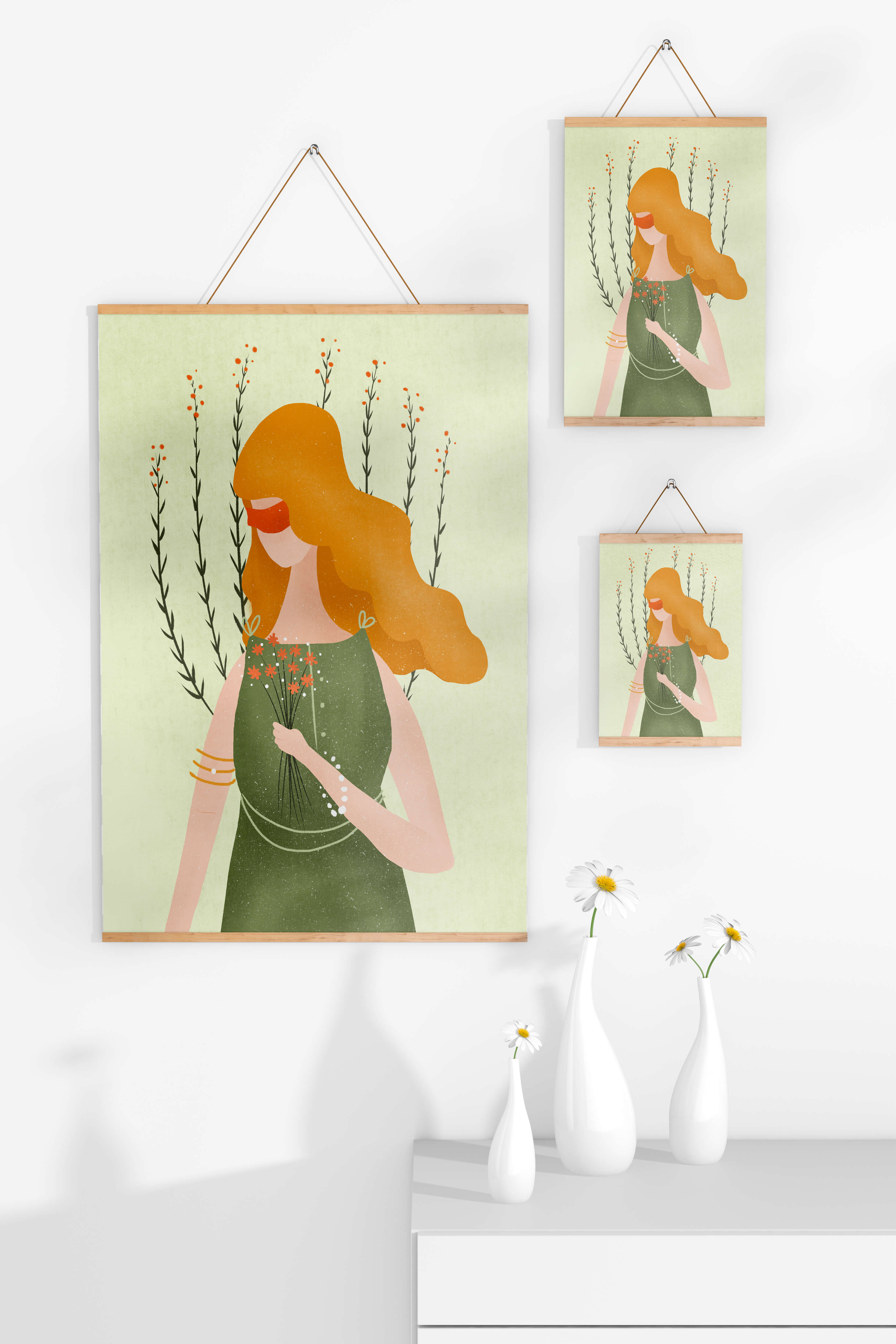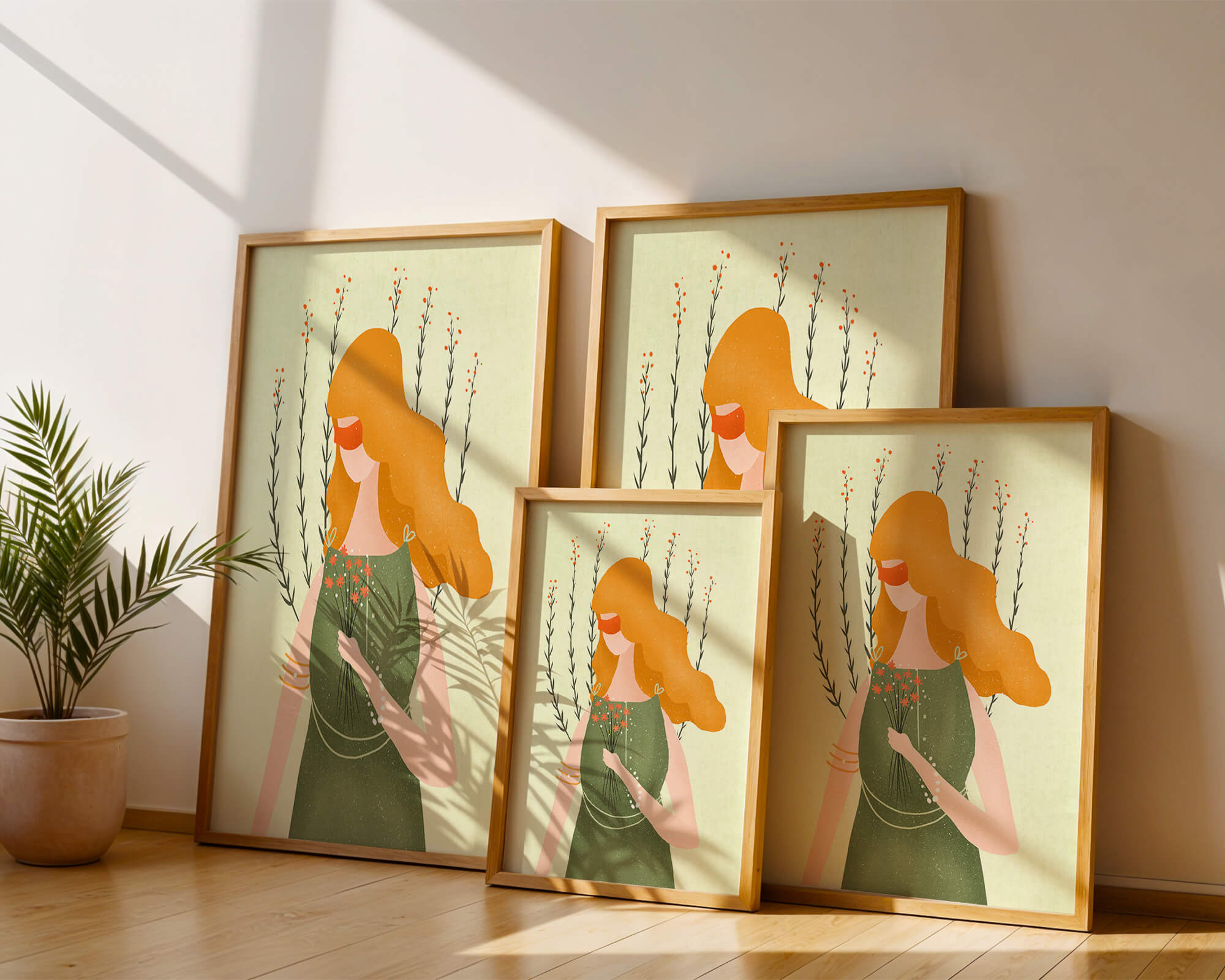 This illustration features a graceful woman in an elegant green dress, holding a bouquet of small orange flowers. Her vibrant orange hair complements the floral theme, set against a soft, garden-like background.