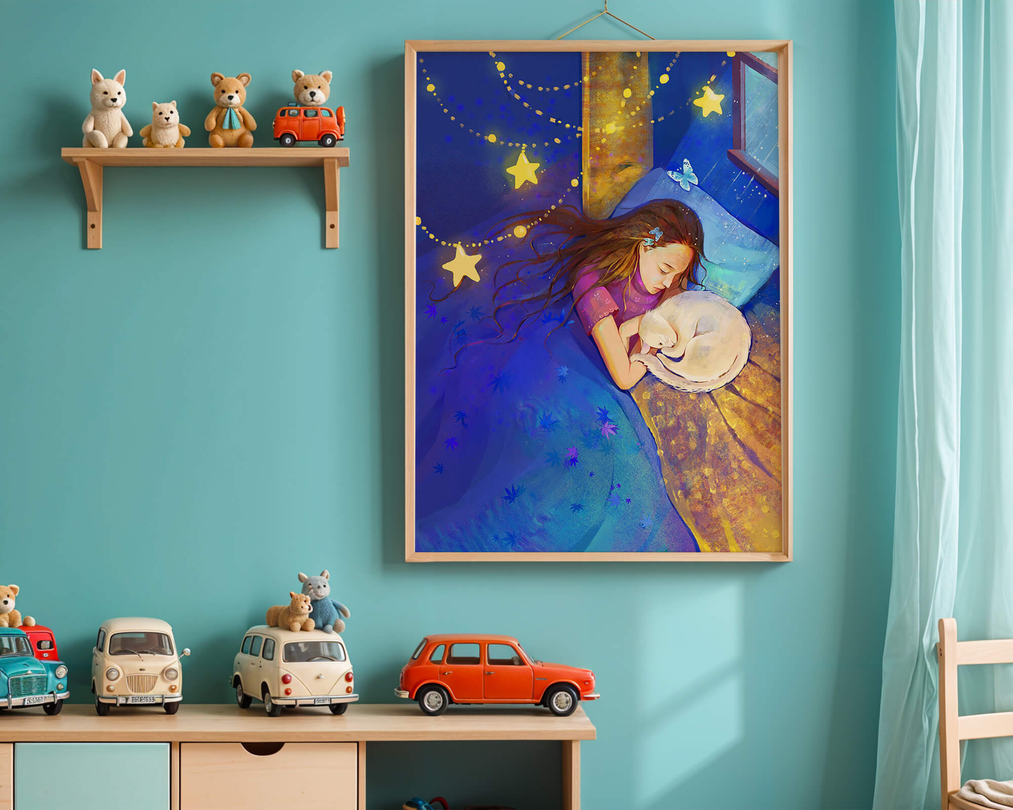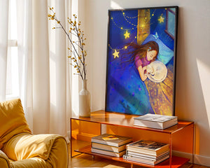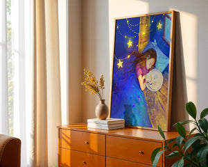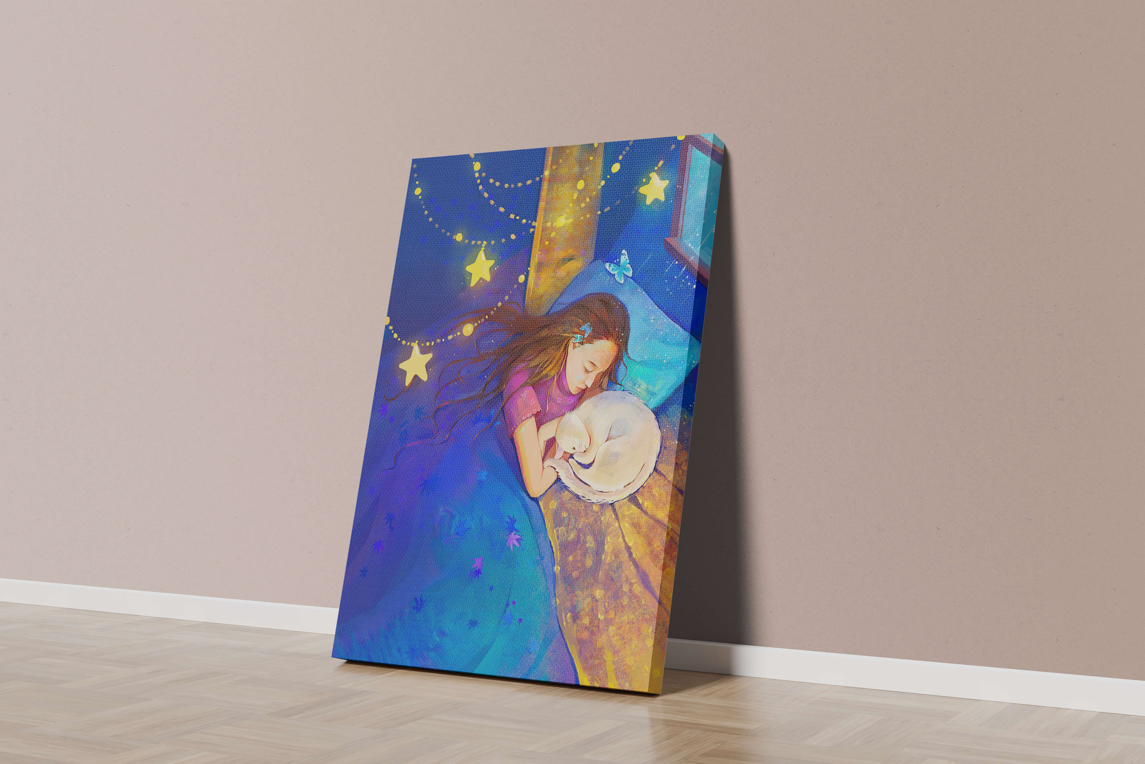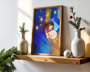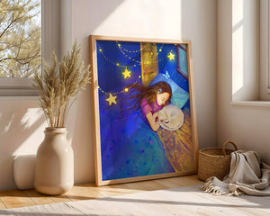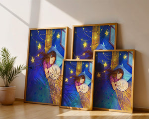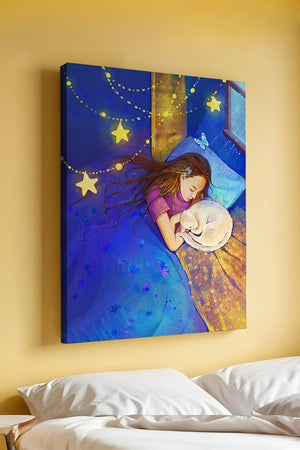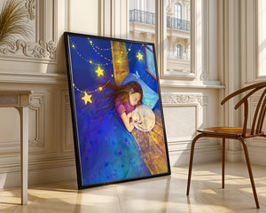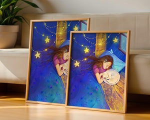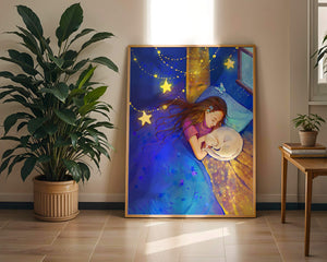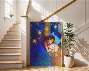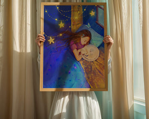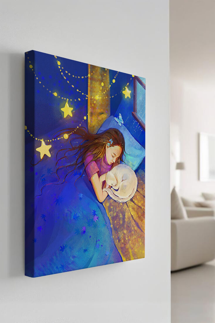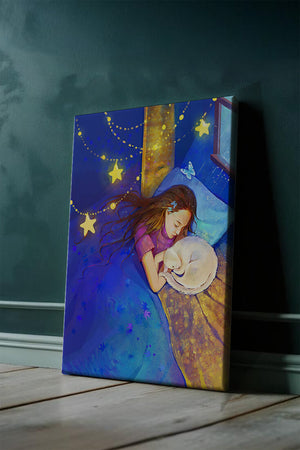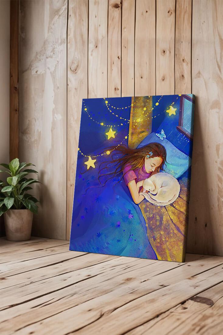 In this captivating image, a young girl is seen tenderly holding a cat as they both rest under a blanket adorned with delicate patterns. The backdrop of the scene is filled with rich shades of blue and gold, making the environment feel inviting and snug.The room is illuminated softly by fairy lights shaped like stars, casting a gentle glow that enhances the dreamy quality of the image. The positioning of the window suggests a connection to the outside night sky, bringing in subtle hints of moonlight. This piece beautifully captures the essence of tranquility and the enchanting world of dreams, making it a lovely addition to any childs room or as part of elegant home decor.| Type |
