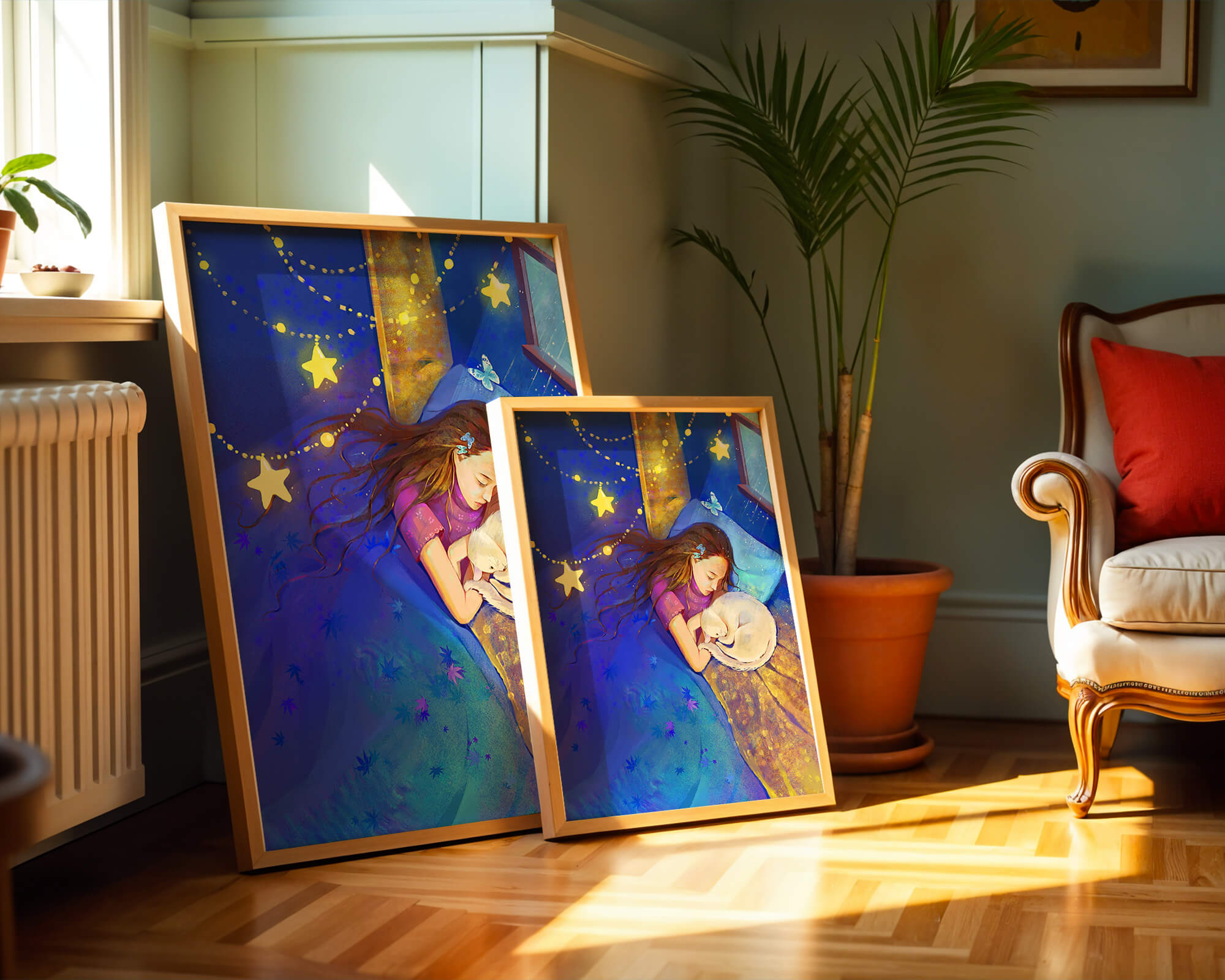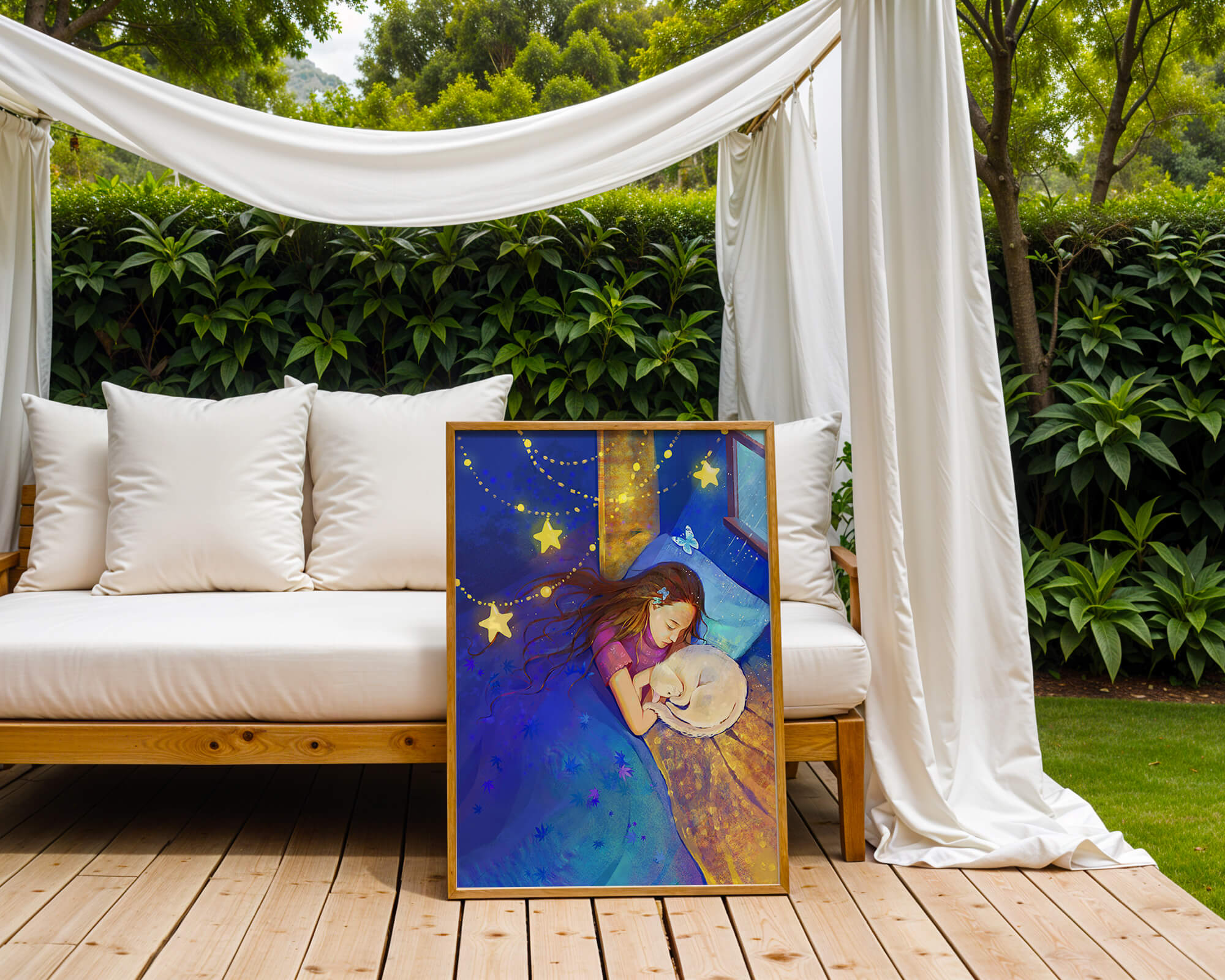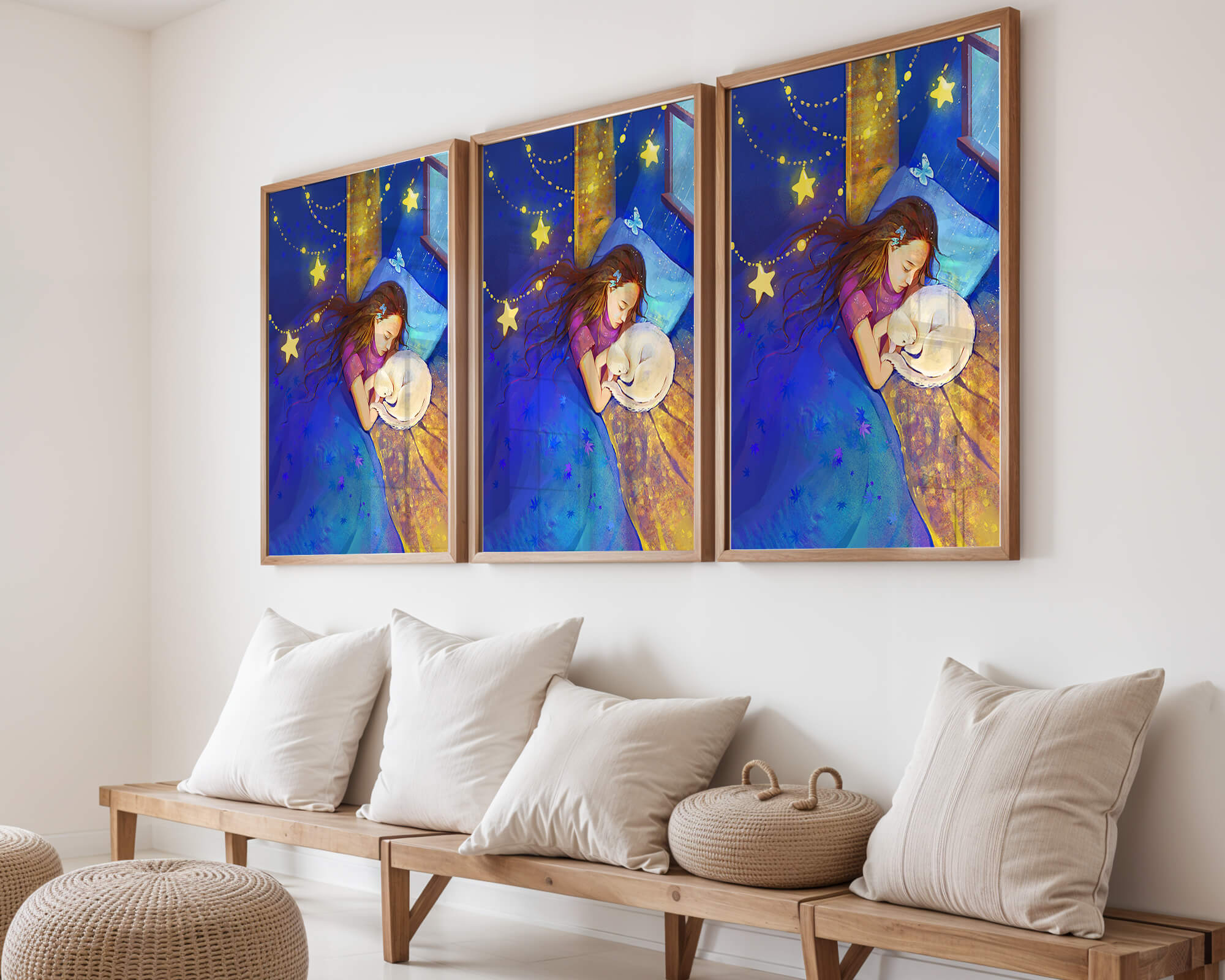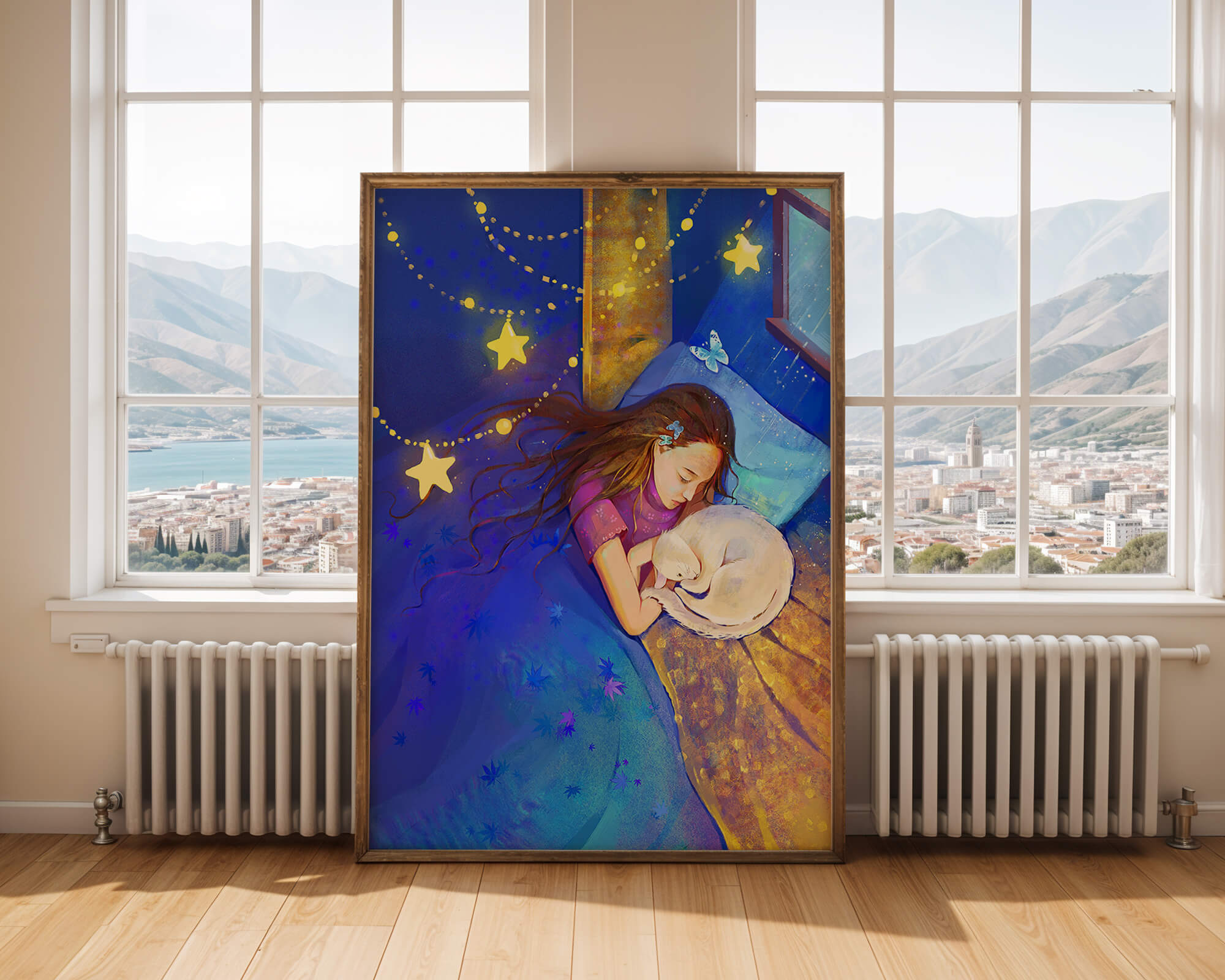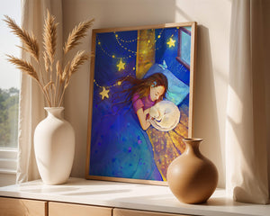 In this captivating image, a young girl is seen tenderly holding a cat as they both rest under a blanket adorned with delicate patterns. The backdrop of the scene is filled with rich shades of blue and gold, making the environment feel inviting and snug.The room is illuminated softly by fairy lights shaped like stars, casting a gentle glow that enhances the dreamy quality of the image. The positioning of the window suggests a connection to the outside night sky, bringing in subtle hints of moonlight. This piece beautifully captures the essence of tranquility and the enchanting world of dreams, making it a lovely addition to any childs room or as part of elegant home decor.| Type |