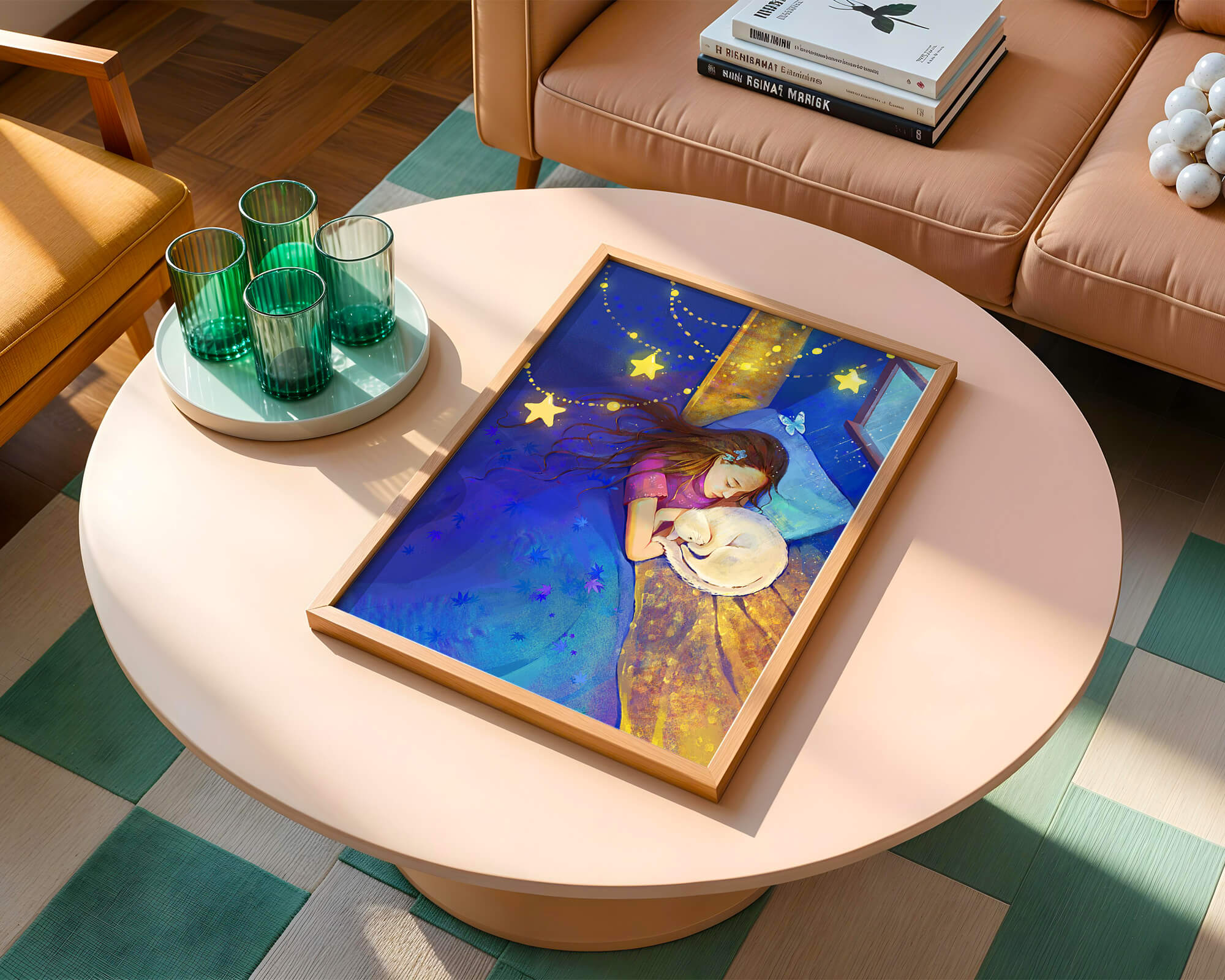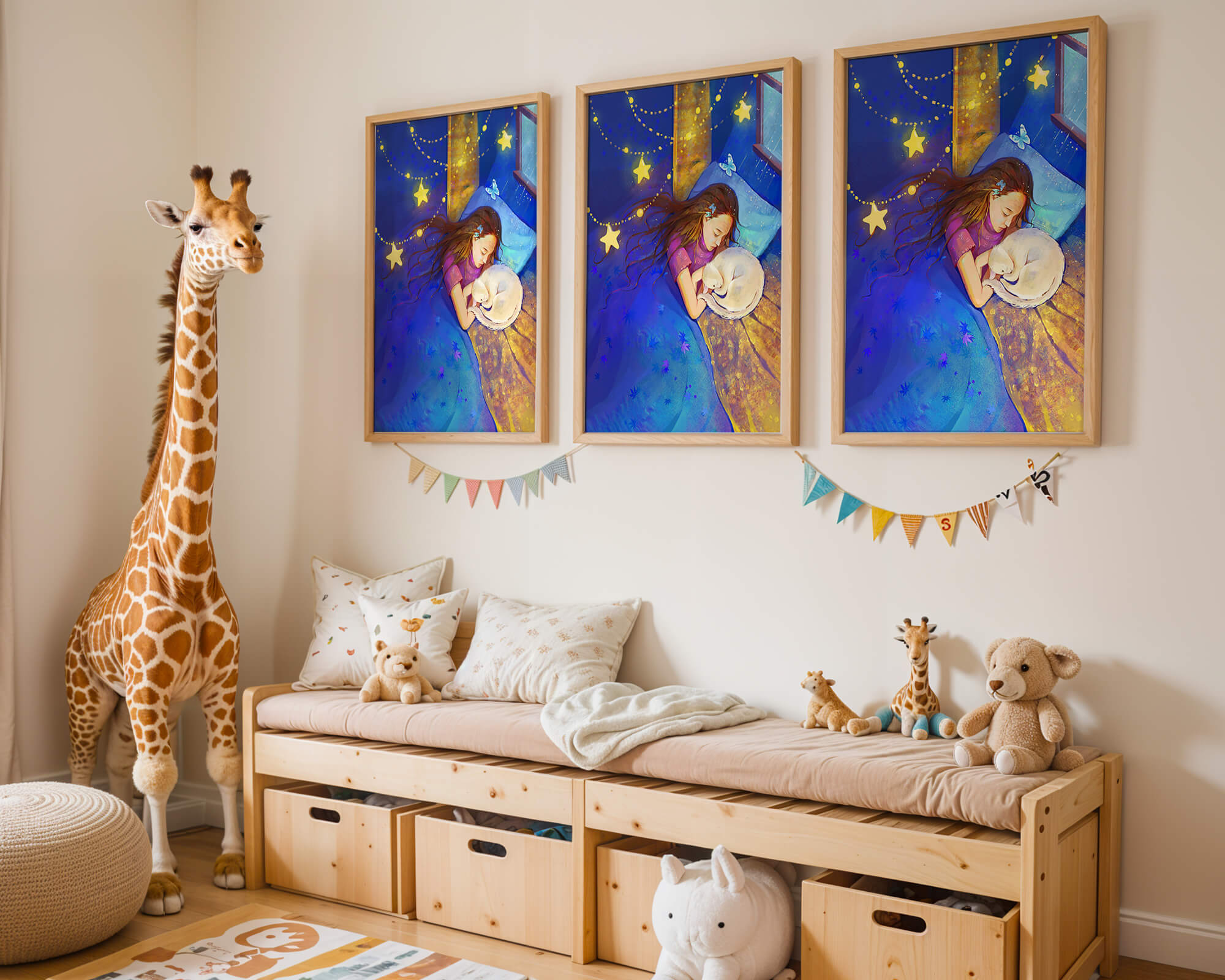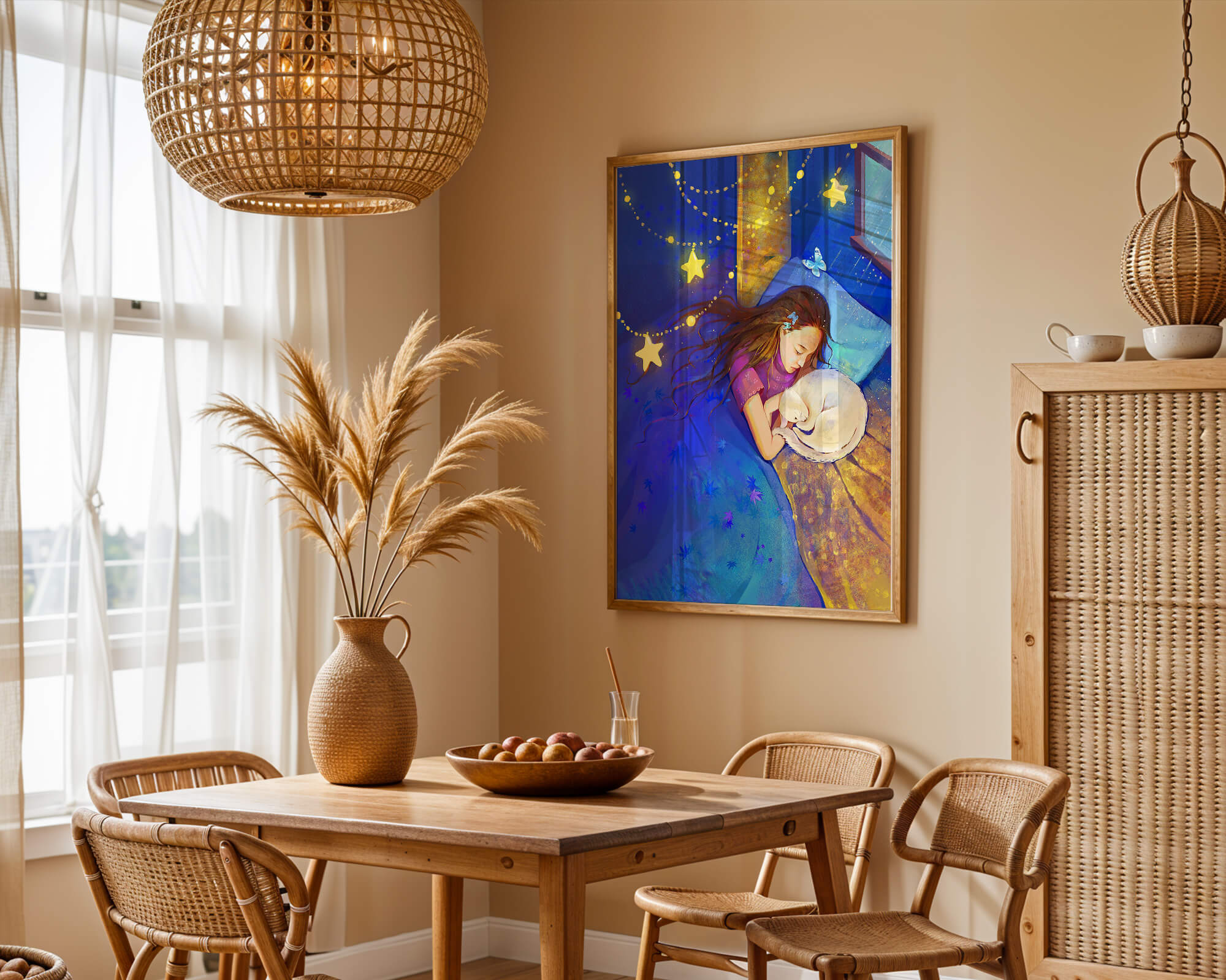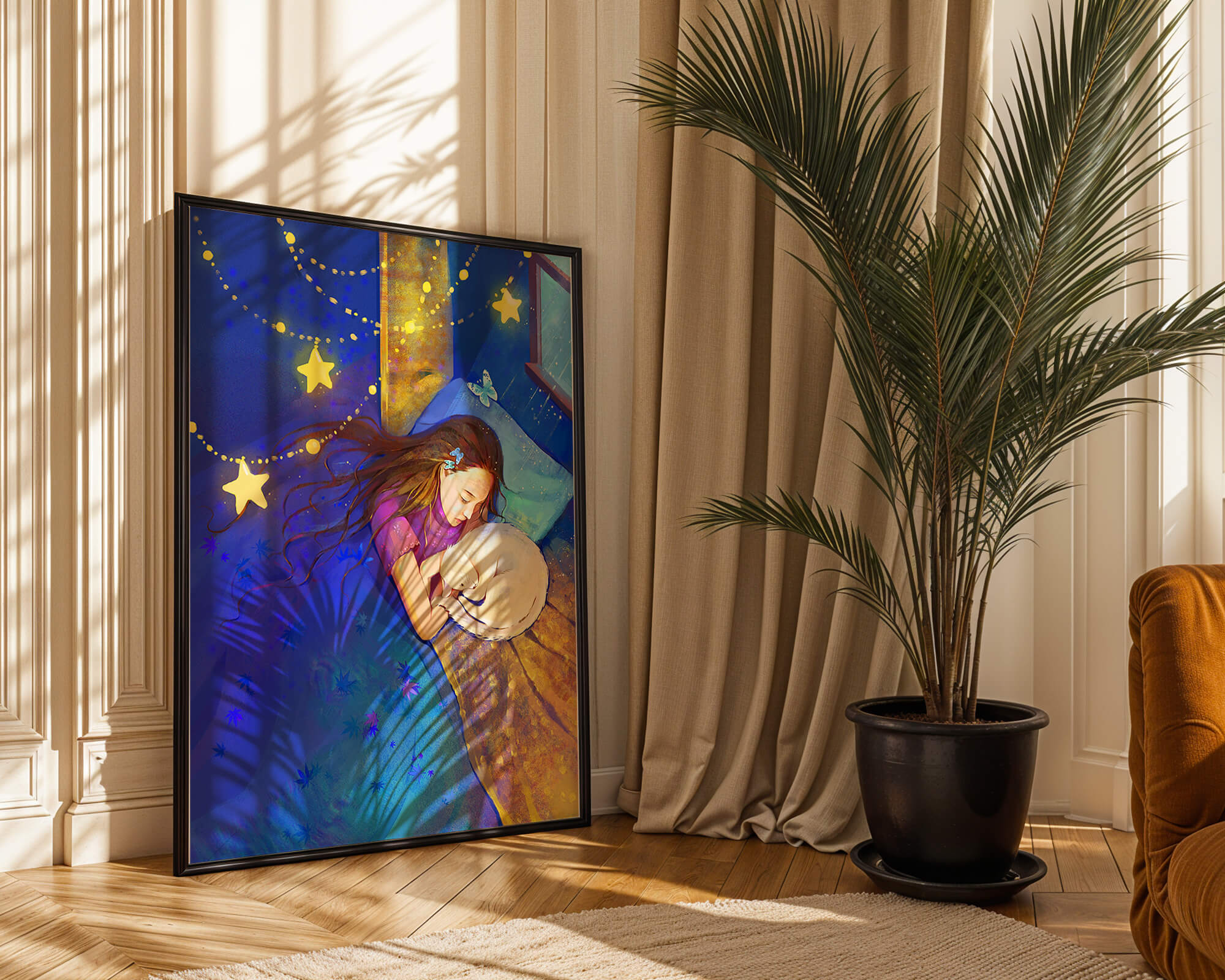 In this captivating image, a young girl is seen tenderly holding a cat as they both rest under a blanket adorned with delicate patterns. The backdrop of the scene is filled with rich shades of blue and gold, making the environment feel inviting and snug.The room is illuminated softly by fairy lights shaped like stars, casting a gentle glow that enhances the dreamy quality of the image. The positioning of the window suggests a connection to the outside night sky, bringing in subtle hints of moonlight. This piece beautifully captures the essence of tranquility and the enchanting world of dreams, making it a lovely addition to any childs room or as part of elegant home decor.| Type |