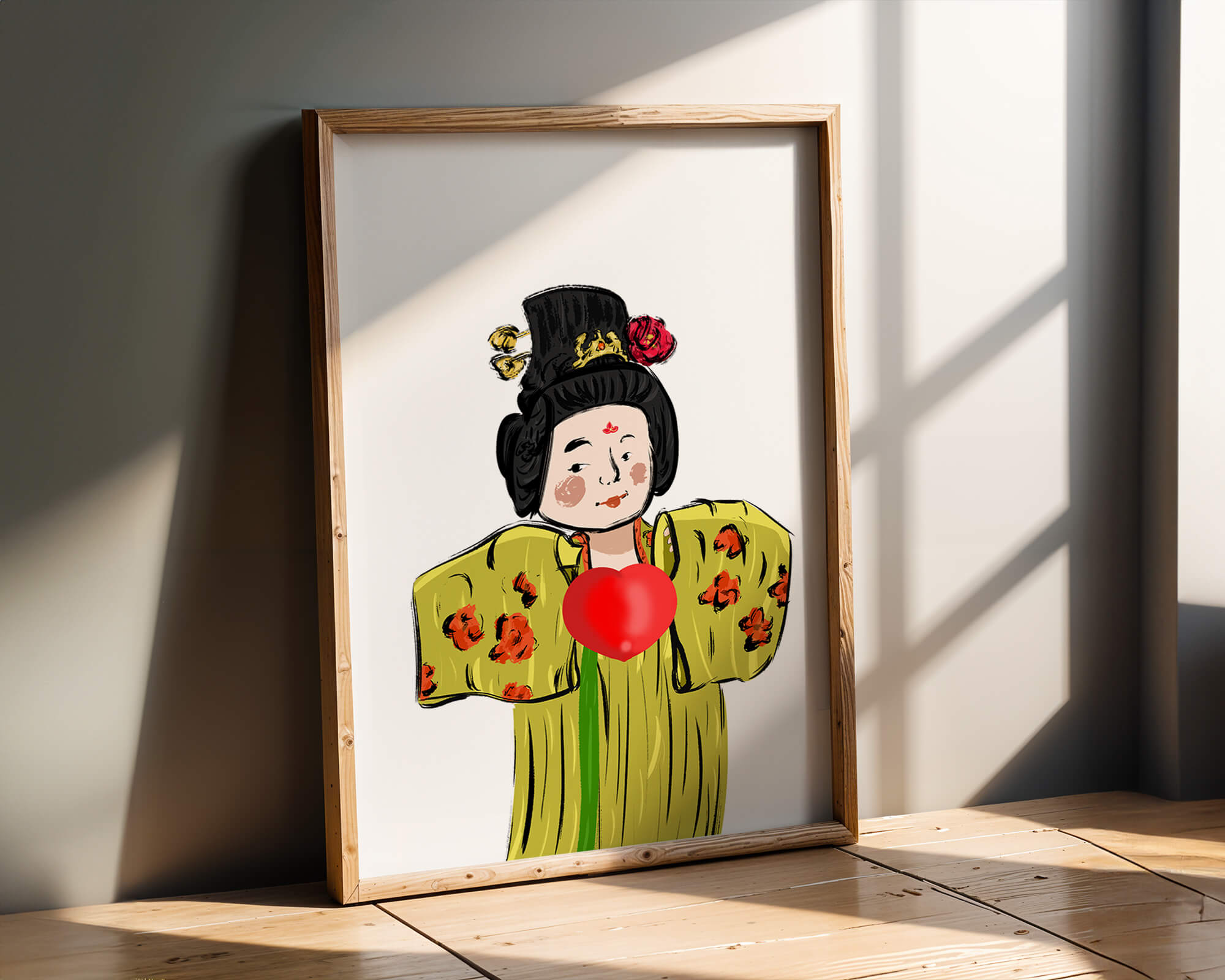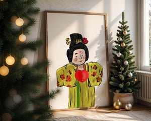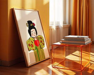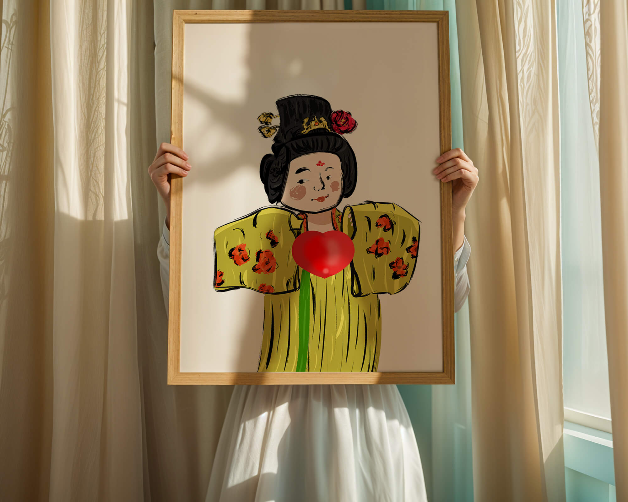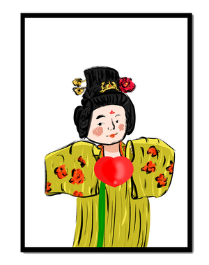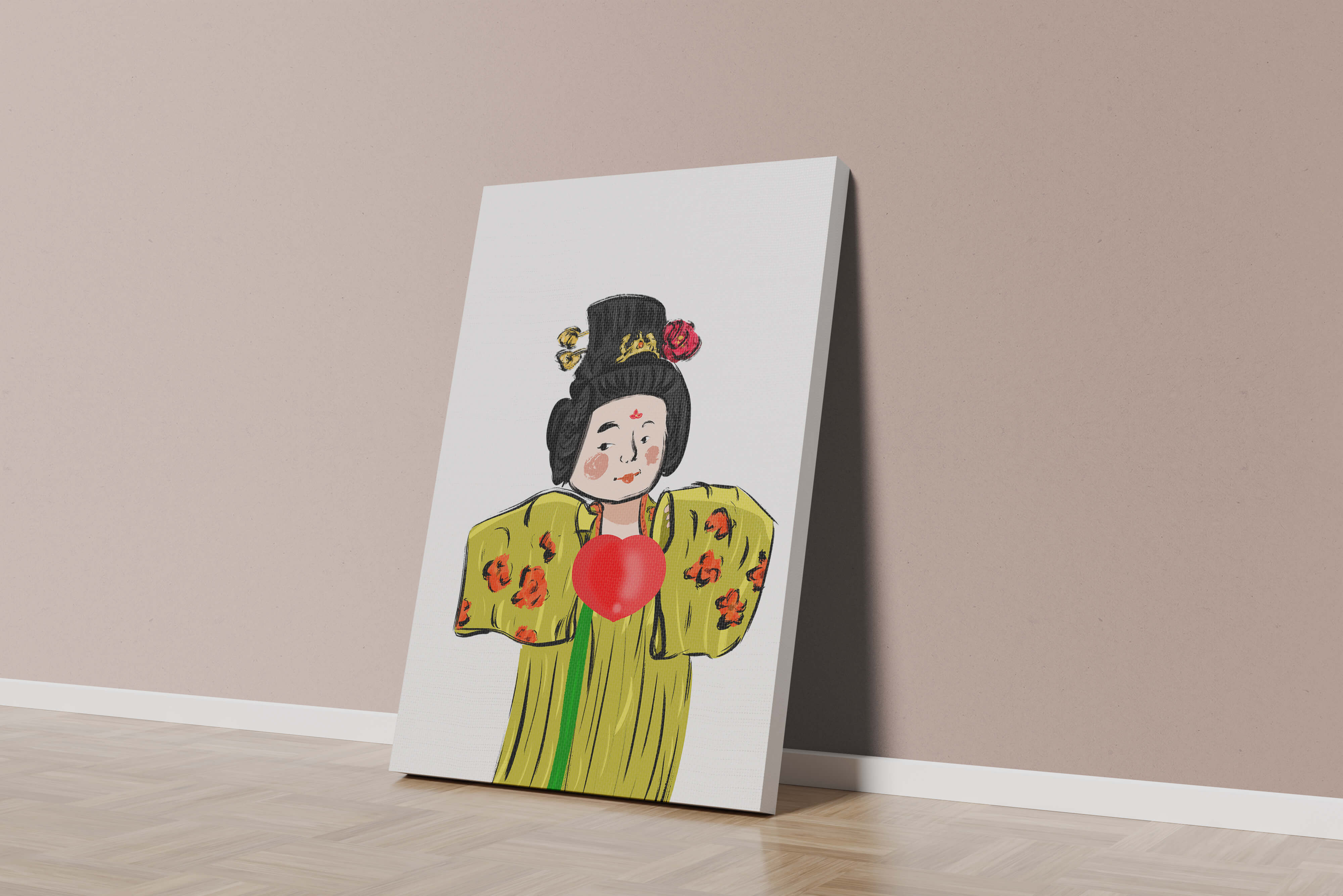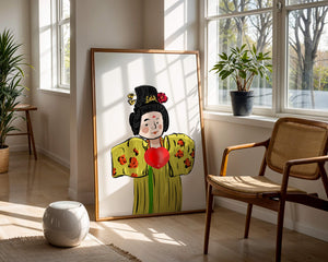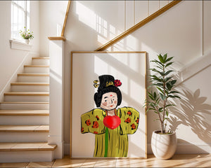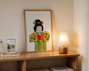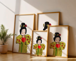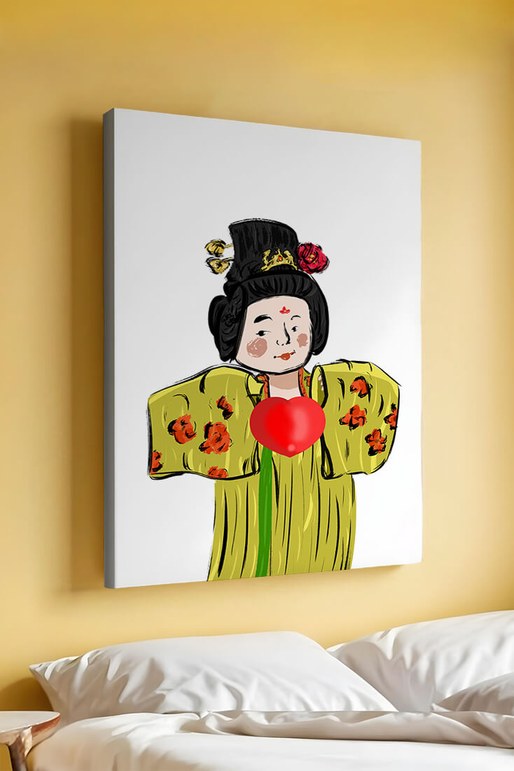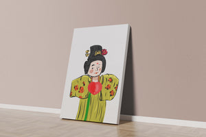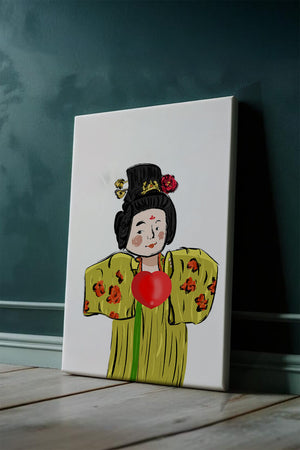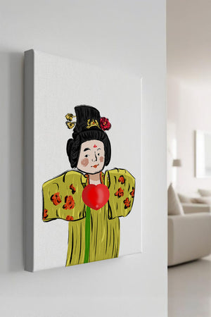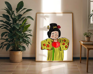 The illustration showcases an intricate display of cultural themes through the attires elaborate design. The garment is adorned with a floral pattern, contributing a lively touch to the yellow fabric. This choice of colors and patterns suggests a celebration of heritage and artistic expression.The characters expression is gentle and welcoming, while the vibrant heart symbol adds an element of warmth and affection to the composition. Ideal for those appreciating cultural and artistic aesthetics, this piece exudes a sense of tradition merged with modern style, apt for various decorative settings.| Type |