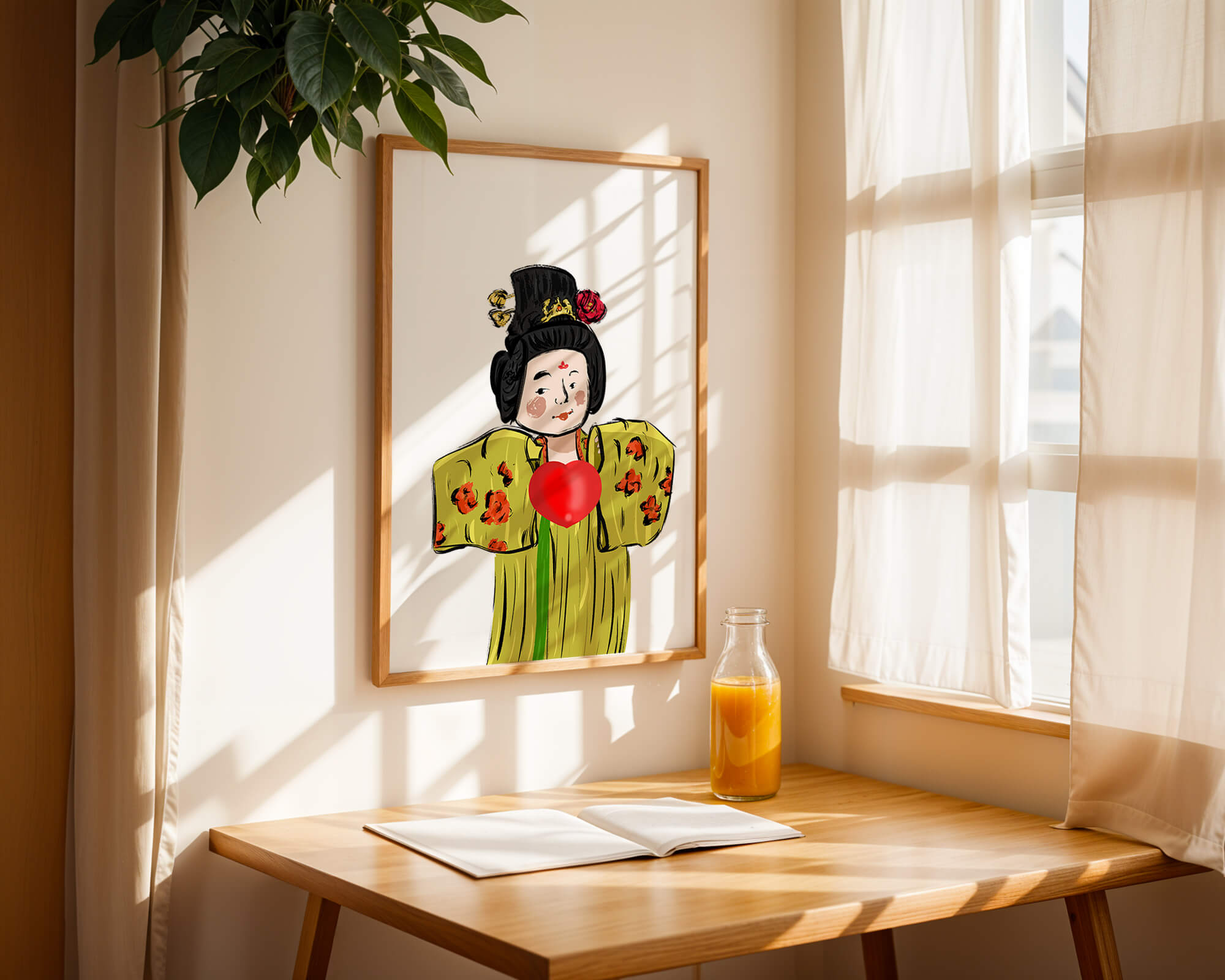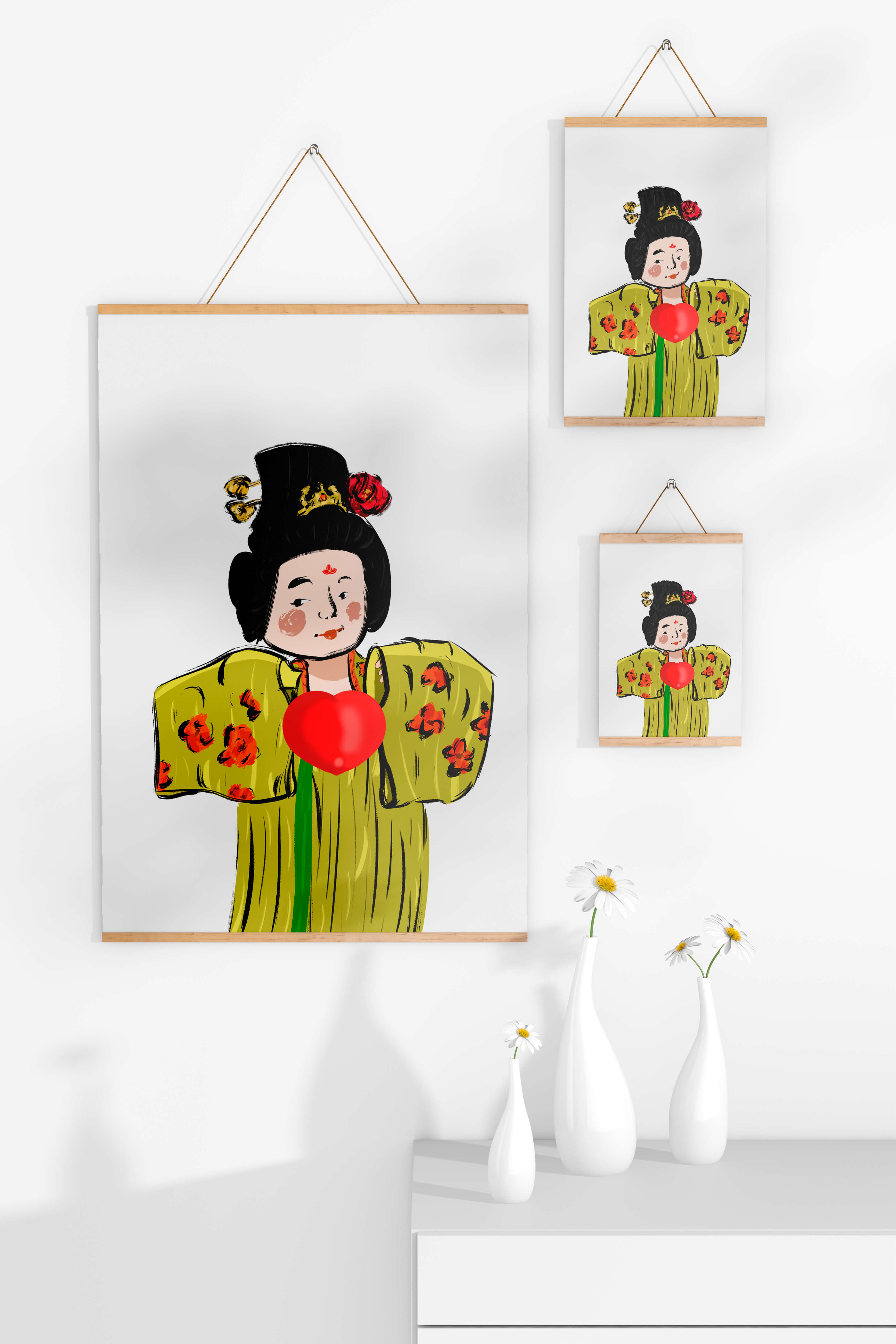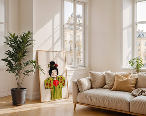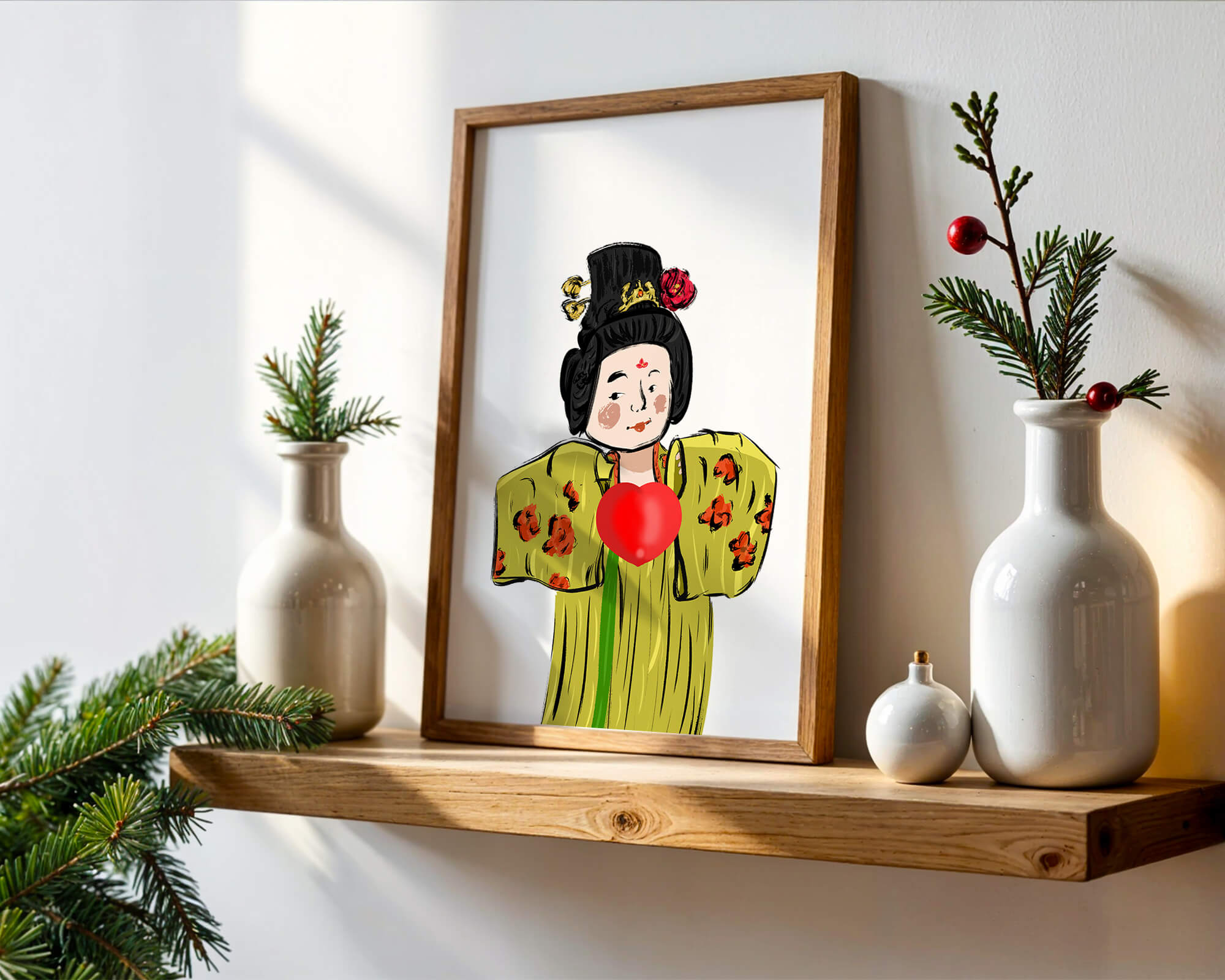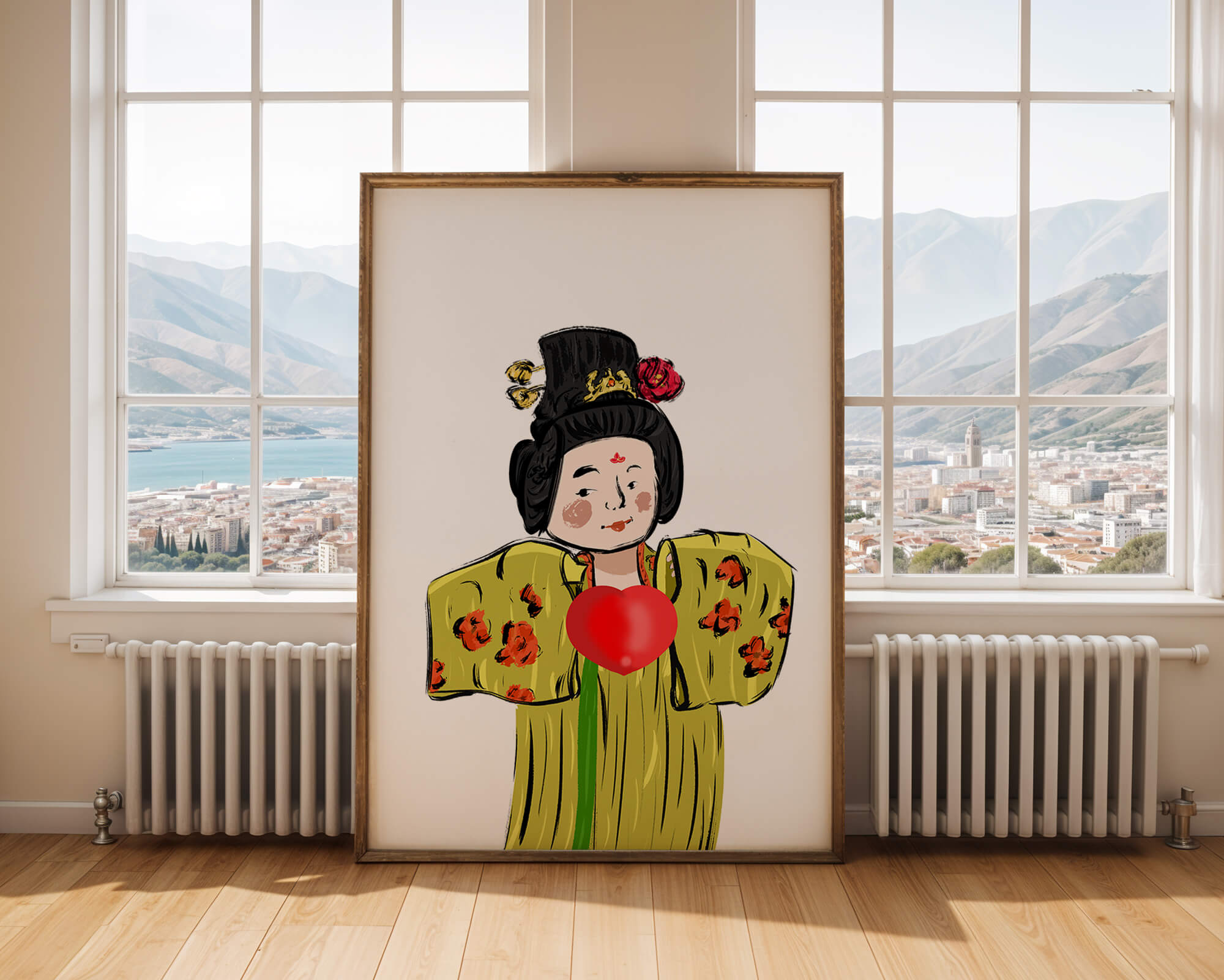The illustration showcases an intricate display of cultural themes through the attires elaborate design. The garment is adorned with a floral pattern, contributing a lively touch to the yellow fabric. This choice of colors and patterns suggests a celebration of heritage and artistic expression.The characters expression is gentle and welcoming, while the vibrant heart symbol adds an element of warmth and affection to the composition. Ideal for those appreciating cultural and artistic aesthetics, this piece exudes a sense of tradition merged with modern style, apt for various decorative settings.| Type |