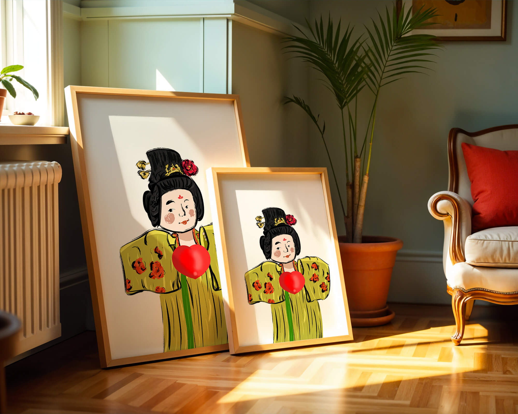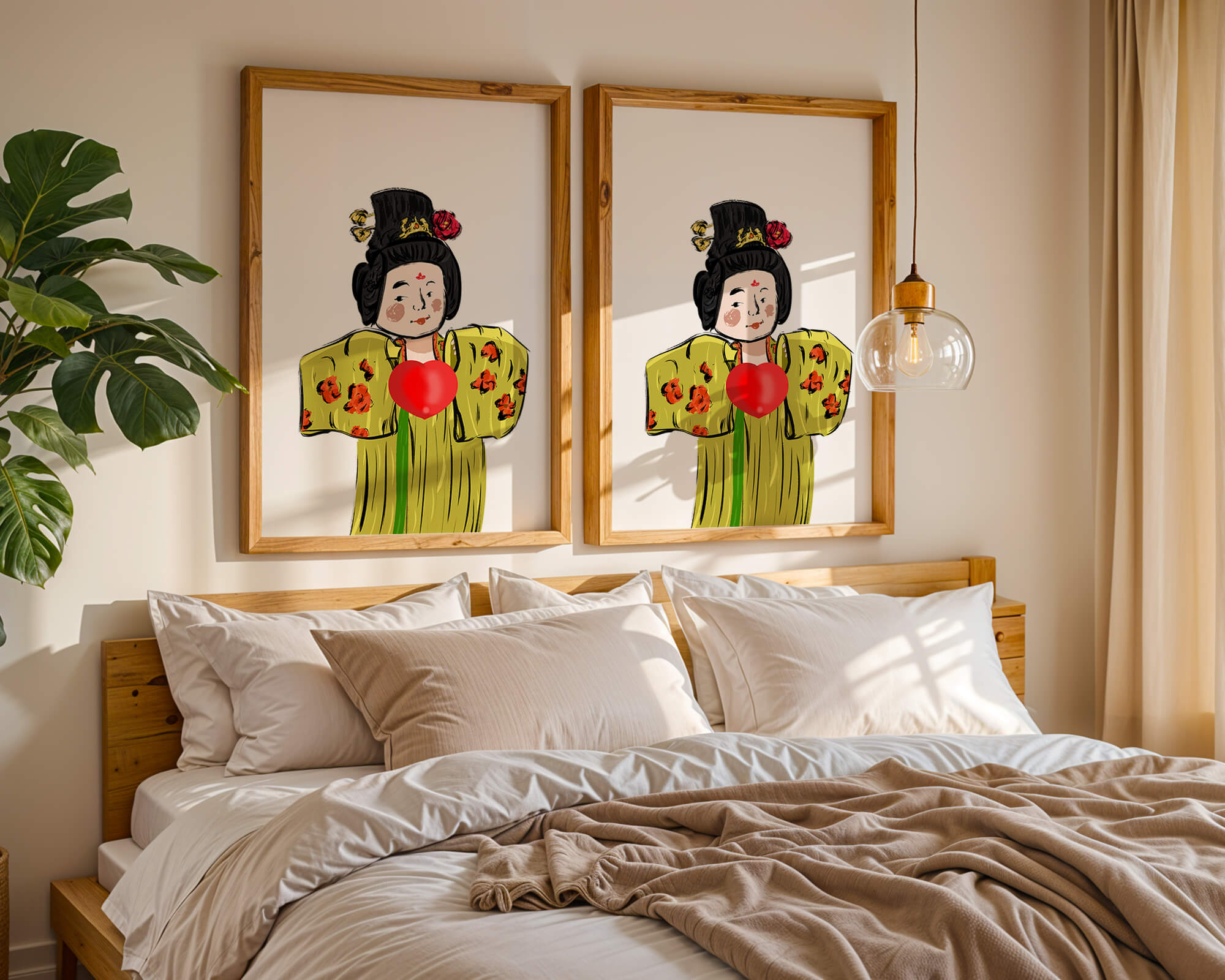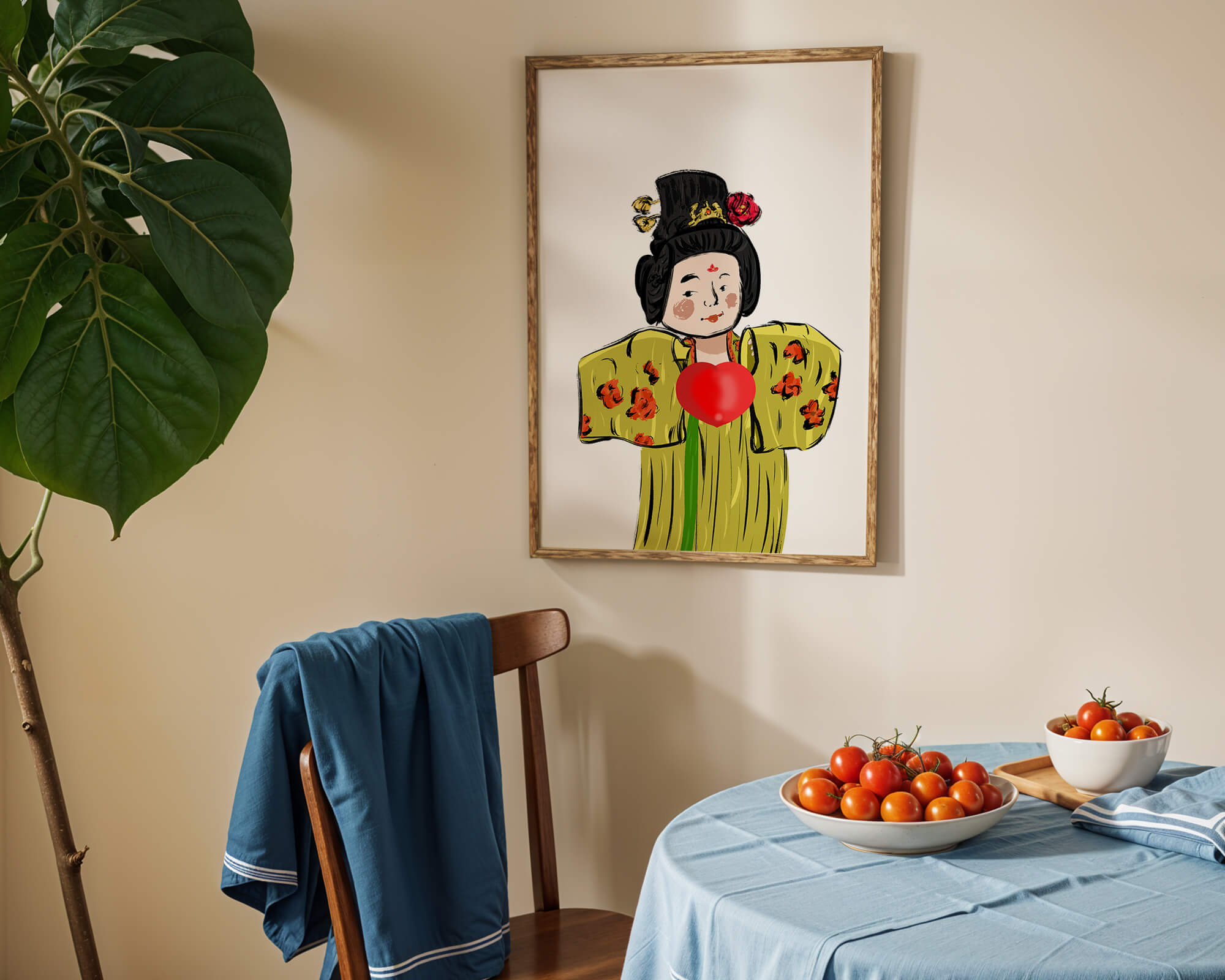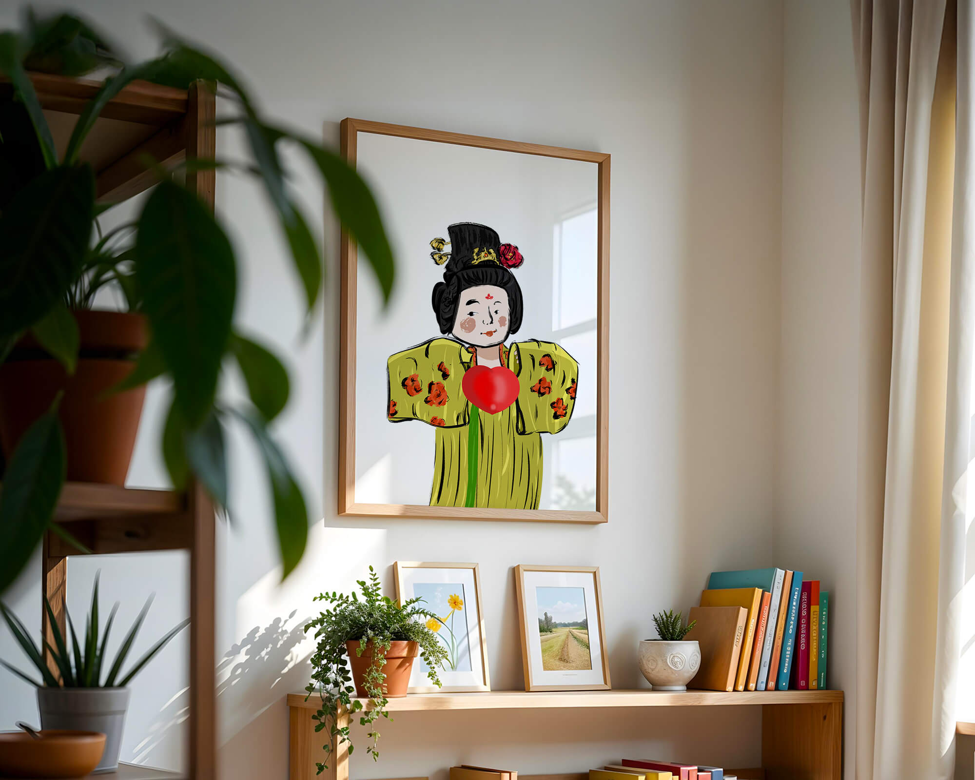 The illustration showcases an intricate display of cultural themes through the attires elaborate design. The garment is adorned with a floral pattern, contributing a lively touch to the yellow fabric. This choice of colors and patterns suggests a celebration of heritage and artistic expression.The characters expression is gentle and welcoming, while the vibrant heart symbol adds an element of warmth and affection to the composition. Ideal for those appreciating cultural and artistic aesthetics, this piece exudes a sense of tradition merged with modern style, apt for various decorative settings.| Type |