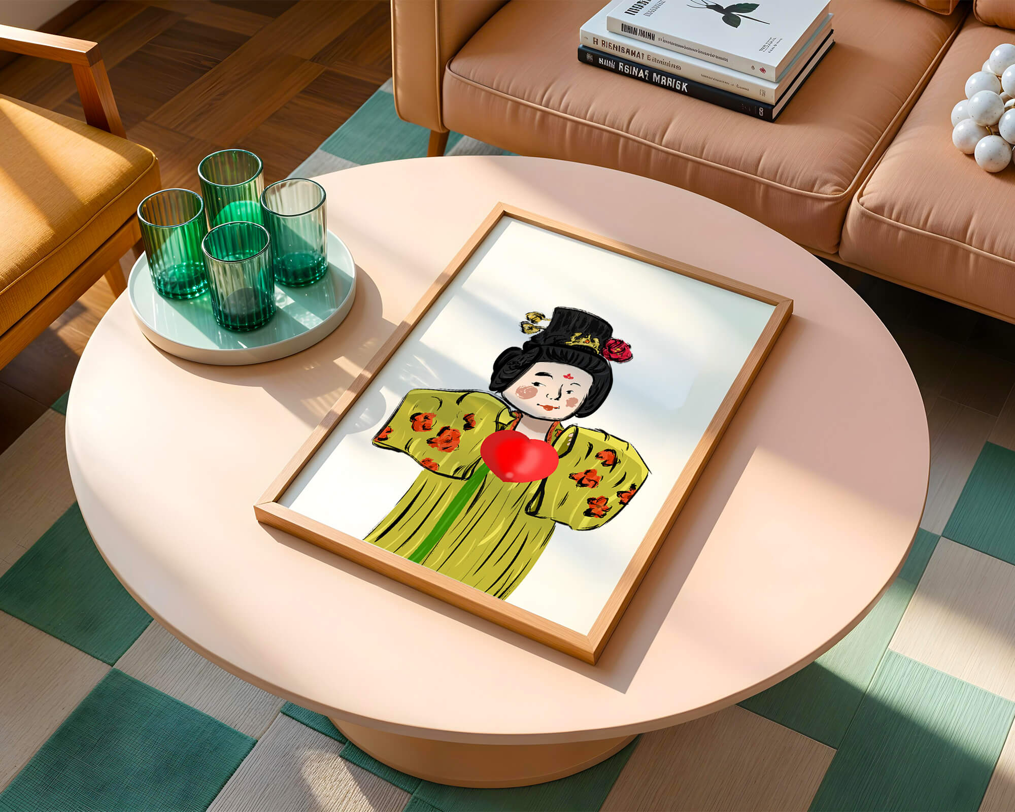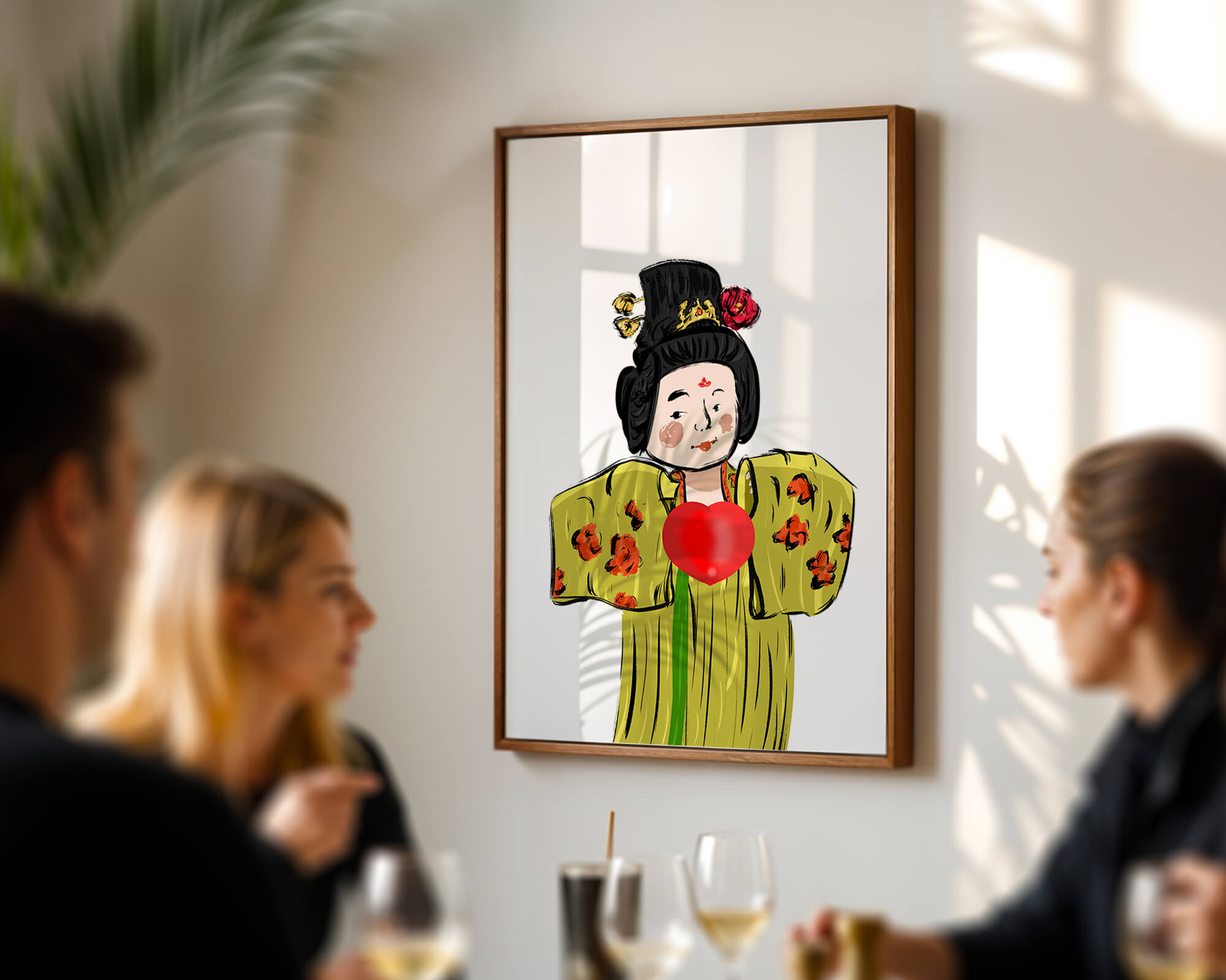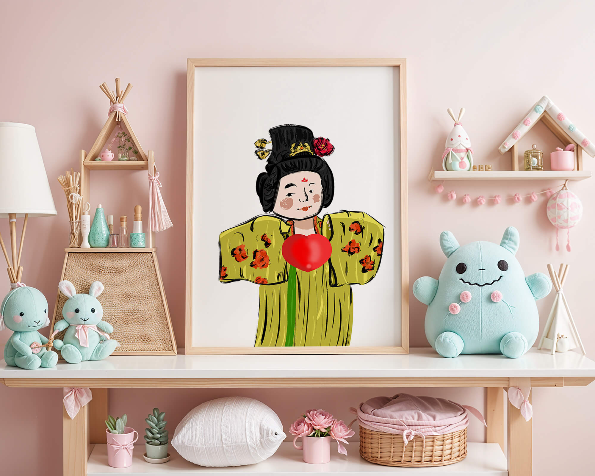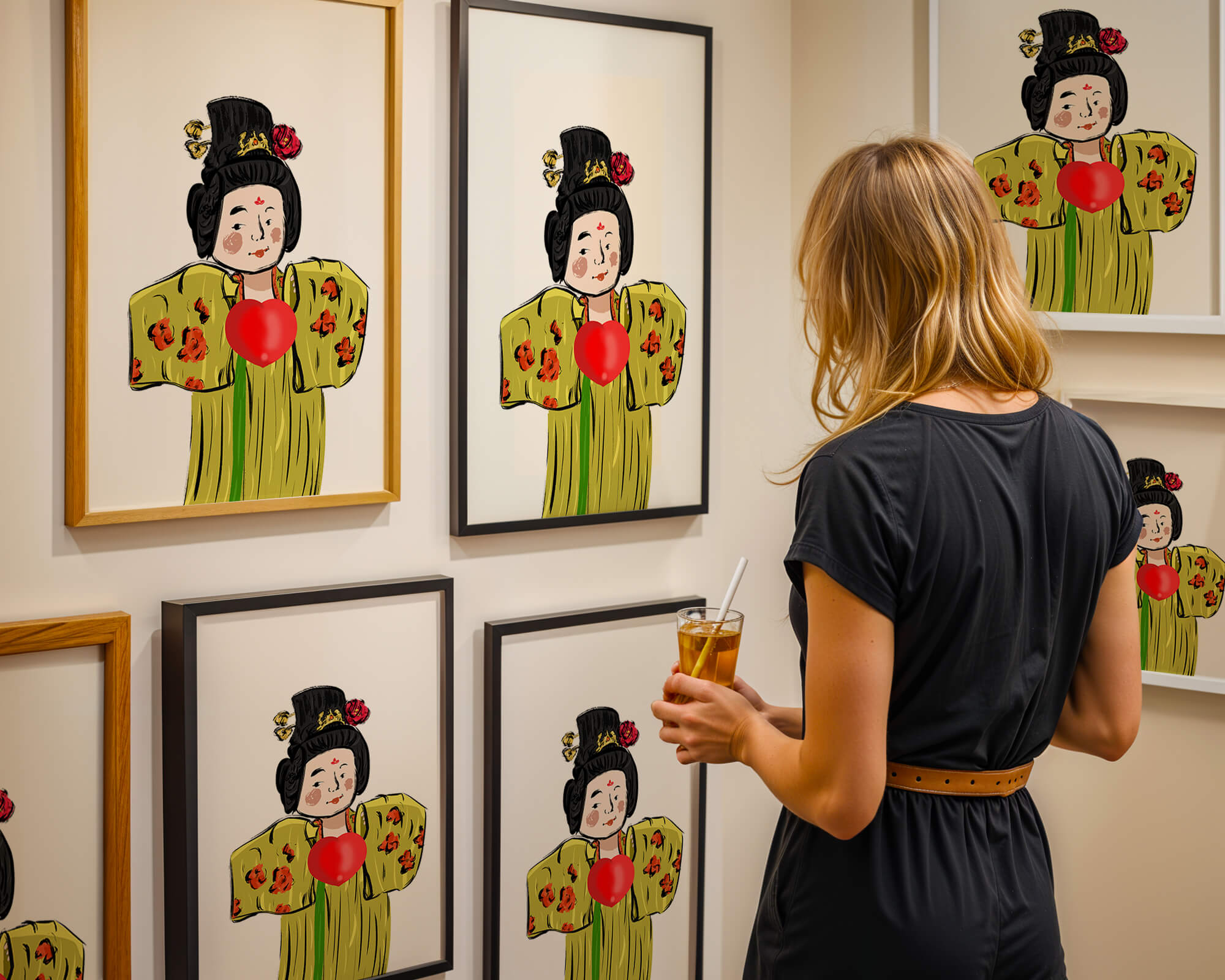 The illustration showcases an intricate display of cultural themes through the attires elaborate design. The garment is adorned with a floral pattern, contributing a lively touch to the yellow fabric. This choice of colors and patterns suggests a celebration of heritage and artistic expression.The characters expression is gentle and welcoming, while the vibrant heart symbol adds an element of warmth and affection to the composition. Ideal for those appreciating cultural and artistic aesthetics, this piece exudes a sense of tradition merged with modern style, apt for various decorative settings.| Type |