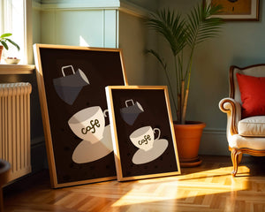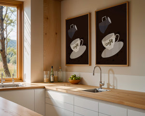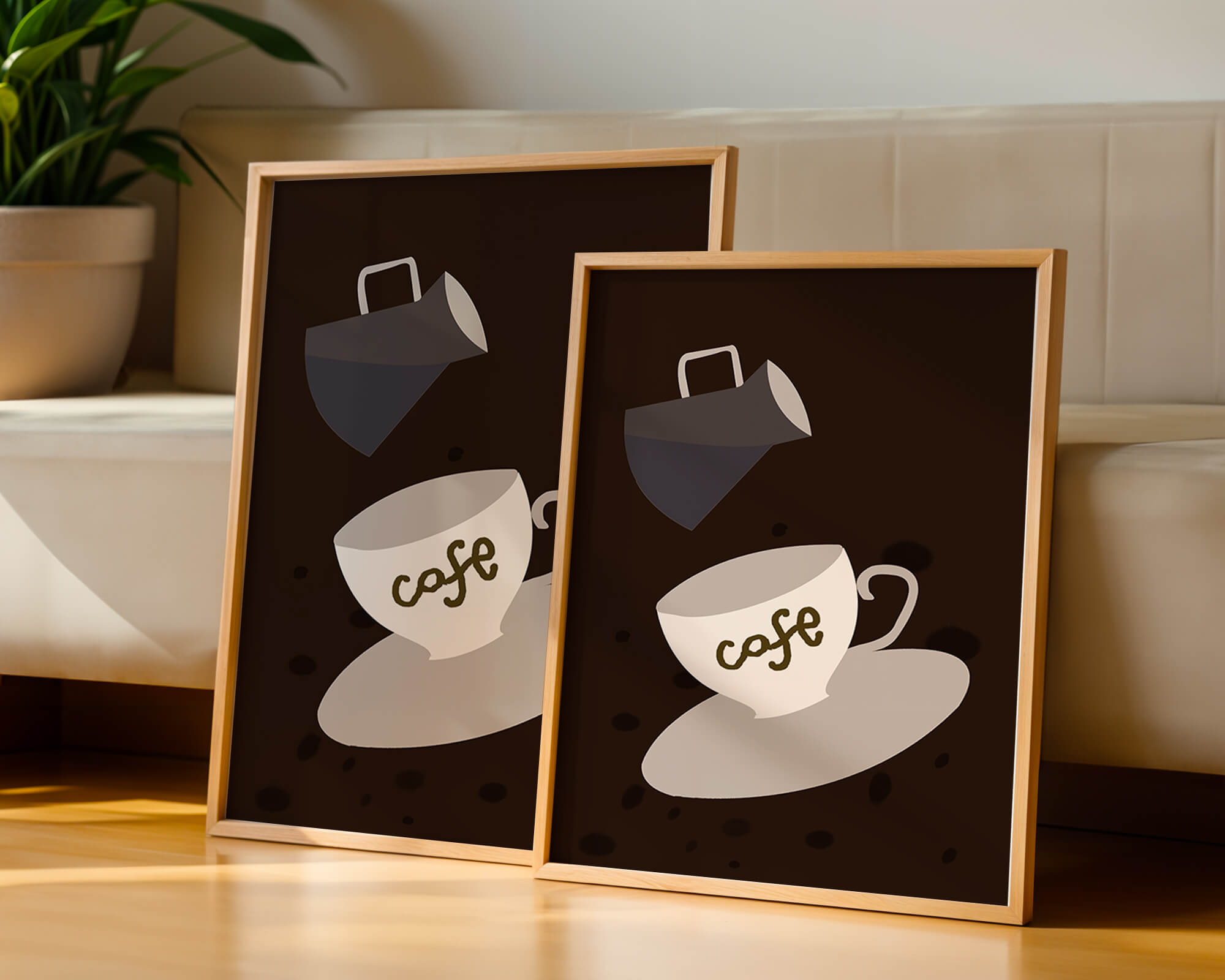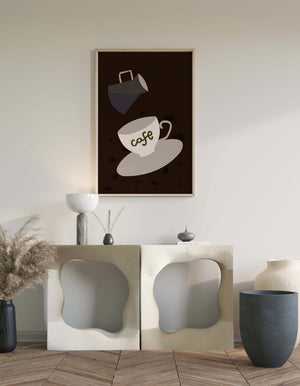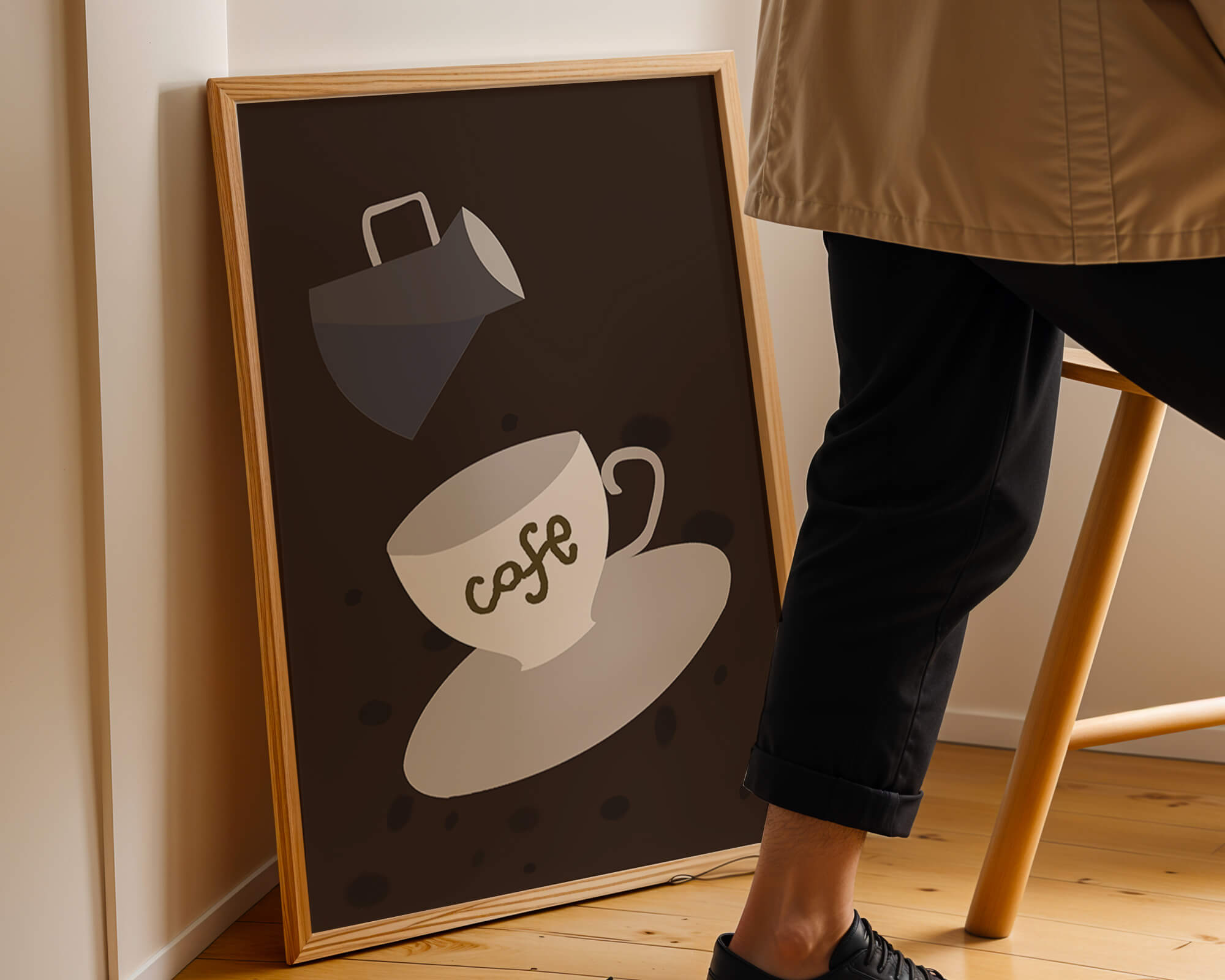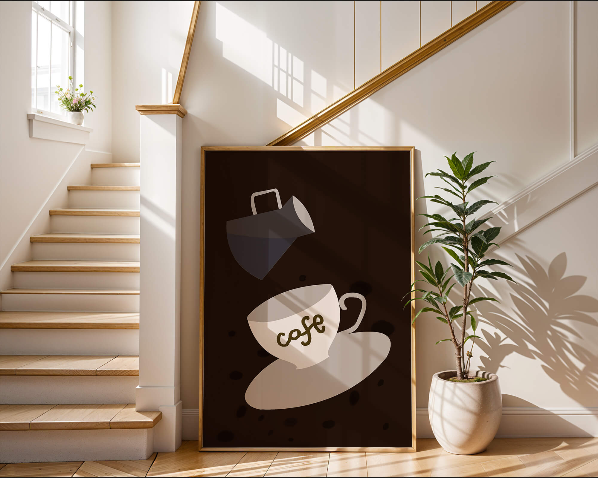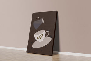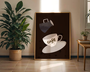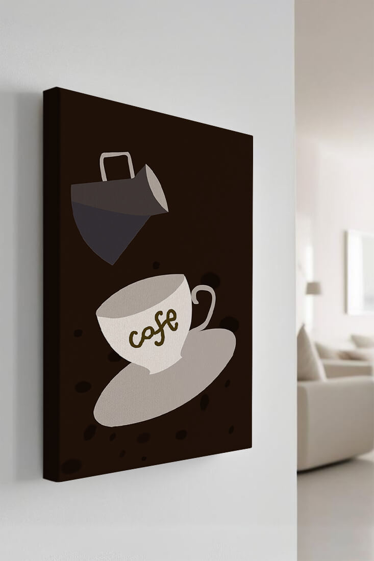 This artwork exudes a modern and simplistic charm, capturing the essence of a cozy coffee moment. The use of muted colors like brown and beige provides a warm and inviting feeling, perfect for a kitchen or dining area. The blend of the pouring pot and the cup forms an elegant depiction of a typical morning routine, offering a touch of sophistication to any space it adorns.The image resonates well in settings that value style and minimalism, making it an ideal addition to spaces like cafes or home kitchens. It reflects not only the simplicity of coffee brewing but also the elegance found in everyday objects, providing an artistic flair that elevates its surroundings.| Type |