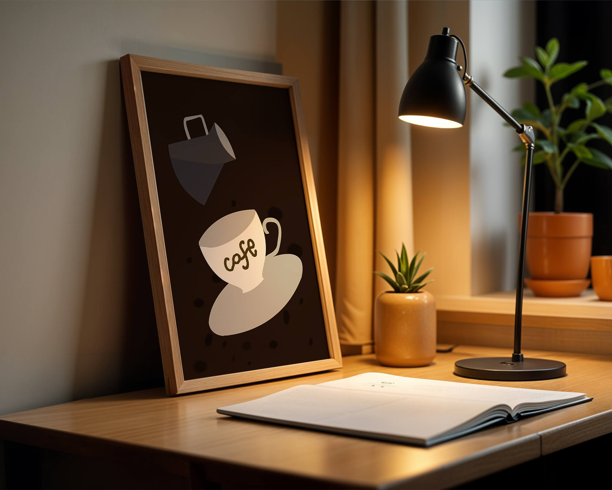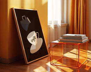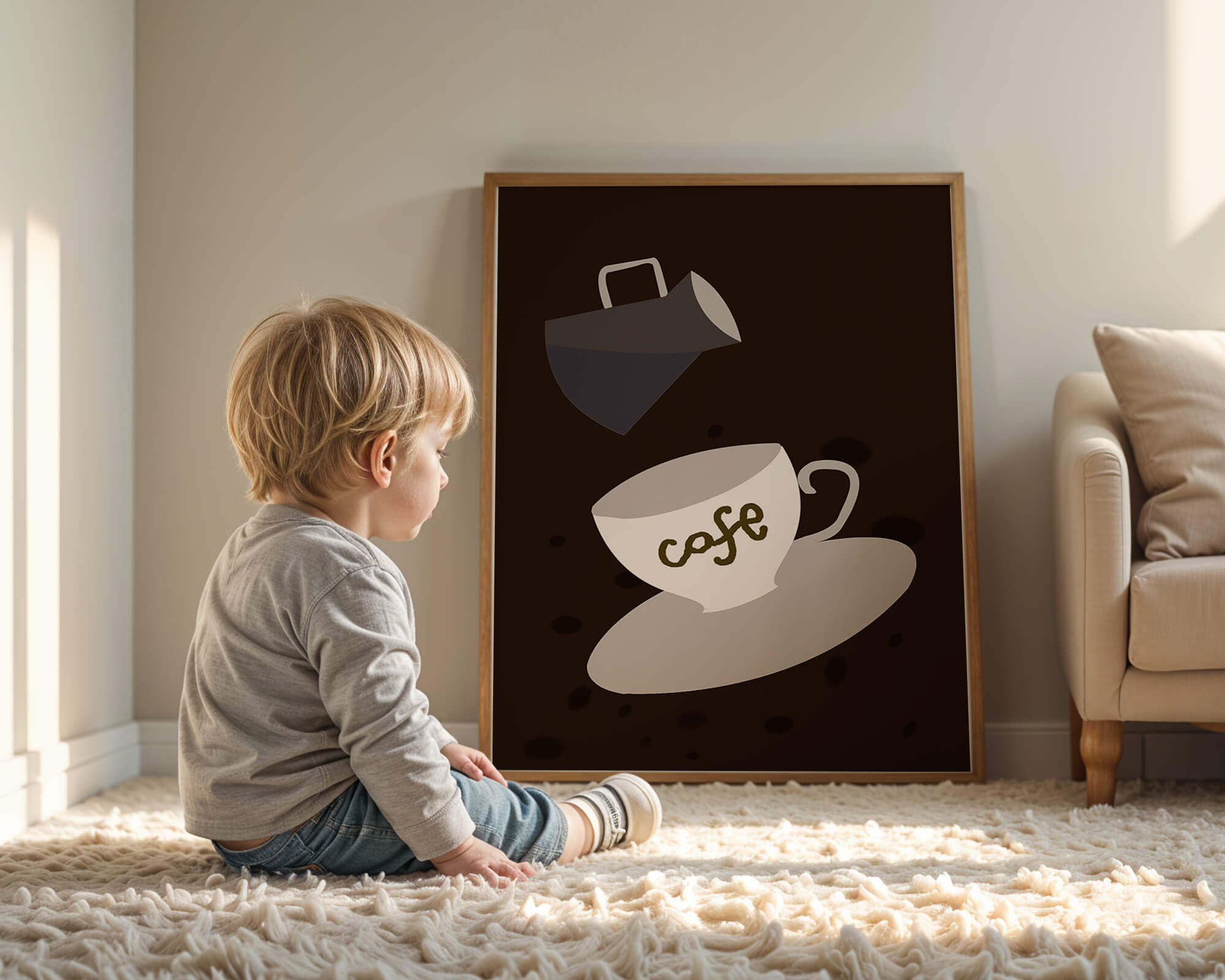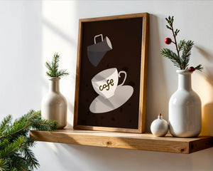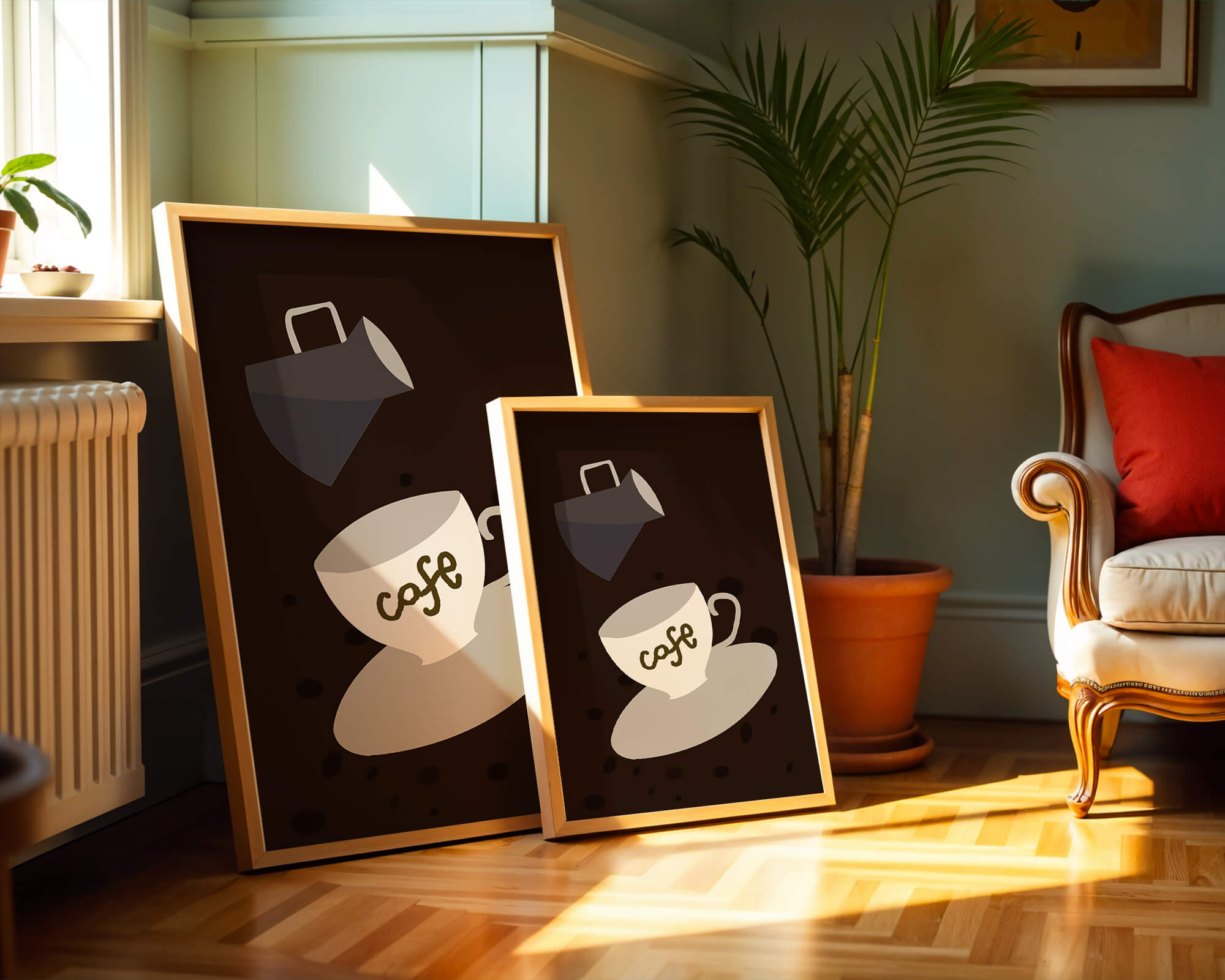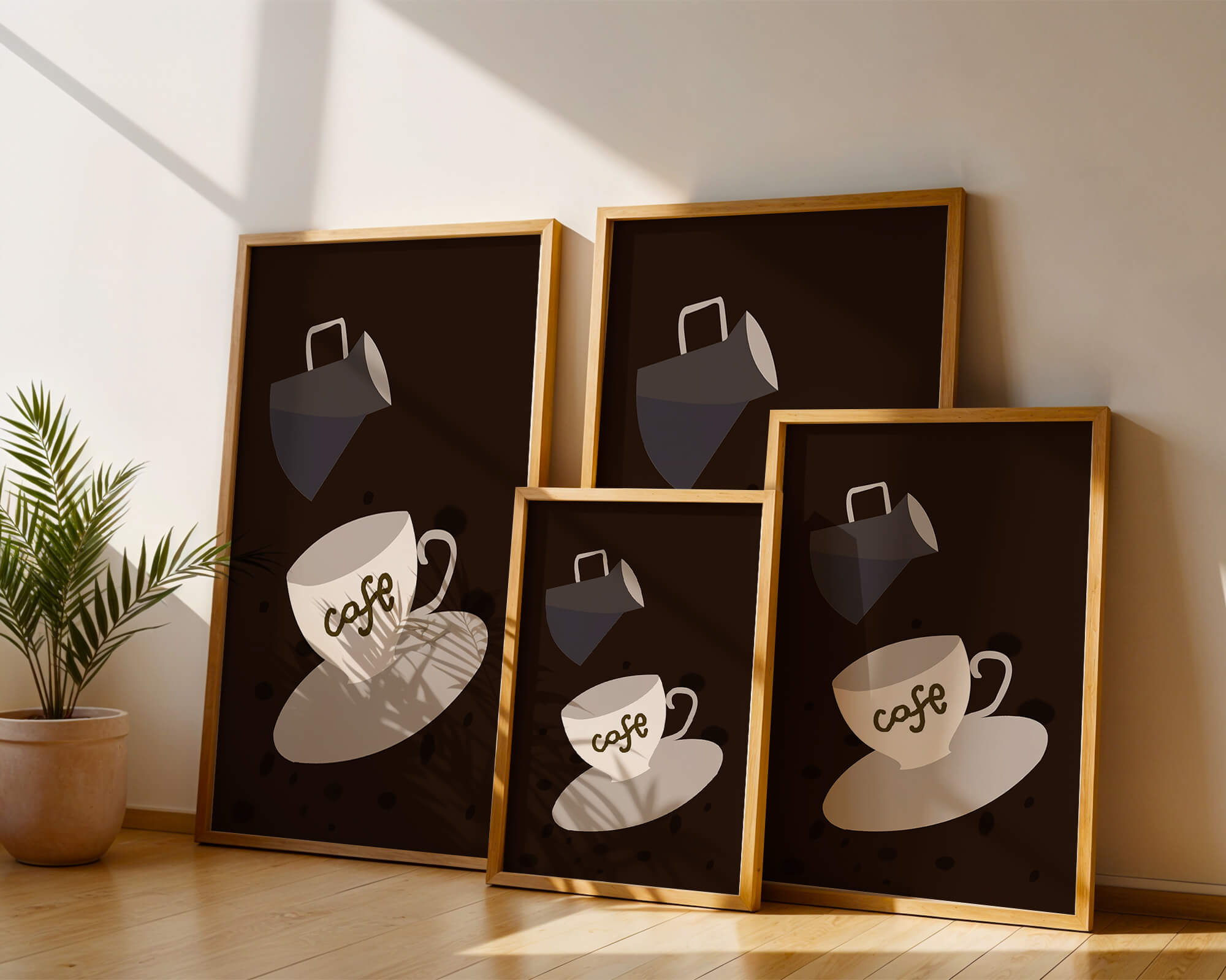This artwork exudes a modern and simplistic charm, capturing the essence of a cozy coffee moment. The use of muted colors like brown and beige provides a warm and inviting feeling, perfect for a kitchen or dining area. The blend of the pouring pot and the cup forms an elegant depiction of a typical morning routine, offering a touch of sophistication to any space it adorns.The image resonates well in settings that value style and minimalism, making it an ideal addition to spaces like cafes or home kitchens. It reflects not only the simplicity of coffee brewing but also the elegance found in everyday objects, providing an artistic flair that elevates its surroundings.| Type |