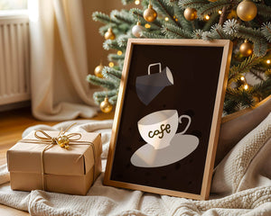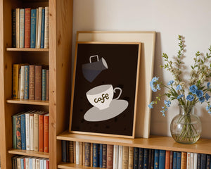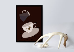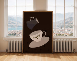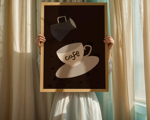 The image portrays a minimalist design of a coffee cup with the word "cafe" written on it, accompanied by a dark pot that appears to be pouring coffee. The background is a deep coffee brown, enhancing the contrast and focus on the cup and pot.