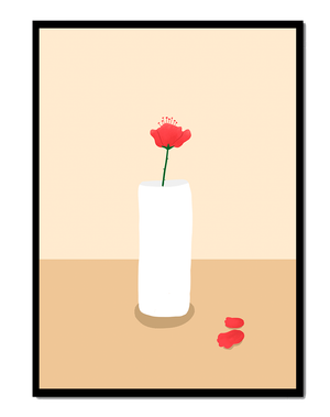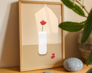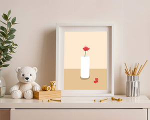 A beautiful minimalist depiction of a single red flower in a white vase set against a beige background. The simplicity of the design highlights the elegance and beauty of the single flower.