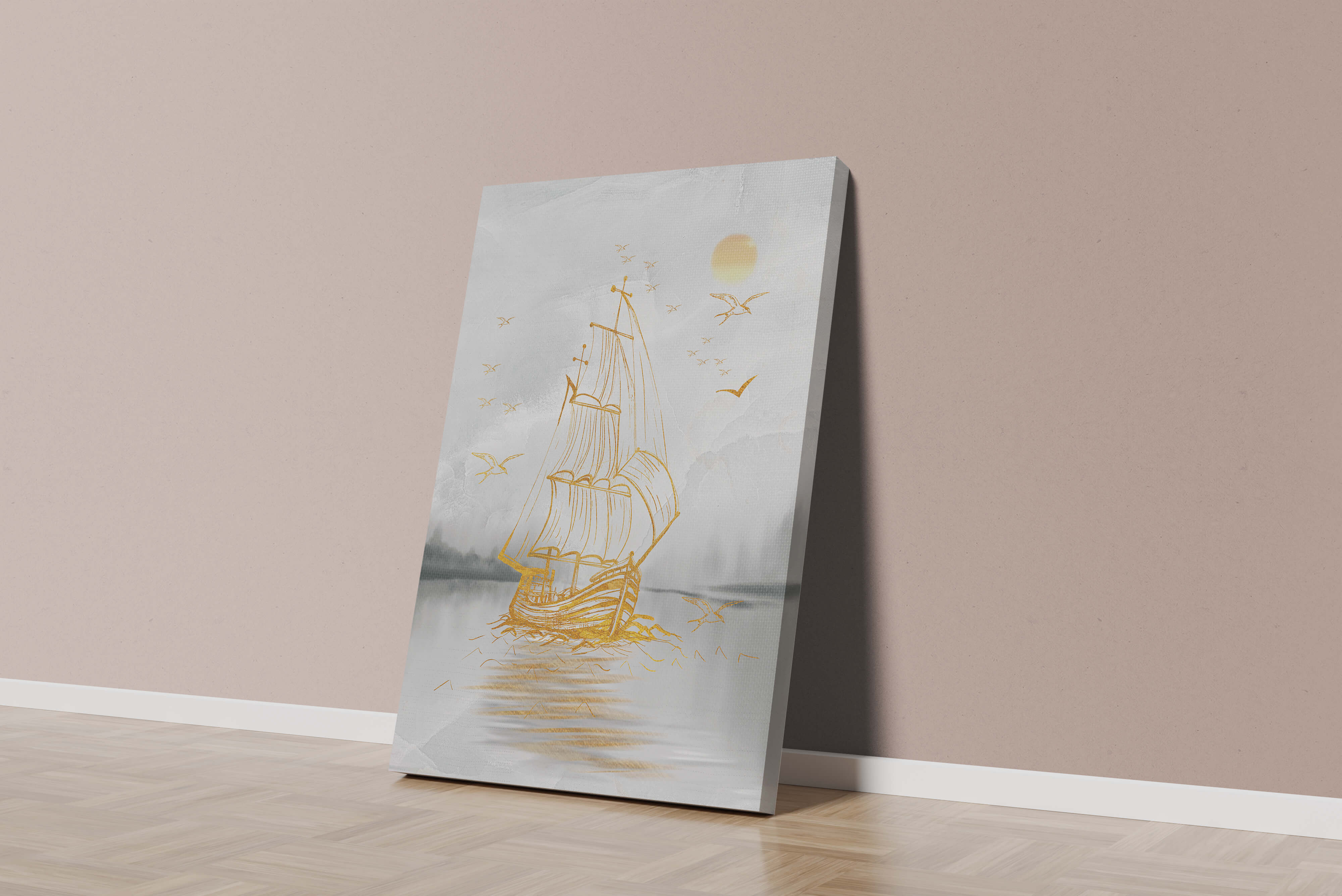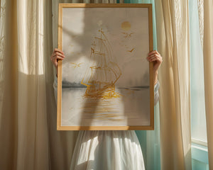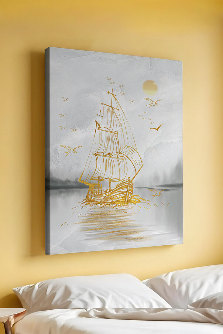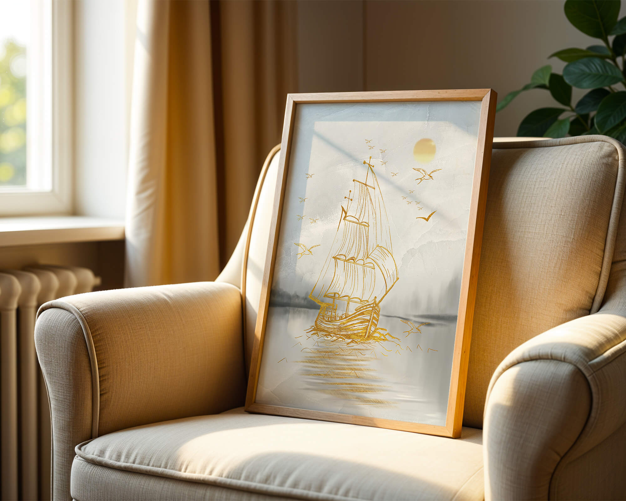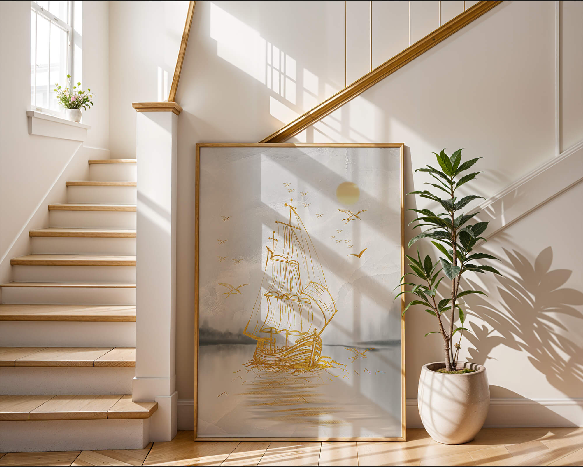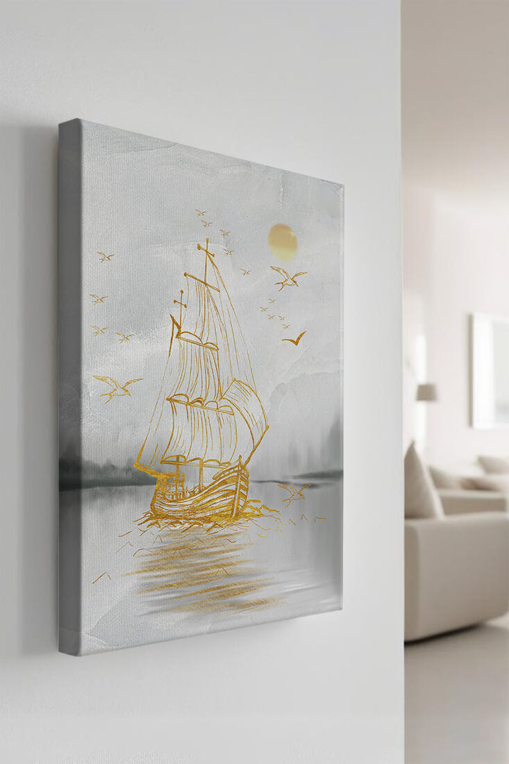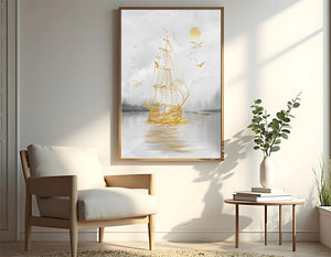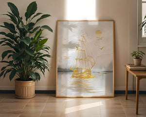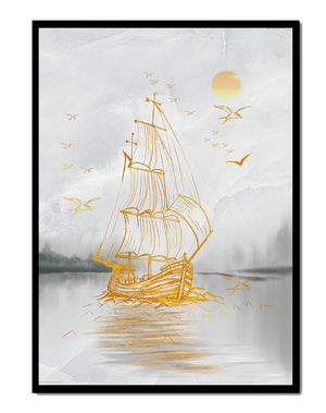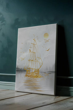 The image features a beautifully detailed sailboat rendered in gold, reflecting off the pristine surface of the ocean. The delicate balance of colors creates a harmonious blend, with the golden hues standing out against the soothing blue and green tones of the sea and sky. The sailboat, elegantly sketched, suggests movement and adventure, while the presence of birds adds a sense of freedom and exploration.This piece evokes feelings of serenity and wanderlust, making it a perfect addition to any living room, study, or office space. The nautical theme combined with the golden accents brings a touch of elegance, making it an ideal choice for those who appreciate maritime history and sophisticated decor. Whe| Type |